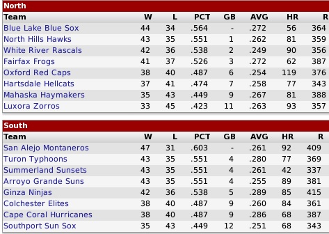 Monday, August 31, 2037 NH HAWKS FLYING HIGH IN TU NORTH In August, the reigning Pro Cup champion North Hills Hawks took charge of the Tycobbian North Division with a 17-11 record to beef up its lead to six games over the Fairfax Frogs and the Blue Lake Blue Sox... the Hawks are 8 games in front of fourth place White River and Oxford... for the month the Frogs were 16-12 and the Blue Sox a disappointing 12-16... North Hills should be able to haul in its fourth straight diivision flag and get a shot at repeating as the IPA Pro Cup titleholder.. second place is up in the air with four teams in the fight. GREAT 3-TEAM RACE IN TU SOUTH Preseason pick San Alejo has not been able to shake the tennacious Turon Typhoon and Summerland Sunsets in the Tycobbian South Division... they closed the gap in August when the Typhoons chalked up an 18-10 record and the Sunsets went 17-11... first place San Alejo leveled off to 14-14, its worst month of the season... the Montaneros are now up by only two games over Turon and three over Summerland... it should be a great finish in the TU South this season. Last edited by Eugene Church; 06-25-2013 at 08:18 PM. |