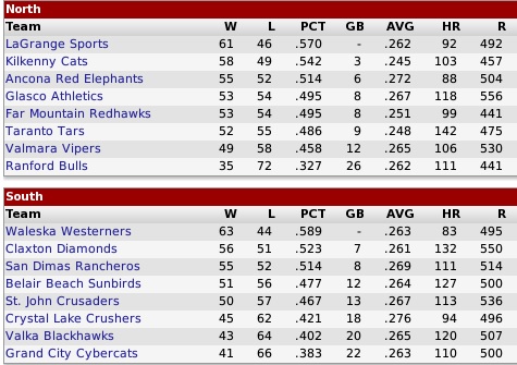 Monday, August 31, 2037 LAGRANGE-KILKENNY NAILBITER IN RU NORTH For the second successive season the LaGrange Sports and the Kilkenny Cats will go down-to-the-wire for the Ruthlandain North Division flag... the Cats had the best August with a 16-12 record, just a tare better than the Sports at 15-13... with 19 games remaining on the schedule LaGrange has a scant one-game edge... it's probably too late in the race for third place Far Mountain, 7 games out, and fourth place Glasco, 9 games off the pace. WALESKA WAY AHEAD IN RU SOUTH No contest in the Ruthlandian South... the Waleska Westerners are running away with it... they posted a sparkling 19-9 mark this month and expanded their lead to 13 games ahead of runnerup Claxton... the Diamonds dipped to 13-15 in August... the San Dimas Rancheros are 14 games back in third place, while Belair Beach is fourth and 20 games behind. Last edited by Eugene Church; 06-17-2013 at 02:25 PM. |