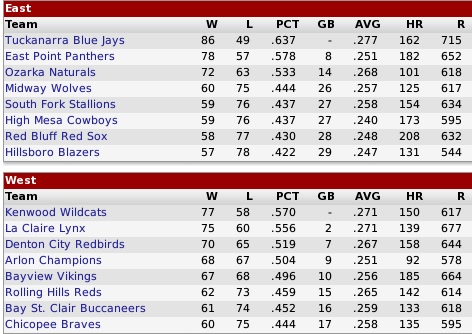 Monday, August 31, 2037 BLUE JAYS BOLT 8 GAMES AHEAD IN TU EAST The perennial powerhouse Tuckanarra Blue Jays made shambles of the Tycobbian East Division with a super 21-7 August and bolted ahead of the East Point Panthers by 8 games... it's looks like the Tucks will win the division for the fourth time in a row and get the opportunity to pick up their fourth Pro Cup in the club's history... the Blue Jays have three overall titles, having won in 2023, 2024 and 2035... second place East Point played good baseball last month, but a 16-12 was not enough... the Ozarka Naturals have third all to themselves and fourth could go to any of the other five clubs in the division. KENWOOD-LA CLAIRE CRUNCH IN TU WEST In spite of losing two starters and a slugging catcher to the injury bug this season, the Kenwood Wildcats are still number one in the Tycobbian West Division and still have the preseason-favored La Claire Lynx right on their tails... the Wildcats registered a 17-11 mark this month and bolstered the lead to two games over the Lynx, which were 16-12... Kenwood just added starter Milt Cochrane (14-10/3.59) and standout catcher Corky DiNozzo (.315 BA-20 HRs) to the DL list... they had already lost ace Freddy Gooch (11-5/3.15) in July... La Claire also lost its rookie starter Glenn Smith (9-7/3.70) to injury... he will be out at least two months... the Denton City Redbirds are in the third spot in the standings and trail by seven games... Arlon is fourth, 9 games behind... and Bayview is fifth, 10 games out... with all of Kenwood's critical mound losses, the analysts say the TU West race is a toss-up between the Wildcats and the Lynx. Last edited by Eugene Church; 06-25-2013 at 07:21 PM. |