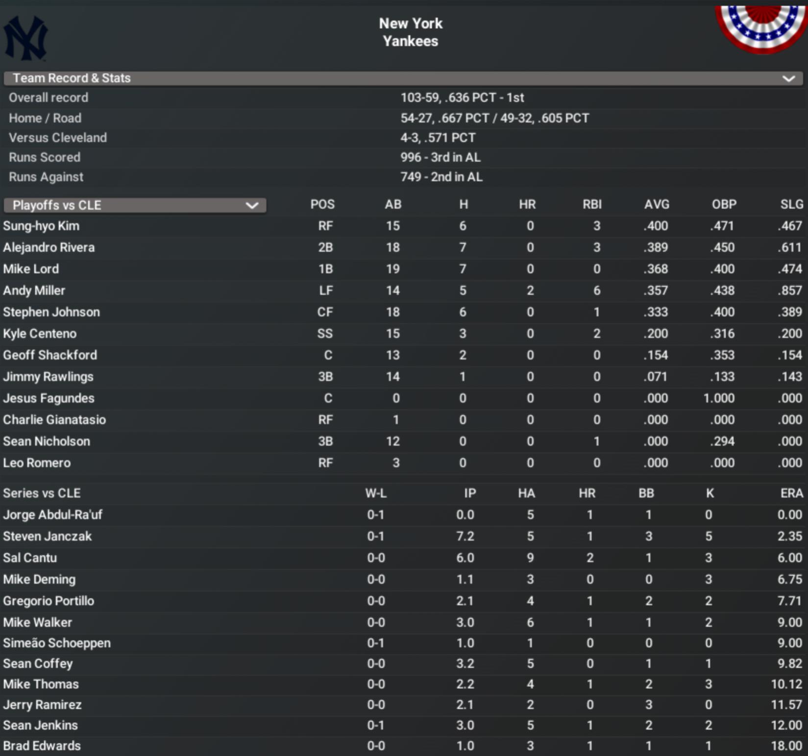 1919 1920 1923 1924 Mike: Chris, this wasn’t a series — this was a massacre! The Yankees came in as the number one seed in the American League, the big bad Bronx Bombers, and they got absolutely humiliated! Swept right outta the ballpark by Cleveland — 4 games to none! Mad Dog: EMBARRASSING, MIKE! EMBARRASSING! The Yankees should be ashamed of themselves! You win 100+ games, you’re the top seed, and you go out there and play like that? I mean, my goodness — they were never in it! Mike: Every single game, Cleveland came out swinging. They out-hit them, out-pitched them, out-hustled them — every category! Nine to three in the clincher! It wasn’t even close. Mad Dog: The Indians — FOUR pennants in six years, Mike! Four in six! And now they’re goin’ for their third World Series title in that span! That’s a dynasty, Mike! A DYNASTY! Mike: And how about Ryan Phipps, the series MVP — hitting .714, getting on base eight outta ten times, doubles, homers, you name it. The Yankees couldn’t retire him if they used a fishing net! Mad Dog: He was unbelievable! You could throw him a bowling ball, he’d hit it off the wall! Meanwhile, what do the Yankees got? Nothing! Rawlings can’t field, Nicholson can’t hit, the bullpen’s a disaster! Jenkins, Coffey, Thomas — a parade of mediocrity! Mike: And let’s be honest, Chris — this wasn’t even competitive. The Yankees were lucky to score three runs in that final game. Cleveland controlled it from the first inning on. Mad Dog: And Mike, let’s not forget — this is the same Cleveland team that spanked the Yankees last year in the ALCS! Four games to one! That’s eight wins to one over two postseasons! The Indians own them! Mike: They absolutely own them. The Yankees can’t solve this team. Fernandez, Satiago, Eneki — these guys are monsters. They just grind you down. Mad Dog: They don’t beat you — they bury you! They hit the ball hard, they run the bases, they play defense. The Yankees looked like they were waiting for the season to end! Mike: So now, Cleveland moves on to the World Series, waiting on the Milwaukee–Arizona winner. And Chris, whoever it is — they better bring their A-game, because right now, nobody’s hotter than Cleveland. Mad Dog: I’ll tell ya, Mike — they’re a machine. A freight train. You don’t wanna be standing on those tracks when they come through! Mike: No question. Yankees go home, Cleveland marches on. The road to a third championship goes right through Jacobs Field. Mad Dog: And the Yankees? They better do some soul-searching, Mike. Because this — this was ugly. |