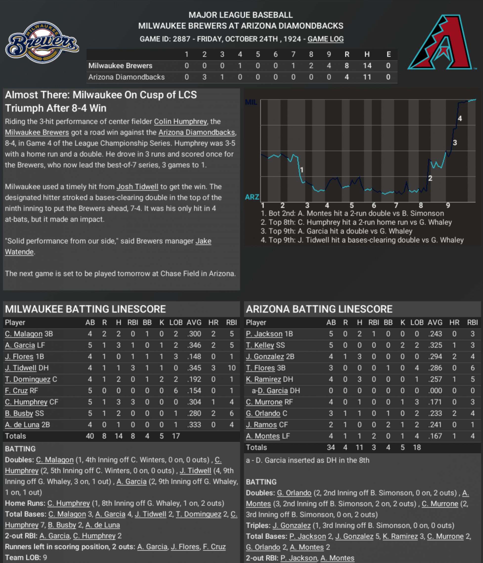 1904 1909 1924 MAJOR LEAGUE BASEBALL ON BNN ARIZONA DIAMONDBACKS vs. MILWAUKEE BREWERS October 27, 1924 — American Family Field, Milwaukee Tonight, beneath clear skies and a brisk October wind in Milwaukee, the Brewers captured their third National League pennant — and their first in fifteen years. For a franchise that has long carried both the burden of expectation and the beauty of hope, this night was nothing short of cathartic. The final score: Milwaukee 3, Arizona 2. The series: Brewers 4, Diamondbacks 2. The Brew Crew now stands on the doorstep of baseball immortality — four wins away from their first World Series championship. Center fielder Colin Humphrey earned series MVP honors, hitting .333 with timely power and steady defense. But ask Humphrey, and he’ll tell you he never once checked the numbers: “I wasn’t thinking about stats — just about helping the team win.” A modest thought, perfectly suited to October baseball. Joe Caudill was tonight’s pitching craftsman — seven strong innings, two earned runs, and the calm resolve of a veteran who’s seen it all. Jared Clay closed the door with six electric outs, sealing the triumph before a sold-out, shivering crowd of 48,043. Yet if there was a single heartbeat to this game, it belonged to Antonio de Luna — the quiet second baseman whose bat spoke louder than words. In the bottom of the seventh, his line-drive double tied the game at two. And in the bottom of the ninth, with one out and a man aboard, de Luna delivered again — a crisp single to center that sent Milwaukee to the World Series. The Diamondbacks, resilient and dangerous to the end, could only tip their caps. Their run ends here, but not without pride. And so, the stage is set for the World Series: The Milwaukee Brewers — proud, persistent, and now believers — will face the Cleveland Indians, who swept the Yankees aside with ruthless efficiency, four games to none. The Brewers will hold home-field advantage. The Indians bring momentum, swagger, and the aura of a team chasing history. Two proud clubs. One championship dream. This is October. This is Major League Baseball. |