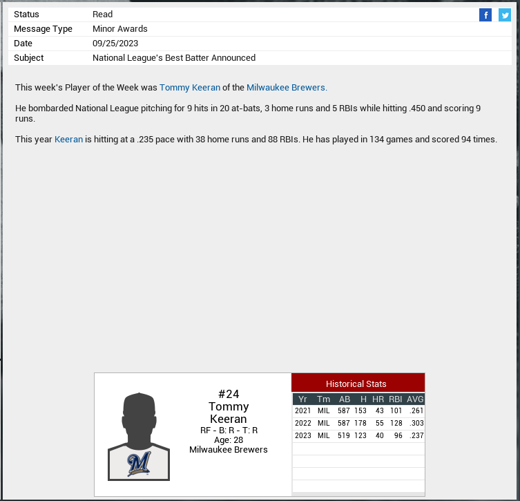 Notes: King's injury plagued season ends early due to a hammy. Marks tosses a No No against Seattle. Long and Keeran get POW awards. Sharpe gets POM. King has a setback. Staples wins NL batting crown. |