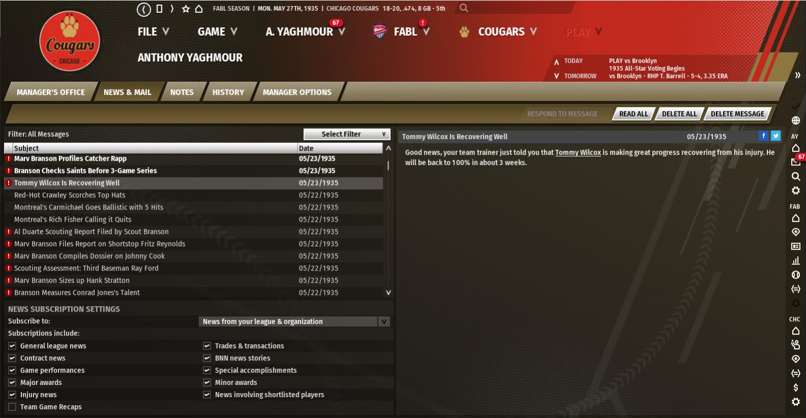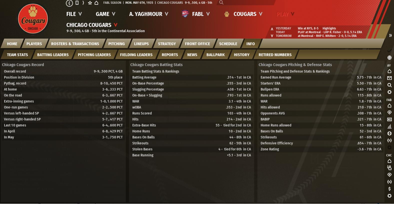 Seasonal Record: 26-27 (6th, 9.5 GB) Stars of the Week Lou Kelly : 30 AB, 10 H, 2 HR, 8 RBI, .333 AVG, 1.108 OPS Bill Ashbaugh : 18 AB, 7 H, 2 HR, 4 RBI, .389 AVG, 1.373 OPS Dick Luedtke : 2 Wins, 18.0 IP, 3 BB, 7 K, 1.50 ERA Weekly Schedule 6-3: Win vs Wolves (3-8) 6-4: Loss vs Foresters (11-0) 6-5: Win vs Foresters (3-6) 6-6: Win vs Foresters (3-5) 6-7: Win at Wolves (6-5) 6-7: Win at Wolves (1-0) 6-8: Loss at Wolves (1-5) 6-9: Loss at Wolves (1-6) Summary It was a busy week with more games then days, but with a four game win streak in the middle, this might have been our best week of the season. After avoiding the sweep at the hands of the Wolves, our old buddy Dean Astle tossed a 5-hit shutout and the Foresters destroyed us 11-0 to start the series. Lucky for us, the pitching settled down and former Forester Wayne Robinson allowed just 3 in the second game and Dick Lyons and Bill Kline 3 in the finale as we took both. Just after hosting the Wolves, we had to head north of the border for four games in three days. The double header went well, as in the opener Johnny Walker pieced together his third straight start with three earned runs, all coming in the last three innings. Game two was even better, as Dick Leudtke showed signs of his former self. He allowed just 5 hits and a walk with two punchouts in a complete game victory. We scored just a single run, coming in the second off a Leudtke RBI double. He pretty much was the only one who played in the game, going 3-for-4 at the plate. Unfortunately, since he didn't hit in either of the final two games, we didn't win either of those. We managed just one run in the 18 innings, including a 3-hit, 3 strikeout shutout by Chick Wirtz in the finale. Looking Ahead For the first time in 11 months, all world pitcher Tommy Wilcox will toe the rubber with a Chicago Cougar jersey proudly on his back. As bluntly as I could possibly be, we really missed Tommy Wilcox. When Wilcox went out last year, we had a team ERA of 4.08 and the starter's 4.32. It ended up 4.38 and 4.57. Not the biggest jump, but take a look at 1935: 5.35 and 5.25. Yikes... Unless Tommy pitches like he did with us in 1932, there's no way he can do any worse. To make sure his arm doesn't break, I will be using a six man rotation at least one time through, but he'll pitch our first game of the week against the Stars on Tuesday. We'll face the 21-33 Stars four times in New York, possibly missing ace Lou Martino who's scheduled to start Monday. He's the only Star with a sub 5 ERA, and the back three are all above six. In our rotation, just Dick Lyons has a lower ERA then anyone other then Martino (although Leudtke and Robinson come close to Gene Stevens). The Stars offense is actually really good, ranking top 4 in a variety of offensive categories. They still have star caliber players in Pete Layton and John Lawson, but behind him, there is not too much left in the lineup. Dave Trowbridge has started to slow down and shortstop Bill Rich is enduring a dreadful season at the plate. After the Stars we stay in New York and head to Brooklyn for four with the Kings. Depending how things shake out, we could have round six of Barrell vs Wilcox on June 10th, but we're almost guaranteed to see Barrell, Mike Murphy, and Joe Shaffner in this series. At 35-17, the Kings are building their lead in the CA with the next closest (Cleveland) five and a half out. Despite the struggles of recent acquisition Frank Vance, the Kings have continued to cruise due to the power of their offense. Al Wheeler, however, has surged and hit 9 CA homers since the trade with a 208 OPS+. I really wish I went harder for him, but the Dynamos also wanted to move Frank Vance who I did not have room for. I have zero expectations for this week, as all I care about is Tommy Wilcox. After nearly a year of hoping he'd be able to pitch again, he now can finally pick up a baseball. I don't care if he gives up 0 runs or 30 runs. I don't care if we win six or lose six. I just care that he's able to pick up a ball against next week. And the week after. And the week after that. Yes, I know. I'm far too excited for a string of ones and zeros to be able to throw simulated pitches again. But it's Tommy Wilcox! In his last 54 starts, he was arguably the best pitcher in the entire FABL. Although now the scouting report is tormenting me: "Wilcox may be an overlooked ace, able to take the bats out of opposing hitters' hands. If he can stay healthy, he should be able to pitch deep into games." Batters I think Joe Masters is broken beyond repair. Ranked the 16th best first basemen in the FABL and hitting .197/.234/.338 (42 OPS+) in arguably the most hitter friendly park in baseball, the almost 36-year-old Masters is making me regret ever getting him. I never really wanted him, but the Chiefs insisted he was part of a Dave Rankin trade (who I really wanted) so I gave up more prospects then I wanted to. I thought it couldn't hurt adding a guy hitting .315/.380/.478 (151 OPS+) with 11 homers and 61 RBI's in 69 games. He hit a league average line with us to end the year, and now everything has just crumbled. I'd be ready to give up on him if Leo Mitchell was hitting a bit better in AAA, but Masters will still be given the shot to hit out of it. He's going to be pushed into a platoon with Jake Moore for now, but I think I'll make sure Moore gets two starts this week. Some more Lou Kelly and Doc Love praise this week: Doc Love added another homer and is the first CA hitter to reach 10 on the season. He's slashing .348/.384/.555 (133 OPS+) with 43 RBI's. He's trailing just Lou Kelly for RBI's, as Kelly has drove in 52 Cougars already. Kelly hit just .333 this week, but he hit two homers and drove in eight. He's a homer behind Love now, but his .429 average still paces Harry Barrell by a wide margin. If it wasn't for the aforementioned Barrell's stellar defense, Kelly's 3.3 WAR would be a full point higher then any other CA player. Instead, it's second