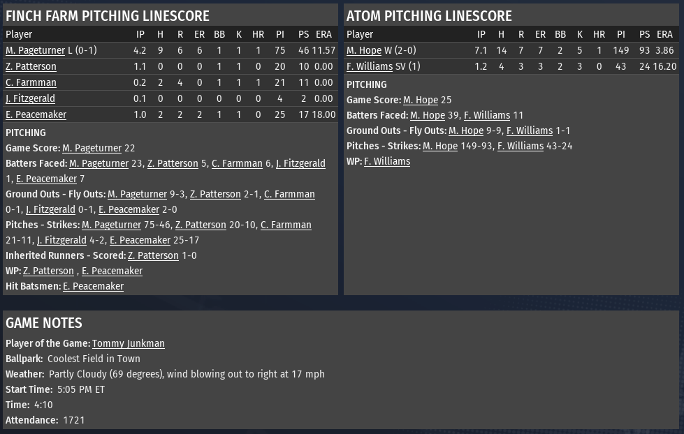 Week 2 is one through three games at higher-seed teams #7 The Slog Ghouls (32-29) vs #4 Abernathy Adamantium (36-24) - Presented by DCR DCR Predictions: Game 1 - Abernathy Game 2 - The Slog Game 3 - Abernathy Game 4 - Abernathy #8 Atom Cats (32-29) vs #3 Finch Farm Four Leafs (37-23) - Presented by WRVR WRVR Predictions: Game 1 - Atom Game 2 - Atom Game 3 - Finch Farm Game 4 - Finch Farm Game 5 - Atom