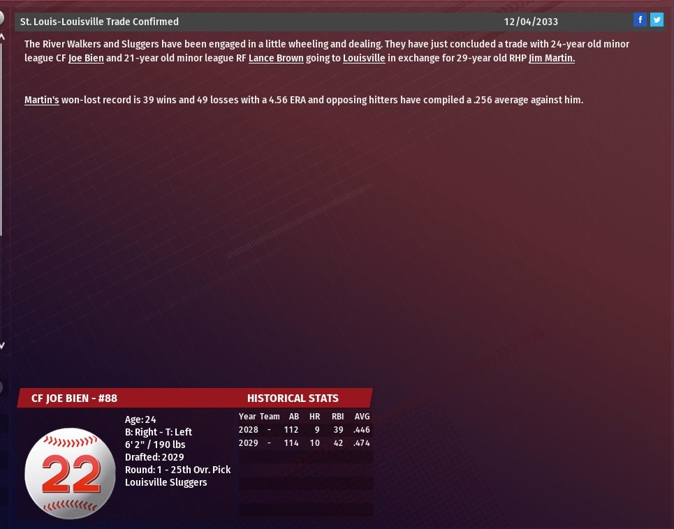 The 29-year-old Martin went 16-10 with a 3.50 ERA for the Sluggers last season in 33 starts. For his career, Martin is 39-49 with a 4.56 ERA in 161 games/135 starts. A first-round draft pick in the 2029 draft, Bien spent the 2033 season between AAA Memphis and AA Springfield. For the Redbirds, he hit .321 with one homer and nine RBIs in 26 games. At Springfield, Bien played in 31 games batting .281 with four homers and 31 RBIs. In his minor-league career, Bien has played in 556 games batting .303 with 37 homers and 63 RBIs. A 17th-round draft pick in the 2031 draft, Brown spent the 2033 season at Class A Johnson City, where he hit .218 with eight homers and 26 RBIs in 39 games. In his minor league career, Brown is a .357 hitter with 38 homers and 147 RBIs in 135 games. |