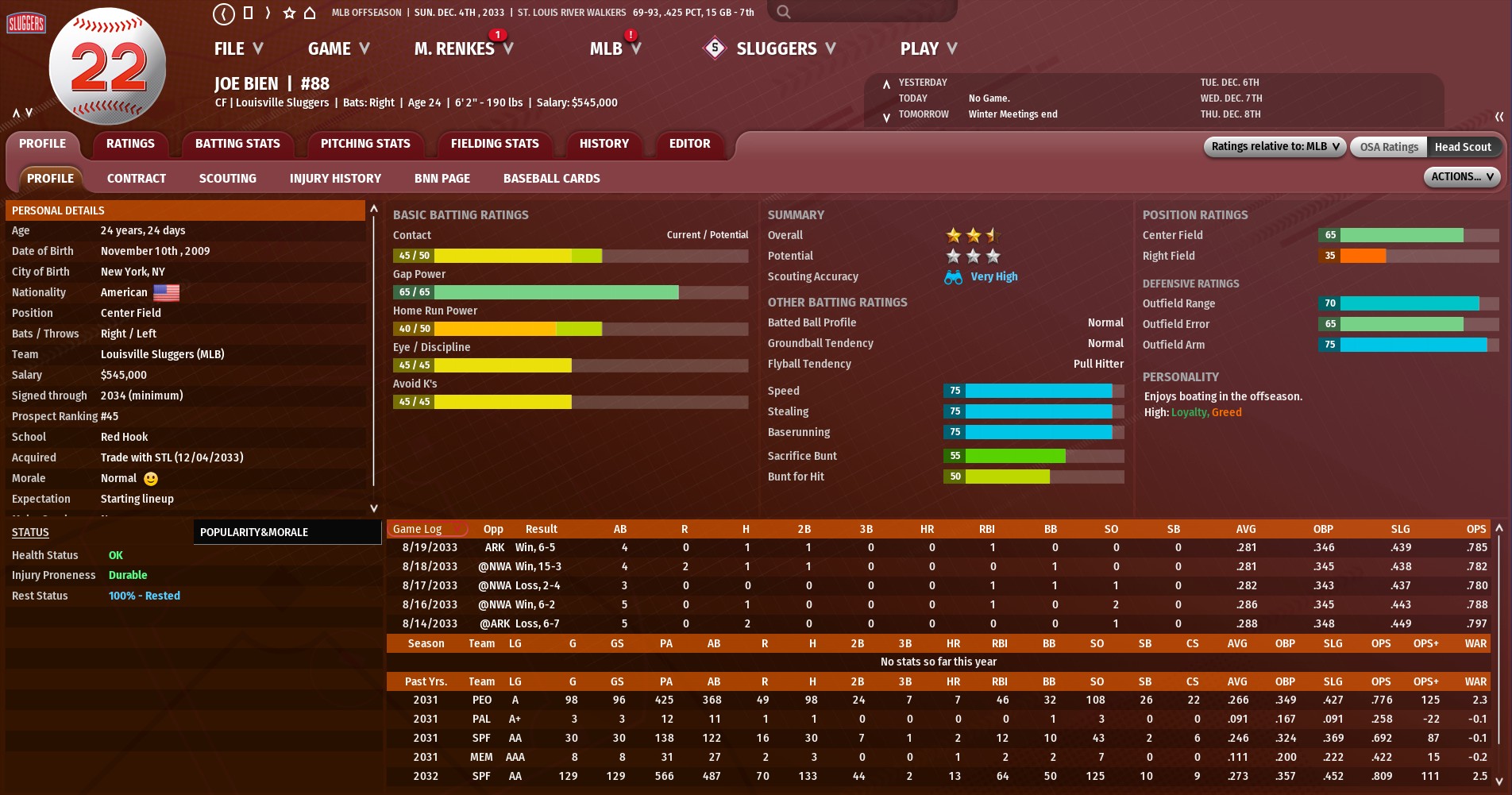 I will resume using a backup that dated back to Sept. 1, 2033. I simmed out the rest of the season, to the date where the game crashed. However, the original version where I played every game will stand as the official end of the 2033 season. In the new simulation, Dayton and Cedar Rapids, the two teams which made the World Series, with Dayton prevailing, didn't even make the playoffs. The final four rather was Cleveland, Grand Rapids, Rockford and Quad City. Grand Rapids defeat Rockford, 4-3 in the World Series. The Walkers ended their regular season 69-93, rather than 70-92. Hopefully, no major injuries that will derail careers or minor league player development, this does not mess things up too bad moving forward. Last edited by rink23; 06-18-2021 at 01:53 AM. |
