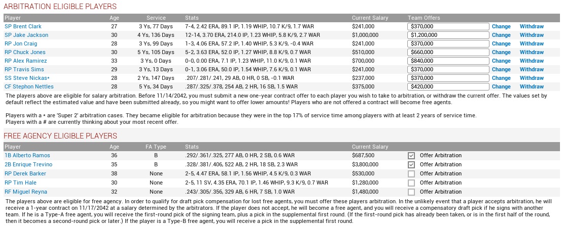 Nick Valdes basically kept the Raccoons poor by only granting a marginal increase for the budget from $39M to $39.5M for the 2043 season, but then again the Coons also started out with remarkably few financial commitments and a big budget space, but we’d get to that in time. Only one team had a budget over $50M for the new season, which was the Wolves, freshly re-ringed, with a $52M allowance from their own scroogey owner. They were followed by the Canadiens ($49M), and Blue Sox, Condors, Capitals (all $46.5M) to complete the top 5. There was a whole host of teams in the $45M range, and the Raccoons dropped from a tie for 15th place to a tie for 18th place with the Warriors (last year: the Buffos), just inches above the red zone. Said red zone with the five poorest teams contained the Loggers ($38M), Gold Sox ($37.5M), Aces ($36M), Rebels ($35M), and Indians ($27M). Thus the gap between the Raccoons and the richest team was just the same as the drop from the Raccoons to the poorest team. The average budget for a team in the league rose to $41.79M, rising $560k compared to 2042. For the very first time, the 24 teams would have a combined $1B to blow on playing baseball. The median budget was $41.75M, up a hefty $1.5M from last season. Those muffins are great, Maud! You should do more baking! – What do you mean, Nick, they are barely league average?? – YOU are barely league average!! – (hissing contest restarts, now with bits of muffins being ejected from snouts and all over the room) +++ It would be an unusual offseason – the Raccoons would have money, and probably no real opportunity to spend it in a way that would make any sense. And then there was the need to make hard decisions, and make them better than last time, which got us to the free agency and arbitration board right away. [Board in original form below.] The Raccoons had five upcoming free agents (having traded a few expiring contracts in July already), and would only make a token effort for one of them, and it was neither Berto nor Cosmo. Both were listed as type B free agents, and while we loved ourselves a good draft pick compensation around here, Berto had already used that door to sneak back in once before. And everybody loves Berto, but let’s be honest – he’s washed up. He has no position, he lost his speed, he’s got a huge bum, and the Raccoons had to look towards the future and not – (black googly eyes start to take on water) Would Cosmo accept an offer of arbitration? That was a tough one. He was 35, and knowing the league, could probably still squeeze out another 4-year deal this time, although his defense was starting to sag and his speed was already diminished. The Raccoons again had to look towards the future – the position was already assigned to Arturo Carreno going forwards, and this time we had to be sure to not take on another not-so-well-aged veteran for another year. And thus, neither Cosmo nor Berto would be offered arbitration…! And it broke my little fuzzy heart. Derek Barker, filler right-hander and 38 years old, and Miguel Reyna, fourth outfielder with a muddled 2-year stint with the team, would not be back, either. The only player we talked to was Tim Hale, but Tim Hale, who had two and a half pitches and had never excelled as a starter, had it in his head that he should be in the rotation and should make starter’s money. While the Raccoons had money to blow it on white elephants and a ******* parade, they also had a farm full of starting pitching prospects, and expected to add from that farm to the big league club at regular intervals in the next year or two or three. Nope, the money would go towards a fine free agent position player or two (or three). On the arbitration side there were starters Brent Clark (that still sounded weird) and Jake Jackson, as well as relievers Jon Craig (a special brand of crummy), Chuck Jones (fine specialist), Alex Ramirez (who missed almost all of ’42 on the DL), and Travis Sims (hack!). For position players, only red flag replacement Steve Nickas and the highly erratic and irritating Stephon Nettles were eligible. They would all get offers – while in a year where the Raccoons would try to compete and lack the dosh to do so we’d readily non-tender the last three players here just to save that million bucks and turn it into something actually more useful than a door knob on a cat’s back. We could still try to lose them on waivers later on. Before October was out, the Raccoons signed 1-year extensions with Jones ($640k), Craig ($365k), Ramirez ($815k), Nettles ($400k), and Nickas ($300k). The exception was Brent Clark, on whom the Raccoons would take a reasonable gamble that the starting pitcher thing would actually work out, and offered him a 4-year deal (buying out one year of free agency) for a flat $4M. Clark accepted – probably reasoning that if the starting pitcher thing actually work out, he’d only be 31 at the end of the deal and could still get a big deal, and if it didn’t, he was one of the better-paid seventh/eighth inning relievers in the league. Even with that modest deal, Clark stood to be the fifth-biggest earner on the roster at the end of October, behind Manny Fernandez ($2.5M), Jesus Maldonado ($2.2M), Jeff Kilmer ($2M), and whatever Jake Jackson would make, which would be just over $1M (his 2042 salary). +++ October 27 – The Raccoons acquire 33-yr old right-hander MR Seth Green (12-13, 4.64 ERA, 1 SV) from the Titans in exchange for former top 10 prospect LF/RF Sandy Casaus (.149, 0 HR, 8 RBI). November 7 – The Crusaders get 30-yr old LF/RF John Davis (.267, 6 HR, 122 RBI) from the Pacifics for 25-yr old 2B Sergio Pena (.286, 3 HR, 62 RBI). November 12 – The Pacifics add SP Justin Kaiser (38-53, 4.31 ERA) from the Rebels in exchange for five prospects, none of them ranked higher than #133 1B/LF/RF Raul Ramirez. +++ Not sure what soured me most on Sandy Casaus. He never hit in AAA, so I never expected him to 