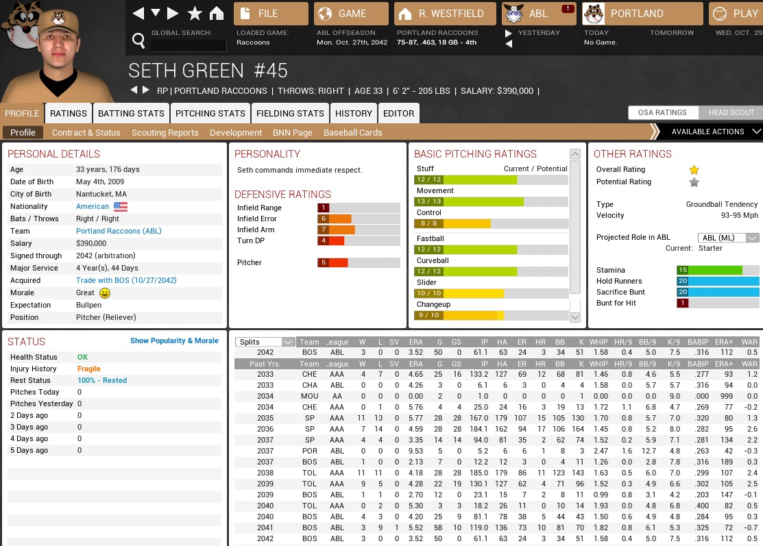 (looks over to Cristiano) I shouldn't have said that out loud, should I? - (Cristiano shakes head) - No, I shouldn't have... +++ Three days into the winter meetings, the Scorpions GM pulled me to the side. He offered up Melvin Lucero, a now 25-year-old right-hander that the Raccoons had included in the deal for Troy Greenway five years back. Lucero had made his debut in the pen in 2041, but had migrated to the rotation last season. He was a groundballer with a fine 3-pitch mix. Stamina was not his strong suit, so he had only lasted 5.9 innings per start, but had pitched to a 12-11 record and 3.25 ERA with 2.3 BB/9 and 6.6 K/9. Something was fishy here! Well, the Scorpions basically wanted to multiply their fortunes, asking for two pitching prospects back, #14 Tony Negrete and #40 Generos de Leon. Both were very young – 21 for de Leon and Negrete would not even be that old until April – and had grinded their faces on AAA and AA, respectively, and Negrete had not been helped by undergoing surgery to remove bone chips from his elbow in June, which had ended his season. Lucero, the #16 pick in the 2036 draft, looked like a really, really good pitcher for many years to come – even with the stamina impediment considered. +++ December 2 – After spending all of his 14 major league seasons with the Capitals, C Nate Evans (.309, 155 HR, 1,040 RBI) signs a 3-yr, $12.72M contract with the Stars. December 3 – The Knights add ex-PIT CL Antonio Prieto (40-34, 3.38 ERA, 50 SV) on a 3-yr, $7.2M deal. December 4 – The Cyclones snatch 38-year-old veteran CL Josh Boles (69-81, 2.97 ERA, 499 SV), who spent the last three years with the Canadiens, for 2-yr, $5.2M. December 4 – CL Reliever of the Year, ex-TIJ CL Phil Harrington (221-74, 2.10 ERA, 131 SV), inks a 1-yr, $1.52M contract with the Stars. Harrington also won nine Pitcher of the Year titles in his younger years as the game’s foremost starting pitcher. December 5 – After a year split between the Raccoons and Bayhawks, RF/1B/LF Carlos Cortes (.297, 155 HR, 753 RBI) hooks up with the Titans. The 32-year-old will make $9.76M over four years. December 5 – Ex-POR/LVA SP Rich Willett (141-99, 3.05 ERA) inks a 2-yr, $8.08M deal with the Miners. December 6 – The Raccoons sign 33-year-old SS/RF/3B Jose Castro (.277, 142 HR, 660 RBI), last with the Scorpions, to a $625k contract for the 2043 season. December 7 – The Rebels acquire SP Chris Crowell (89-77, 3.49 ERA) from the Aces, who receive three prospects. December 7 – San Francisco picks up OF/1B Scott Martin (.290, 71 HR, 403 RBI) from the Condors for C Mark Pasko (.279, 1 HR, 18 RBI) and a prospect. December 9 – 30-year-old SS Rick Rowell (.263, 53 HR, 291 RBI) is traded from the Miners to the Thunder, along with a pile of cash, for MR Dan Minelli (17-20, 4.36 ERA, 2 SV) and a prospect. December 10 – Denver acquires C/1B David Pinedo (.248, 11 HR, 72 RBI) from the Warriors for two prospects, including #36 SP Alfonso Velez. +++ Of course you may buy me another drink, Scorpions GM! You’re lovely, by the way. And kind. And- And… And the drinks you buy make me feel kinda bssssssss….