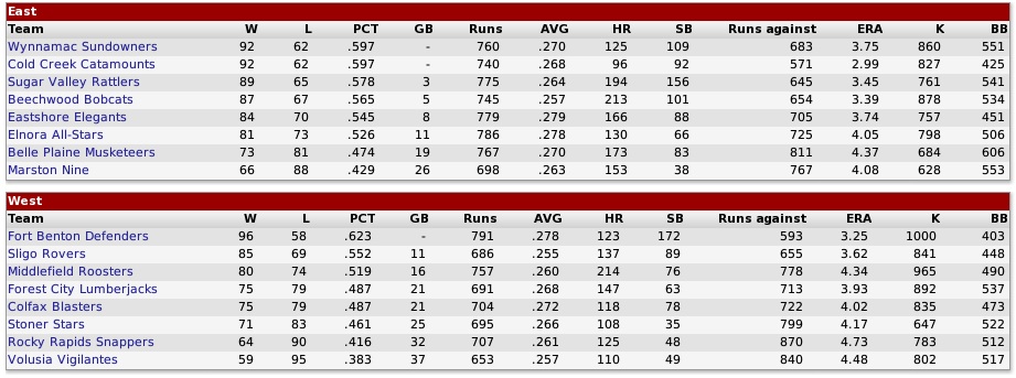 The Ruthlandian East is shaping up to be another grand pennant race this year with the defending division winner Cold Creek going at it with upstart Wynnamac in a razor-thin battle... Sugar Valley and Beechwood could be in the mix as well... don't completely count out Eastshore and Elnora... six clubs in the IPA's toughest division could have winning records. Over in the RU West Division it looks like it will be an easy win this year for the Fort Benton Defenders... Sligo and Middlefield will be distant challengers. |