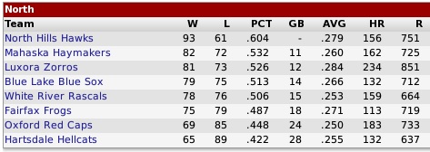 In the Ruthlandian East race powerful Sugar Valley has built up a solid 5-game lead over the Beechwood Bobcats at midseason... preseason favorite Cold Creek has played well, but so far it hasn't come close to matching the Rattlers' blistering pace... the Catamounts have fallen behind by 9 games, which may be too much to make up... highly-thought of Wynnamac is languishing in seventh place, 16 games off the pace... it looks like a two-team contest between Sugar Valley and Beechwood, two offensive juggernauts. Out in the RU West Divsion the number-one pick Fort Benton has its hands full with the Sligo Rovers... the Defenders are tied with them at the All-Star break... Volusia and Middlefield are within reach, but not likely to challenge this year... the outlook is a close finish between two very evenly-matched teams... it might be too close to call... the Rovers' home-run power could be the difference maker. Last edited by Eugene Church; 08-01-2013 at 09:28 PM. |