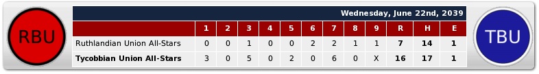 Wednesday, June 22, 2039 TYCOBBIA STARS TROUNCES RUTHLANIA 16-7 In the highest-scoring All-Star Game in history the Tycobbian Stars trounced Ruthlandia 16-7, pounding them for 17 hits... the TU All-Stars scored the most runs ever in the series and the two teams combined for a new record as well. Tycobbia set the old mark with a 14-6 victory in 2008... 23 runs is the new record for both teams, topping the old mark of 20, also established in 2008... Tycobbia upped its lead in the All-Star series to 26-13. LF Adam Thurgood (North Hills) picked up the Most Valuable Player honor with two hits in three tries... he scored twice and slammed a three-run homer, edging out C Corky DiNozzo (Kenwood), who had a grand-slam home run. The Ruthlandian Stars racked up 14 hits and were led by CF Darrell Donnelly (Wynnamac) with a perfect 3-for-3 day, including two doubles... CF Scotty Lagrange (Eastshore) went 2-for-2 and walloped a two-run roundtripper. Tycobbian starter Jeff Owens (North Hills) notched the win with 2 scoreless frames... Owens departed with a 3-0 lead... the Ruthlandian loser was starter Jeremy Kirk (St. John), who was whacked for 3 scores and 3 hits in the opening inning. |