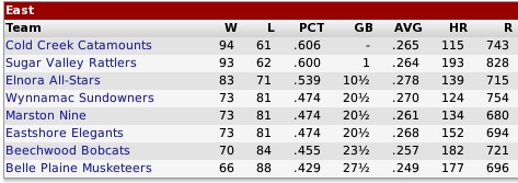 Thursday, September 1, 2039 FOUR CLOSE FINISHES IN IPA Half of the eight divisions in the Islandian Pro Alliance will go down-to-the-wire... there are only 17 games left on the schedule... in the Ruthlandian North the Far Mountain Redhawks have a seven-game edge over runners-up Ranford, LaGrange and Kilkenny. It's the same situation in the Ruthlandian South, where the Waleska Westerners are seven games up on second place St. John... however, the races in the East and West Divisions are still very much in question... Sugar Valley goes into September with a small two-game lead over Cold Creek in the RU East, while three clubs are still in the fight in the RU West... Sligo is up by three games over second place Fort Benton and four better than Volusia. Far Mountain broke even for the month with a 14-14 mark in the RU North... Ranford (19-9) and LaGrange (17-11) had hot months and moved up in the standings... Kilkenny was 14-14... in July Waleska (16-12) improved its lead over second place St. John (15-13) in the RU South... in the RU East Cold Creek posted a strong 19-9 month to cut Sugar Valley lead to just two games... the Rattlers were a solid 16-12... in the RU West the Sligo Rovers put up a 17-11 mark for the month... and Fort Benton and Volusia were 16-12. RUTHLANDIAN UNION STANDINGS |