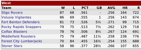 Tuesday, September 20, 2039 SLIGO EDGES VOLUSIA, WINS WEST IN PLAYOFF The Ruthlandian West Division went extra innings to decide this year's champion... at the Jailhouse in Volusia, the Sligo Rovers defeated the Volusia Vigilantes 7-5 in a single-game playoff to capture their first flag since 2033... the V's came in second place, Fort Benton faded badly down the stretch and finished five and a half games behind... the Rocky Rapids Snappers came in fourth and trailed by seven and a half games... last year's winner Colfax came in fifth, losing out by eight and a half games. 1. SLIGO ROVERS: the Rovers had good pitching (3.32 ERA-5th) and can score runs (722 runs-8th), though they don't hit much for average (.256 BA-24th)... they make up for it with firepower (164 HR-9th)... the Rovers could be dangerous in the playoffs with their strong defense (.979 FA), good pitching and homer power. Top Starters: Randall Steele (25-8/3.25), Scotty Price (19-12/2.53), Tom Pierson (15-16/2.83) Top Relievers: (none) Top Batters: leading the way offensively were CF Joe McGarrett (.304/29/94/101), 1B Denny Simmons (284/15/72/87) and SS Neil Mitchell (.279/22/69/85). 2. Volusia Vigilantes: pitching pretty much carried the club... 3.43 team ERA (8th)... bats could have been better... the V's hit only .256 (25th) with average power (143 HR-15th tied) and didn't score well (674 runs-26th)... did a great turnaround this year after three seasons near the bottom of the division. Top Pitchers: Drew Selby (24-13/2.94) and rookie Andrew Arryn (15-6/3.27/3 saves) gave them two fine starters... Hector Vargas (15-17/3.62) and Raul Navarro (13-18/3.21) gave them a lot of quality starts, too. Top Relievers: Skeeter Milham (5-5/3.97/14 saves) Top Batters: 1B Kris Wilson (.343/26/98/87), CF Cazzie Carvalho (.280/20/78/101), 2B Charlie Farmer (.289/18/64/104), LF Kerry Keller (.261/23/80/68) 3. Fort Benton Defenders: the Defenders won their only pennant in 2037... since then they have come in third twice... they went 4-13 in September and blew any chance of winning the pennant... hit well for average with a .271 team BA (4th), score pretty well with 715 runs (11th-tied), but don't go deep often... only had 99 HRs (32nd)... starters are fairly good (3.53 ERA-10th)... strong bullpen with a 2.50 ERA (2nd). Top Starters: Augie Marquis (24-12/2.28), Jordy Raeburn (15-17/2.94) Top Reliever: Edd Farmer (10-4/3.53/12 saves) Top Batters: C Hunter Glenholmes (.319/7/52/101), RF Cayman Crittenden (.292/16/95/96), 3B Mitch Hamilton (.285/2/61/91) , 1B Oscar Pendleton (.298/16/84/56), SS D. D. Badeaux (.296/8/51/70) 4. Rocky Rapids Snappers: for the first time in six years the Snappers worked their way into the first division... improved pitching did it (3.75 ERA-15th)... offense hit only .262 (17th), but did score runs (718-10th)... have decent power with 129 HRs (22nd). Top Starters: Janek Zoldak (20-10/2.55) and Randy Peters (20-11/3.98) both won 20 games... and rookie Jamie Taylor (16-18/2.63) had 27 complete games and was very effective. Top Relievers: (none) the bullpen was horrific with a 4.92 ERA (31st) Top Batters: LF Buddy Hamilton (.261/25/91/87) led the club in HRs, RBIs and runs... top average was SS Nick Nova with .312 BA, 12 HRs, 60 RBIs and 80 runs... CF Crusher Derringer chipped in with a .303 average, 10 homers, 54 RBIs and 66 runs. 5. Colfax Blasters: after a good run of four years, which had two pennants and two second places, the Blasters fell off on the hill and at the plate and dropped in the standings to fifth place. Top Starters: Bobby Porter (21-12/3.31) won 20 games for the second year in a row... Norm Harbison (17-17/3.73) dropped from 21-13 last year. Top Relievers: Nilos Andris (5-1/2.72) did well in the bullpen and as spot starter. Top Batters: 1B Samm Bolton (.311/8/59/78), 2B Kristian McEly (.253/26/98/70), LF Chet Penn (.313/19/79/73), C Mitch Fullerton (.286/19/58/76) 6. Middlefield Roosters: for the ninth time in ten seasons the Roosters came in under the .500 mark and wound up in sixth place... because they play in a bandbox they always hit a lot of homers and also give up a lot of homers... the Roosters racked up 238 homers to lead the Ruthlandian Union and placed second in the IPA behind Bayview with 251... they were number two in scoring with 776 runs... Sugar Valley was number one with 828 runs... the team ERA was 4.40 (30th). Top Starters: James Long (18-16/3.60) and Larry Wheelhouse (16-11/3.81) had good seasons considering where they have to pitch. Top Relievers: Ray Owens (4-4/2.72/18 saves) was solid in the bullpen Top Batters: C Brad Alexander (.257/50/114/84) was the RU home-run leader with 50 and third best in the IPA behind Jerry Culpepper of Bayview with a near-record 63 and Mark Cameron of Arlon, who rapped 52... Hall-of-Famer Jack Elliott of High Mesa holds the all-time mark with 65 in 2021... CF Norm Antonioni (.249/34/66/78) added 34 homers, LF Wes Stanley (.238/29/78/68) had 29, 2B Matt Womack (.261/23/73/90) chipped in 23 and RF Alejandro Dominguez (.290/22/84/89) popped 22 out of the park. 7. Forest City Lumberjacks: the last good year the 'Jacks had was 2013, a pennant-winning season... they have rarely top the .500 mark since... average pitching, mediocre offense and decent power can only go so far. Top Starters: Rich Barstow (18-12/3.46) and Walter Gibbons (15-16/3.07) led the staff. Top Relievers: rookie Omar Cordero (3-9/3.98/20 saves) was inconsistent, but did collect 20 saves. Top Batters: C Bob Brisdon (.303/28/87/74) and 1B Pistol Pete Picard (.281/23/76/56) were the most productive bats. 8. Stoner Stars: the Stars continued a string of five consecutive seasons in the RU West second division with an eighth-place finish... bad pitching and bad offense will do that. Top Pitchers: Sammy Slater (14-12/4.24) was the only winning starter... although Michael Keller (13-18/3.19) was the most effective. Top Relievers: (none) the bullpen was absolutely terrible with a 6.32 ERA (32nd