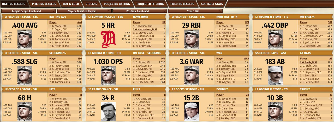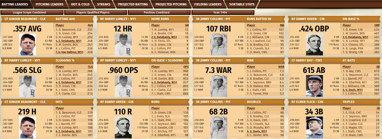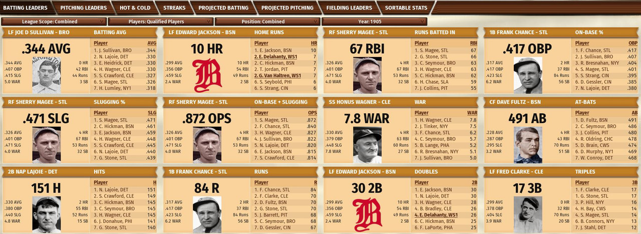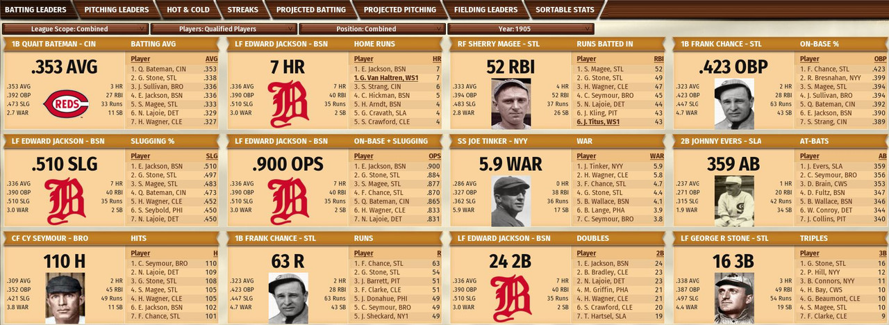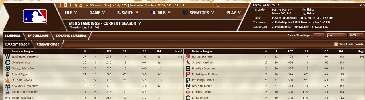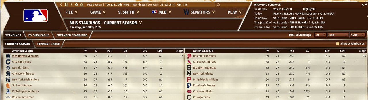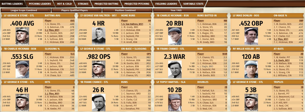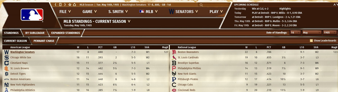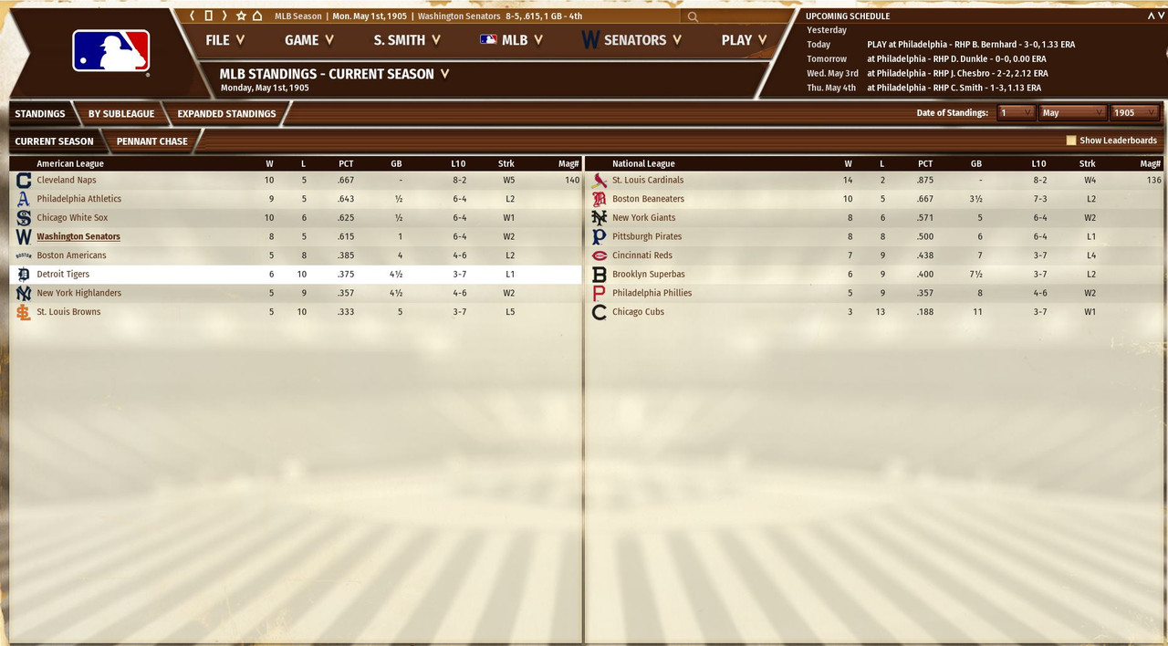 The St Louis Cardinals cooled off enough for the Beaneaters to surge and take the top spot in the National League. Boston is on a 9-1 tear. Over in the American League, the Washington Senators are a surprise at first place. Standings ![]() Batting Stats ![]() Pitching Stats ![]() Washington Senators Report Record 17-8: 1st Place Senators lost Bill Donovan for the rest of the season (4-5 month) with shoulder inflammation. Bill Fleet will fill in for the time being. John Titus is bouncing back from a mediocre 1904 season and is hitting .377.