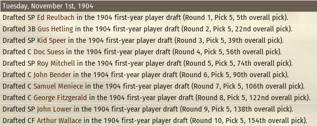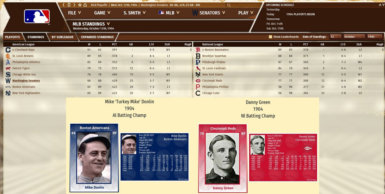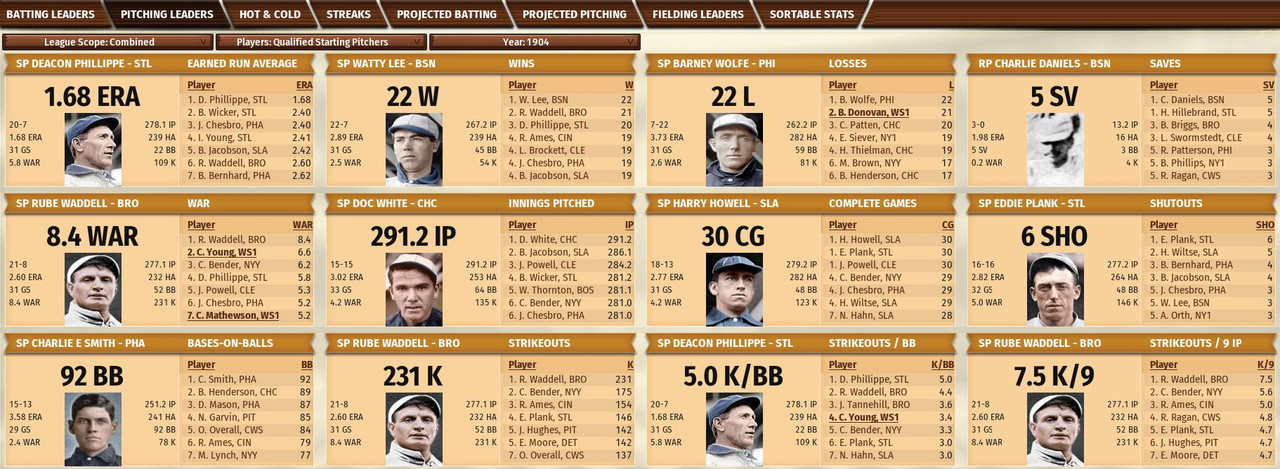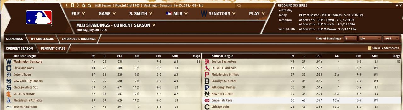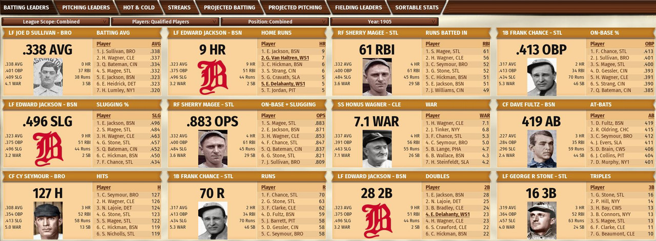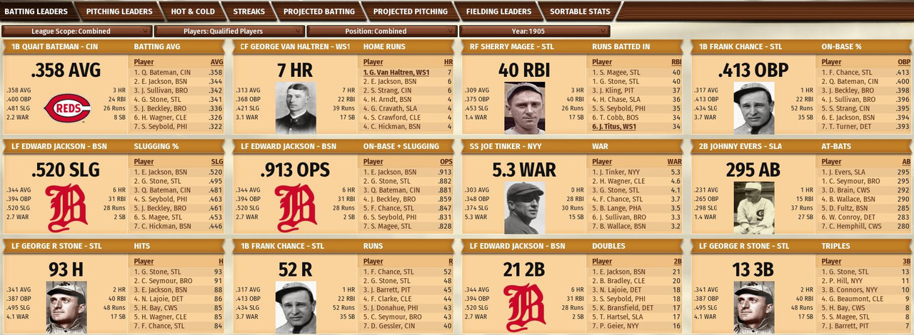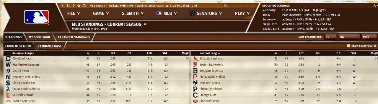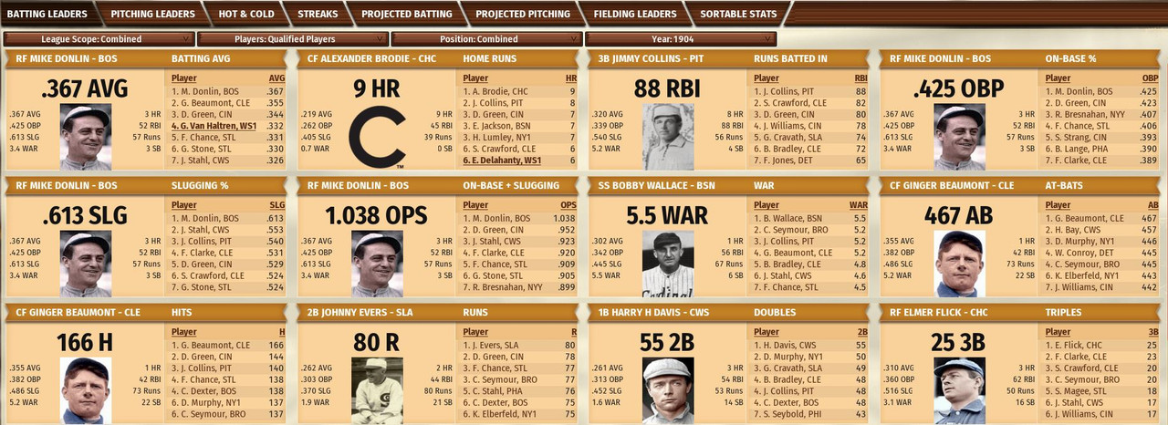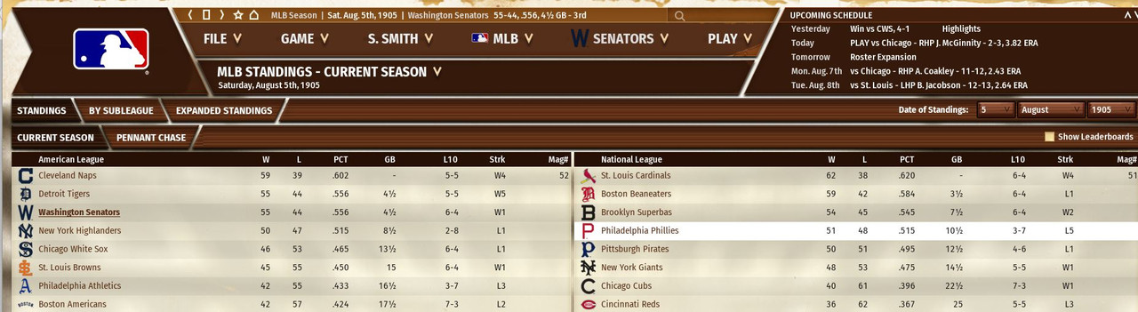 The St Louis Cardinals cooled off enough for the Beaneaters to surge and take the top spot in the National League. Boston is on a 9-1 tear. Over in the American League, the Washington Senators are a surprise at first place. Standings ![]() Batting Stats ![]() Pitching Stats ![]() Washington Senators Report Record 17-8: 1st Place Senators lost Bill Donovan for the rest of the season (4-5 month) with shoulder inflammation. Bill Fleet will fill in for the time being. John Titus is bouncing back from a mediocre 1904 season and is hitting .377.