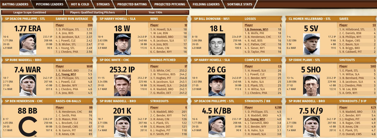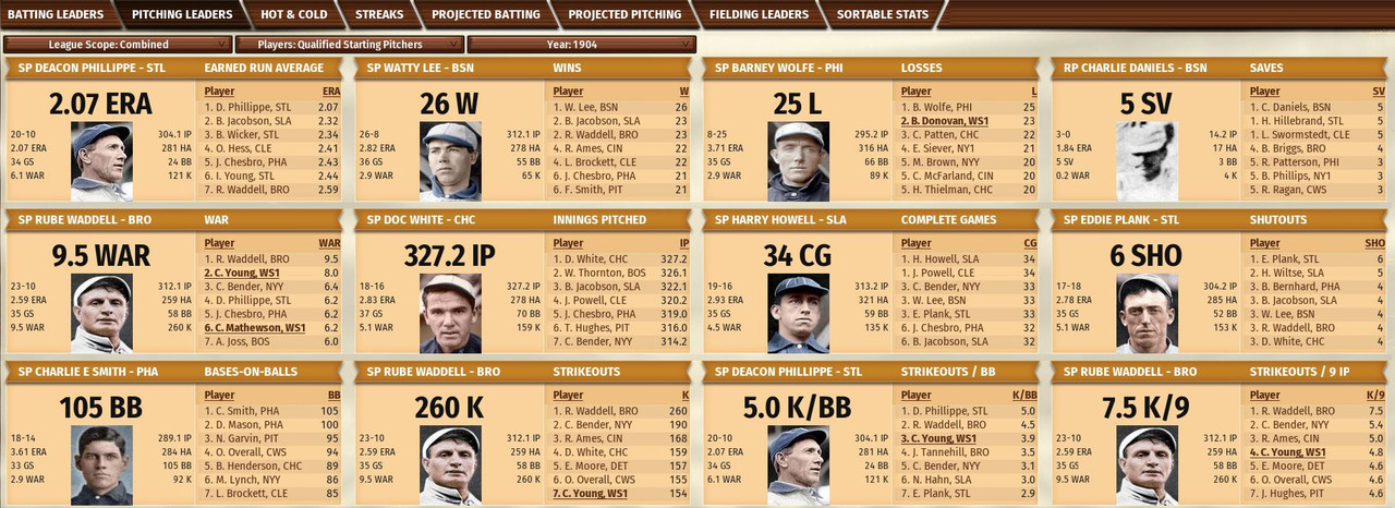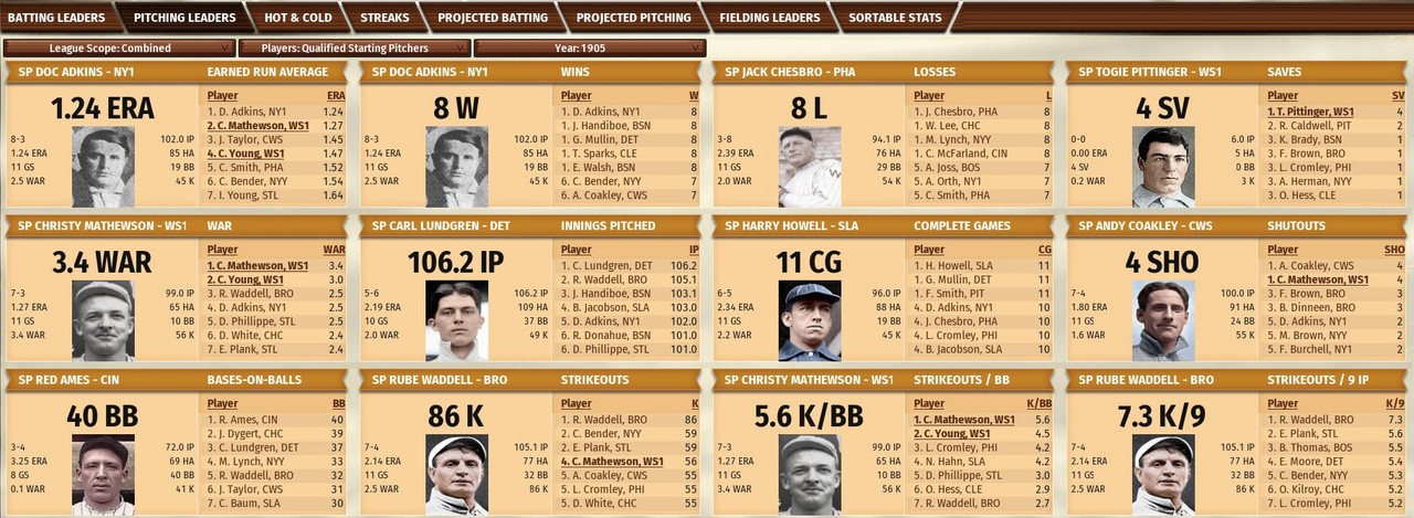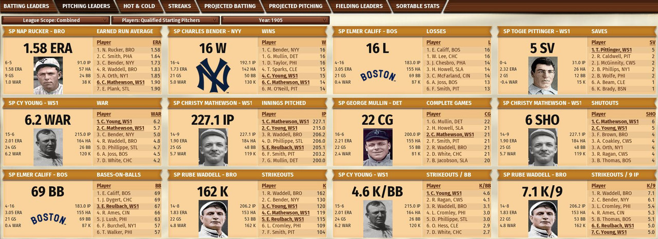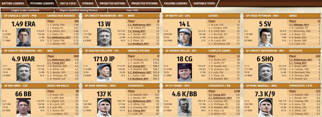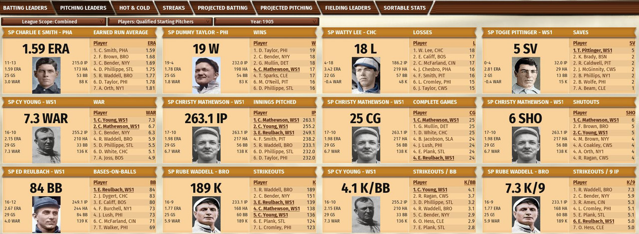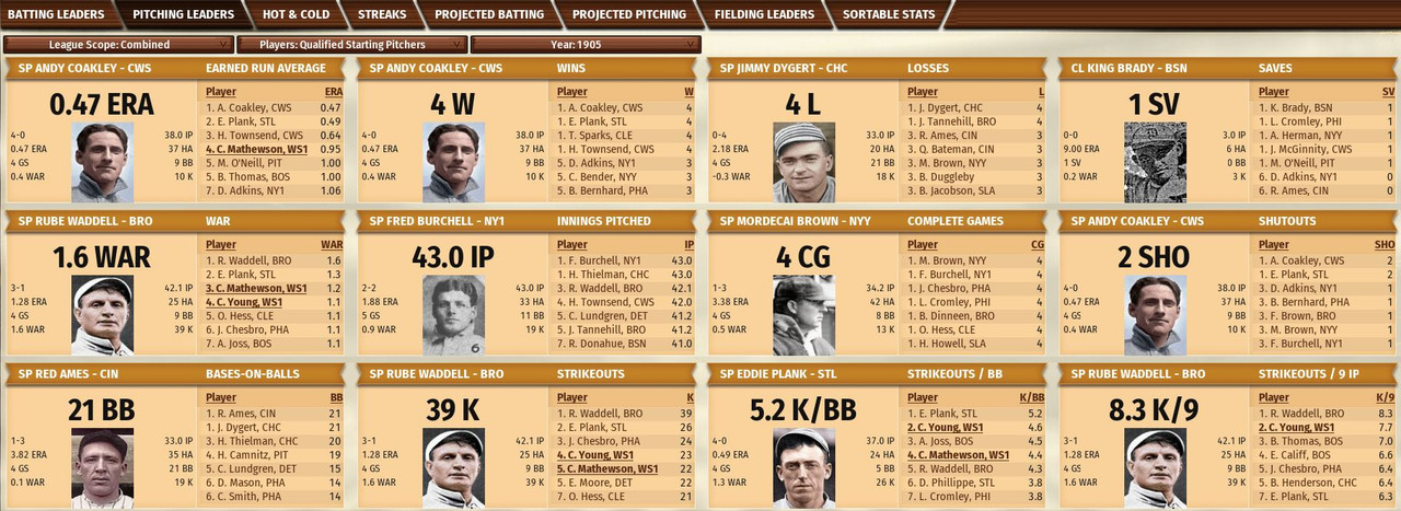 Cleveland is toe to toe with the Senators. Boston Beaneaters are beginning to pull away from St Louis. But still way too early to call. Boston is 14-1 in one run ball games. Standings ![]() Batting Stats ![]() Pitching Stats ![]() Washington Senators Report Record 27-14: 1st Place Christy Mathewson is turning into a dominate pitcher. Three straight shut outs. Rookie Ed Reulbach had one awful out then settled down to win six straight