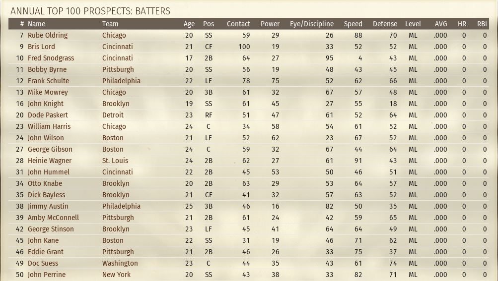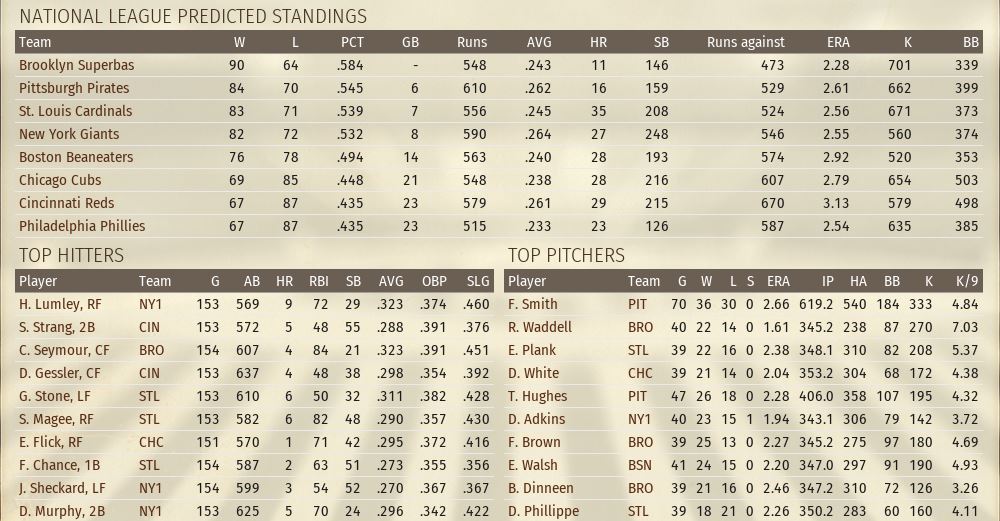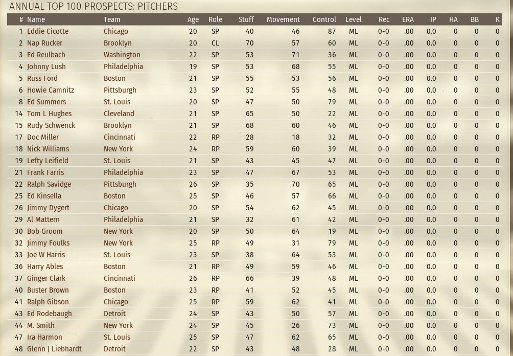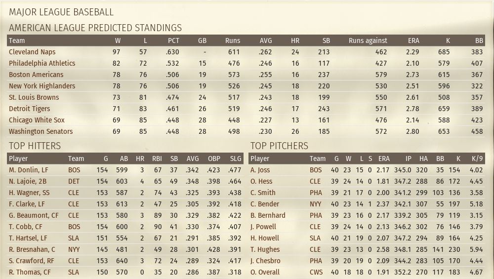 New season is upon us and it looks like the Cleveland Naps might be repeating in the World Series. Who will repeat? Predicted Standings ![]() ![]() The Top 50 Batters ![]() Pitchers ![]()