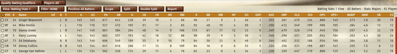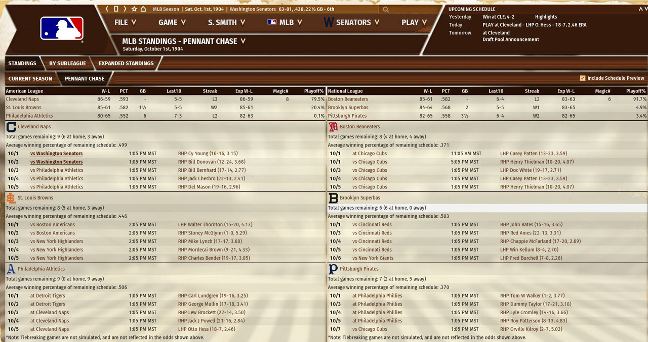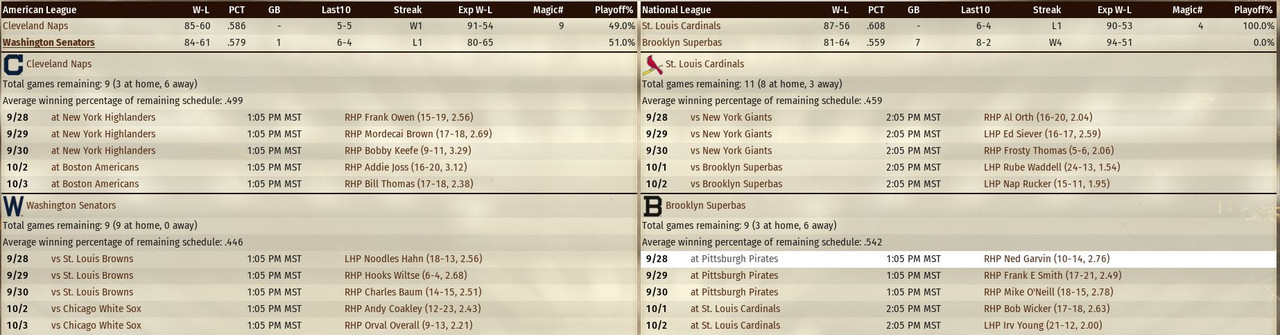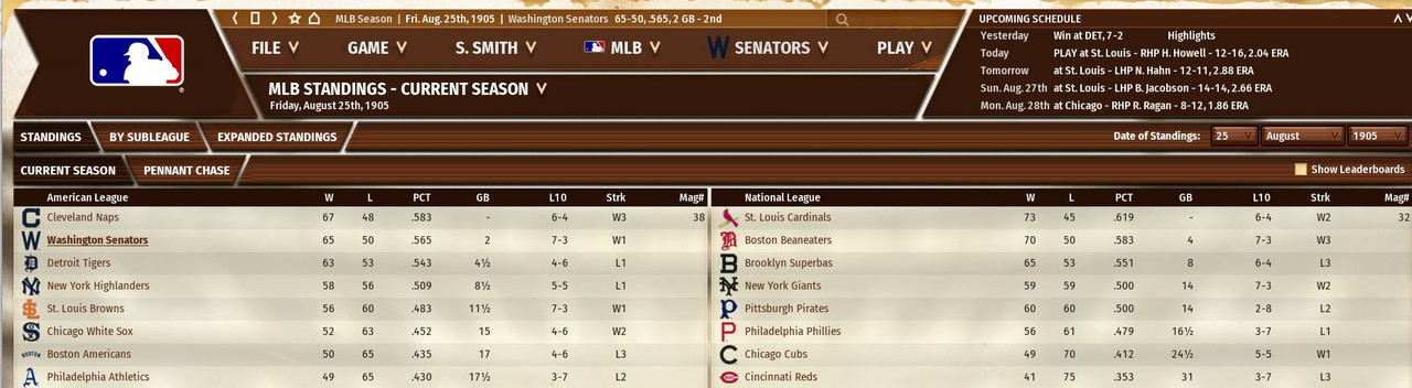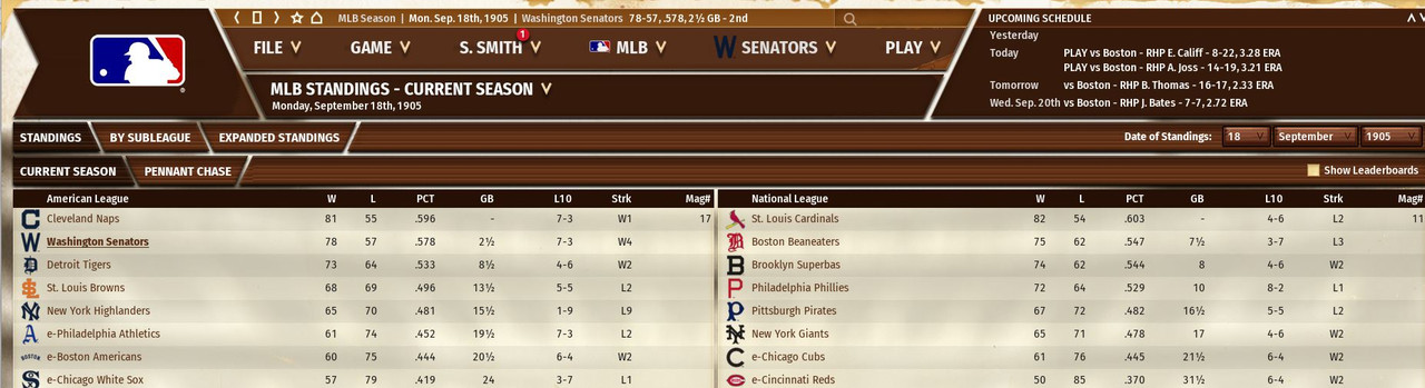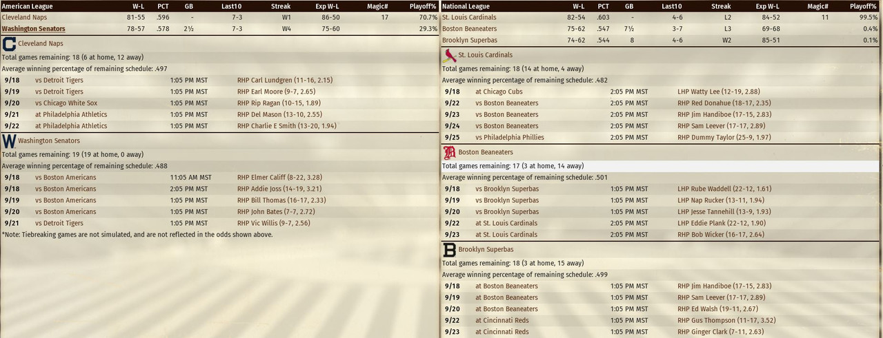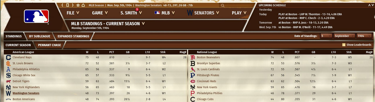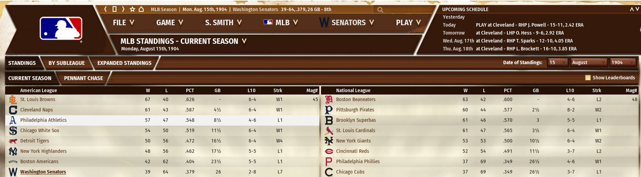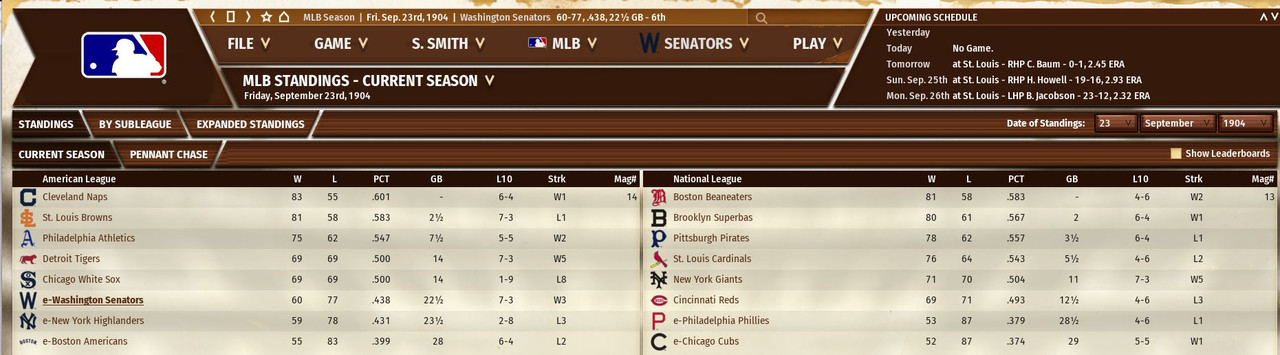 The Browns still have a comfortable lead over the Naps. But is the National League, the Pittsburgh Pirates are inching closer to Boston with their current 8-2 streak. Standings ![]() Batting Stats ![]() Pitching Stats ![]() Washington Senators Report Record 39-64: 8th Place 26 GB The season looks to be over. George Van Haltren is ranked 3rd in Batting Average behind Mike Donlin and Ginger Beaumont. Senators are on a 7 game losing streak.