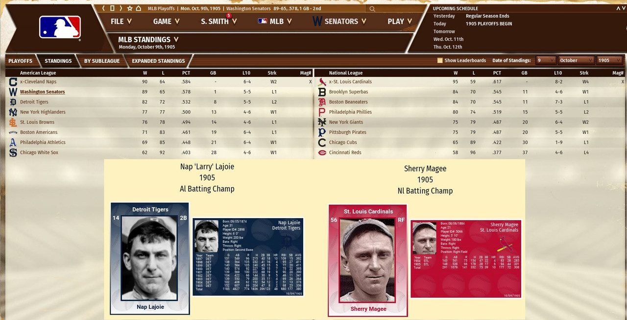 The St Louis Cardinals are off to a hot start, hoping to stay hot to make their second post season appearance, the first and last time was in 1882 when they lost to the St Louis Brown Stockings as the Providence Grays. Cleveland Naps have high hopes for this season to avenge their loss during the 1904 World Series to the Boston Beaneaters. Standings ![]() Batting Stats ![]() Pitching Stats ![]() Washington Senators Report Record 8-5: 4th Place 1 GB The season is off to a good start for the Senators after a disastrous 1904 season. Cy Young is 3-0, John Titus is batting .339 after struggling last season at .263. George Van Haltren is off to a season a good way at .333. Not bad for a 39 year old.