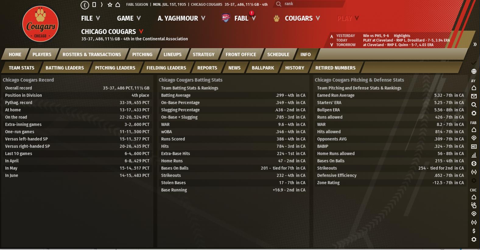 Seasonal Record: 35-37 (4th, 11.5 GB) Stars of the Week Mike Smith : 12 AB, 8 H, 0 HR, 5 RBI, .667 AVG, 1.609 OPS Lou Kelly : 21 AB, 8 H, 2 HR, 5 RBI, .381 AVG, 1.147 OPS John Kincaid : 26 AB, 10 H, 0 HR, 5 RBI, .385 AVG, .931 OPS Weekly Schedule 6-24: Win at Saints (6-2) 6-25: Win at Saints (6-1) 6-26: Win at Saints (9-4) 6-28: Loss vs Sailors (7-6) 6-29: Loss vs Sailors (6-4): 11 innings 6-30: Win vs Sailors (6-9) Summary SSSSSSSSSWWWWWWWWWEEEEEEEEEPPPPPPPPPPPPPPPPP As far as I know, this was our first sweep of the season, and it came in Montreal. We won the opener on Sunday, and then took the next three which all had excellent pitching performances by our starter. He did leave his start in the 7th (of course...), but Tommy Wilcox was excellent in 6.2 innings, allowing 5 hits, 2 runs (1 earned), and 2 walks with 2 strikeouts. Bill Kline, in need of a good outing, walked one and struck out 3 in a 2.1 inning save to finish the game. It was followed by another outing where Dick Leudtke decided to do all the work himself. He allowed an unearned run off 5 hits, 6 walks, and 6 strikeouts, but was also 2-for-5 with a pair of doubles and a run scored. Joe Masters helped too, 3-for-5 with a double and three driven in. Then in the finale, Wayne Robinson did well, 8 innings with 10 hits, 4 runs (3 earned), and 4 strikeouts. The home series didn't go as well, with the Sailors taking the first two before we salvaged the finale. We managed to get 7 of Doc Newell in the opener, but Dave Rankin matched him before Dick Sexton allowed the 8th run of the game. He didn't do too bad, so it's tough the loss is on him, allowing 3 hits and 4 walks with 5 strikeouts. The scary game was the middle. After nine innings, the game was tied at four. And while Oscar Morse was already taken out, it took until pitch #164 for Jim Cathey to remove Tommy Wilcox from the game. This came after 12 hits, 6 runs, and 7(!) walks with just one strikeout. Add in the fact that he left not only his last outing with an injury, but also the one two starts prior, three starts prior, and five starts prior. Of course, that means he's going to get hurt again next week, so I'm already mentally preparing myself for finishing the rest of the year without him. We did salvage the finale, but that was more because we got to face Russ Reel who's had some struggles on the season. Looking Ahead July starts today, and we'll be in Cleveland to start the week. We get three with the surging Foresters who have won eight of their last ten. They sit 42-29, and are now just four games behind the Kings. Cleveland's offense is as impressive as it gets, all but leadoff hitter and rookie Fred Quinn have OPS+ above 100, and to be fair, Quinn's is 98. They've got power, they've got contact, and they can run a bit too. The pitching is also really good, headlined by top arms in Dean Astle, Lou Drouillard, and Eddie Quinn with former Cougar farmhand Ben Turner in the four spot. We will miss the other, Dean Astle, but he actually has the highest ERA of the four (4.08, 110 ERA+). The rest of the week kind of sucks: double header at home on the 4th with the Wolves, and then three in Philly with the Sailors before the All-Star break. We get the 8th (All-Star Game) and 9th off, but this week is going to be a lot of action in a little time. The Wolves have added Vine York to their starting lineup, and we'll get to see him for the double header. He's hitting a nice .300/.344/.472 (116 OPS+) with 4 homers and 22 RBI's in 193 trips to the plate. They also brought in Phil English to be their stopper, who's tossed 9.1 scoreless innings with 4 walks, 5 hits, and 5 strikeouts. Batters After a little bit of a rough patch, Lou Kelly straightened things out with a much better week. He was 8-for-21 with 2 homers and 5 RBI's, up to 11 and 60 on the season. The more impressive performances came from a trio of bench players, with Jake Moore, Mike Smith, and Russ Combs combining to go 12-for-20 with 7 RBI's. Smith was the best of the trio, an outstanding 8-for-12 with a double, triple, and 5 RBI's. Combs did get hurt though, so he'll return to the DL. John Kincaid had a really good week, hopefully adding to his trade value, going 10-for-26 with 4 doubles and 5 RBI's. It's been another decent year for Kincaid, slashing .338/.379/.466 (110 OPS+) with 2 homers, 2 steals, and 40 RBI's. Doc Love has really started to struggle, with his batting line dropping to .324/.364/.497 (113 OPS+) and he's still stuck at 11 homers. He hasn't hit one since June 15th and he's saw his slugging drop from .929 all the way down to .860. Bill Ashbaugh had his first rough week, 5-for-23, but he's still hitting .343/.407/.569 (142 OPS+) with 5 homers, 3 steals, and 30 RBI's in 206 trips to the plate. Him and Lou Kelly are getting my votes for All-Star, but they're the only two I believe deserve it (Dick Leudtke has actually gotten some love from fellow GMs, but I'm not considering him). Pitching I talked enough about how I'm scared about Tommy Wilcox and ready for him to get hurt, but man our staff is struggling right now. Discounting Wilcox, just Dave Rankin (102) has an above average ERA+ after a terrible six start June. He's 1-4 with a 6.14 ERA (76 ERA+), 1.55 WHIP, 17 walks, and 18 strikeouts after erasing all the gains he's made this season. Dick Lyons continues to disappoint, 6-5 with a 6.51 ERA (72 ERA+), 1.94 WHIP, 21 walks, and 34 strikeouts in 94 innings. I'm hoping this is just a really low RNG role and next year he'll get the high end, but at 35 there may not be much of a high end left. And to Leudtke's credit, he has faired like an All-Star this month. His 6 starts went much better, 6-0 with a sparkly 2.79 ERA (168 ERA+), 1.39 WHIP, 13 walks, and 17 strikeouts. He didn't get Pitcher of the Month, that went to Tom Barrell (6-2, 2.81 ERA, 44 K) who had a much nicer WHIP in more innings. All Star Ballot Tough picking the ballots. In the Fed, there were a lot of guys I wanted to vote for but couldn't