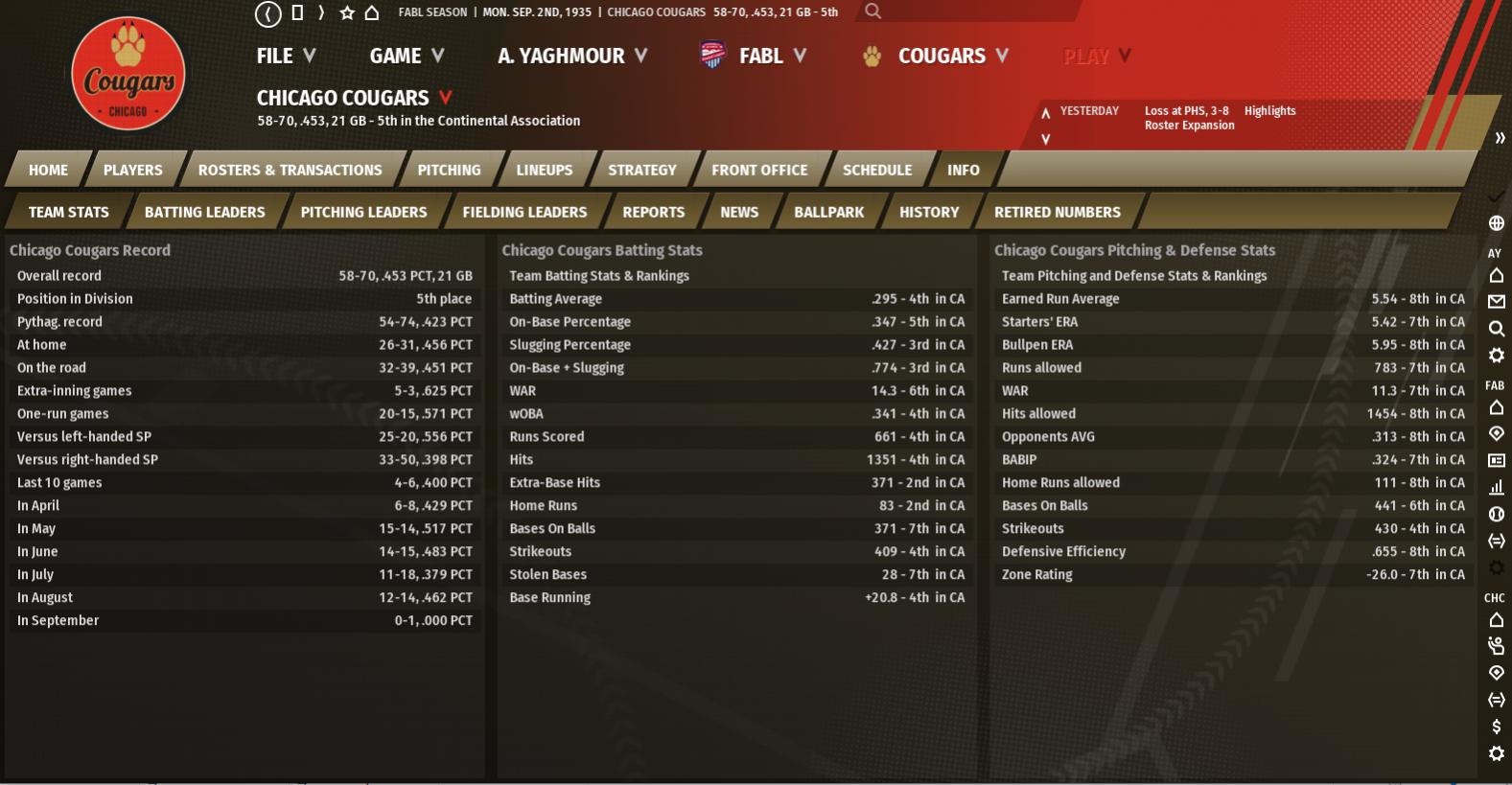 Seasonal Record: 43-49 (4th, 14.5 GB) Stars of the Week Doc Love : 37 AB, 16 H, 3 HR, 11 RBI, .432 AVG, 1.097 OPS John Kincaid : 34 AB, 14 H, 0 HR, 7 RBI, .412 AVG, .944 OPS Jake Moore : 10 AB, 5 H, 0 HR, 5 RBI, .500 AVG, 1.383 OPS Weekly Schedule 7-15: Loss vs Stars (14-12) 7-16: Win vs Stars (3-5) 7-17: Loss vs Stars (8-4) 7-18: Win vs Stars (0-4) 7-19: Loss vs Saints (15-7) 7-19: Win vs Saints (8-13) 7-20: Win vs Saints (4-5) 7-21: Win vs Saints (4-9) Summary So Tommy Wilcox is hurt again, likely out 8-9 weeks with bone chips in his elbow. It keeps getting worse for him, as he pitched awful in the opener against the Stars and then lasted just one inning on the 20th. I'm sad, my favorite player is broken and I can't be happy about the 5-3 week. The two players left on the team, John Kincaid and Doc Love, both had excellent weeks and I think Doc Love wants out. A three homer week back at home and I'm hoping he can add three more. I think the deadline is Monday or Tuesday, so we have a little time to work something out. I did not expect to make one deal last night, but managed to put together three last night so who knows what's in store for us next. I was happy with the week. Even though the season is over, I do want to win every game possible. Losing sucks, and waking up to a 5-3 sim is a much better feeling then seeing the 1-5. Still a long way to go, and I'd rather fill that win wins and not losses. Looking Ahead After getting the teams ranked in seventh and eighth, we welcome the teams in first and second. First is Brooklyn for four with the 57-34 Kings. They hold a 4 game lead over the 53-38 Foresters who come to town for three after. These are both really good teams that can pitch and hit and considering we can only hit some of the time, I'm already bracing for a one or two win week. Despite all of that, we're actually 7-5 against the Foresters so perhaps we can really make the Kings happy this week. Batters The trade case for Doc Love: Only Al Wheeler has hit more CA homers. He's batting .343/.374/.530 (125 OPS+). It would also make me very happy. His morale is "Great", so maybe he doesn't actually want out, but this guy flat out rakes. He turns 29 on the 29th, and since trades are processed on the Monday, if I can move him he'll be traded on his birthday! The trade case for John Kincaid: His lowest single season OPS+? 110. His lowest zone rating at third? +2.3 (this year). The 30-year-old Kincaid has been as consistent as it gets the passed seven seasons, owning a nice .333/.373/.449 (116 OPS+) career line with 91 triples, 26 homers, and 589 RBI's. He used to be a stolen base threat, but we really don't run much anymore. Still, Kincaid is in the midst of a strong .341/.380/.464 (111 OPS+) season and currently ranks as our best player on the team. It's not really saying much, as after the Kelly trade, we don't have a single top 20 player. Joe Masters, is that you? Rising from the ashes like a great Phoenix, the lefty slugged .308/.550/.615 with a homer and 6 RBI's during the week in possibly his only good week of the year. Ollie Page matched his line almost exactly, substituting the .550 OBP with a .500 mark. No homers, but he did triple twice. Jake Moore looked good too, 5-for-10 with a double, triple, and 5 RBI's. Bill Ashbaugh has slumped, his line down to .305/.361/.479 (109 OPS+) and his ankle sore. I'll let him rest for the week, maybe a start or two at the end. Pitchers Even though the only pitcher I want to talk about got hurt, there was a few alright performances. Starting with Dave Rankin, who was suck on a four start stretch with 7, 6, 5, and 7 earned runs, he finally found the light. On the 18th he tossed a 3-hit, 7 strikeouts masterpiece as we topped the Stars 4-0. A beautiful performance by Rankin who sits third in the CA with 68 strikeouts. He's four behind Harry Carter, but neither will catch Tom Barrell and his 114. Wayne Robinson actually made two really good starts (with a tough relief outing sandwiched between), picking up a win against both teams. Against New York he went 7.1 with 10 hits, 3 runs, a walk, and 3 strikeouts. Against Montreal he went 8 with 12 hits, 4 runs, 4 walks, and 4 strikeouts. Sure, not great, but still respectable lines that are good enough to win. Dick Leudtke's last Cougar start was against his new team, and they were not that nice to him. In 8 innings he allowed 16 hits, 8 runs, and 3 walks with 4 strikeouts. Minor League Report Thought I'd cover some of the new Chicago Cougars: LF Rich Langton: Sharing a birthday with Doc Love, Langton will turn 24 when Love turns 29 on the 29th. He gets his gift a little early, the purchasing of his contract from AAA Milwaukee. Langton is slashing .352/.426/.522 (134 OPS+) with 7 homers, 13 steals, and 62 RBI's. If you ignore the 19 caught steals, it is really hard to find a weakness in Langton's game. He's capable out in left, he's got good speed, and he absolutely laces the ball whenever he hits it. He won't strike out, just 82 times in 2,072 plate appearances since 1930. He almost struck out more in college (40) then he did in affiliated ball (42), and he played 300 more affiliated games. He walks two, averaging one every other game in AAA and 185 total in the same time period. If you can't tell already, I am beyond excited for this guys debut. It may be bold, but I am so high on Langton that I'd bet if him and Love remain teammates this season, Langton will outperform Love from this point on. I haven't decided how I would align them, but since I let Langton pick up reps in right last week, I'll at least let him get a few more in the majors. It's tough because Love is not a good left fielder, but I can't imagine he'd do well learning right. I do want Langton getting some time in left, so every so often I'll flip them. SP Art Black: He did debut last season, but 26-year-old Burger Black will rejoin the Cougars for round two. Last season he made 3 starts, going 1-1 with a 5.59 ERA (78 ERA+), 2.17 W