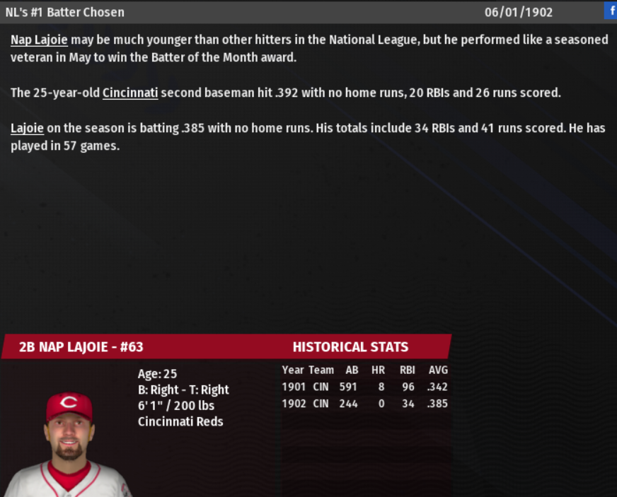 Just when you thought he couldn't get any better, Nap Lajoie took it up another notch. This time the powerful Cincinnati Reds 2nd baseman smoked the opposition for a .392 batting average (47 for 120), with 12 doubles, 3 triples, 26 runs, and 20 rbi's for a slash line of .392/.434/.542 (181 OPS+, 194 wRC+, 1.9 WAR) to take home National League Batter of the Month honors.