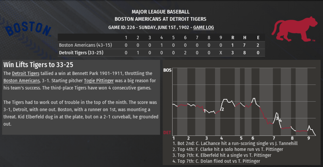 At the plate, Candy LaChance (2 for 2, 1 RBI) and Mike Donlin (2 for 3, 1 Run) played well for the Tigers, while Fred Clarke (1 for 4, Home Run, 1 Run, 1 RBI) and Frank Chance (2 for 4) kept Boston close. Despite hitting the ball well, Chance had a rough day behind the plate, allowing 5 stolen bases and committing 2 errors. Player of the Game: Togie Pittinger