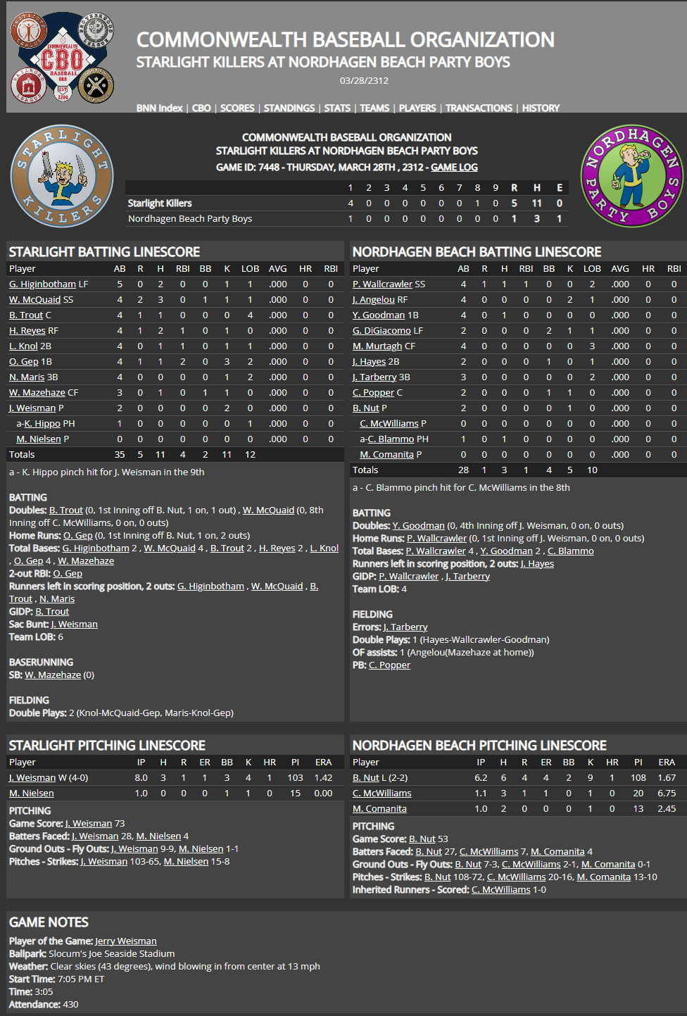 BNN Report News from the CBO, Minors, CCBL, and CYL by Nat Wright-Kawolski 21 March 2312 Nuka Tournament Down to Four Teams The Nuka Tournament is now down to its four finalists with the Semifinal Series beginning tomorrow at the sites of the two highest-ranking teams. The results and coming schedule are below. Roxbury Regional FHE vs County Crossing: CC 6-0. CC 8-7, CC 7-2 County Crossing vs Fort Hagen: CC 3-2, FtH 26-5, CC 7-1, FtH 7-5 County Crossing battled as the #4 seed all the way to the end, finally succumbing to the Silver Shroud in the final game of the regional. In the championship series, the team from the Winner's Bracket starts with a 1-0 advantage. That means Fort Hagen won the series, 3-2. The most impressive offensive performance of the tournament came in the second game when the Shroud busted out for 26 runs. Seven starters put on impressive offensive performances in a game that also included a three-run pinch-hit home run by Gunner Eyesocket. Impressive performances from the top of the lineup to the bottom include Hid Matsumoto (4/4, 2B, 3 R, RBI), Brennan Colt-45 (2/5, 2B, R, 3 RBI), Sleve McDichael (2/3, BB, 3 R, 2 RBI), KiJana Mallee (3/4, BB, 2 R, 2 RBI), Foo Fieterz (3/4, 2B, BB, 3 R, RBI), Admiral Kelm (2/5/ 2 HR, 2 R, 6 RBI), and Burtie Cuttooth (3/4, 2B, HR, 3 R, 4 RBI). Starlight Regional Easy Town vs Sunshine Tidings: ST 5-3, ST 4-3, ST 11-7 Sunshine Tidings vs Starlight: Star 8-4. Star 5-1, Star 5-4, Star 3-2 Both of the final series were no-contests as Sunshine Tidings easily put away the impressive showing of 7th-seeded Easy Town. Then the host Killers won all four games over the Chemists to earn their way into the semifinals and the right to host fellow Institute League team, the Shroud. Nordhagen Bach Regional Vault 81 vs Salem: Sal 2-1, V81 11-3, Sal 1-0 Salem vs Nordhagen Beach: NB 6-5, NB 3-0, NB 5-4, NB 5-2 The Party Boys are not finished winning as they won 9 of the 10 games they played in their own regional. The Witch Hats kept all three finals games close, never losing by more than three, but they were just not enough to overpower their league mates in the Boys. University Point Regional Oberland vs Bunker Hill: Obe 4-1, BH 6-2, Obe 6-0 Oberland vs Nahant: Obe 8-7, Obe 4-1, Nah 5-3, Nah 10-1 The T-51s were the only team from the South Charles Association to make it to a regionals final in what turned out ot be the NCA tournament. Still, Oberland was one win away from clinching the final series after taking the first two games over Nahant for a 2-1 series lead. However, the Celtics found their luck and won the last two games. Nahant will now travel to face off with Brotherhood League rivals, the Nordhagen Beach Party Boys. Last season, Nahant won the Brotherhood League, but the Boys still advanced further in the playoffs, losing to Roxbury in the Sole Survivor Series. CBO Transactions Thursday, March 21st , 2312 The Nahant Celtics traded 30-year old LF Fairprice Fairley to the Bunker Hill 75ers, getting 19-year old minor league 1B Greyson Dolittle in return. Wednesday, March 20th , 2312 Goodneighbor Hancocks: 1B Handel Alone returns from his rehab assignment. Tuesday, March 19th , 2312 Goodneighbor Hancocks: Activated 1B Handel Alone from the injured list. Goodneighbor Hancocks: Sent 1B Handel Alone to Triple A Foxborough for injury rehab. Monday, March 18th , 2312 Nordhagen Beach Party Boys: Signed free agent SP Bull Strickland to a minor league contract. The Easy Town Assaultrons traded 31-year old CF Sharkey Lurkfodder to the Bunker Hill 75ers, getting 18-year old minor league RHP Jacques Of'Ten, 21-year old 2B Zeke Zombifier, and 20-year old minor league 2B Leroy S. Paige in return. Saturday, March 16th , 2312 Starlight Killers: Released SP Dan Sharp. Friday, March 15th , 2312 Salem Witch Hats: Released RF Free Cake Doorman. The Goodneighbor Hancocks traded 21-year old minor league RF Bill Duggle to the Easy Town Assaultrons, getting 23-year old 2B Always Brock Rutherford Jr. in return. Wednesday, March 13th , 2312 Southie Brews: Released RP Dale Callaway. Southie Brews: Released SP Eric Sleeping. Lexington Synths: Released SS Chris Cappy. Jamaica Plain Red Rockets: Released 1B Justin Huffaker. Jamaica Plain Red Rockets: Released 1B Chris Munsterman. Jamaica Plain Red Rockets: Released 1B Natural Clagett. Jamaica Plain Red Rockets: Released 1B Duke Jeaeye. Goodneighbor Hancocks: Released RP Newt Rockknee. Atom Cats: Released RP Lucky Dim Nunez. Atom Cats: Released C Moises Cantu. Oberland T-51s: Released RP Tolkien Hedz. Oberland T-51s: Released RP Jay Decay. Concord Radstags: Released RF Mister Bribery. Oberland T-51s: Released RP Kaden Okongwu. Concord Radstags: Released RF Ello Asty. Oberland T-51s: Released RP M.Z. Murray. Oberland T-51s: Released RP Guzz Knight. Glowing Sea Radscorpions: Released RP Wes Yogurt. Glowing Sea Radscorpions: Released SP Bull Strickland. Malden Grognaks: Released 2B Will Bradber. Glowing Sea Radscorpions: Released RP Garrett Camelot. Glowing Sea Radscorpions: Released RP No-Knock Graves. CYL Preview The predictions are in for the 2312 season, and our trusty PAM assaultron has predicted a final of the Swansea Nuka Sox defeating the Circle Jerks in the Commonwealth Youth Series. Last season, the league tried a double-elimination tournament but found the playoffs to be saturated with too many moving parts. In the end, the Brown Bubblers took the series over the Harwich Fishheads, two games to none. This season, the tournament will go back to a single-elimination model with the top teams from each region emerging to play a three-game, winner-take-all series. Predicted division winners in the last season of just eight divisions (teams go to 10 divisions in 2313) are: Franklin: Acton Ups Emerson: Beantown Sprouts Fuller: Circlejerks Revere: Saugus Launchers Adams: Woodlawn Gnomes Alcott: West Quincy Atomatoys Morse: Swansea Nuka Sox Attucks: Wellfleet Tarberries In the North Region, top hitter prospects are 3B Merlin 