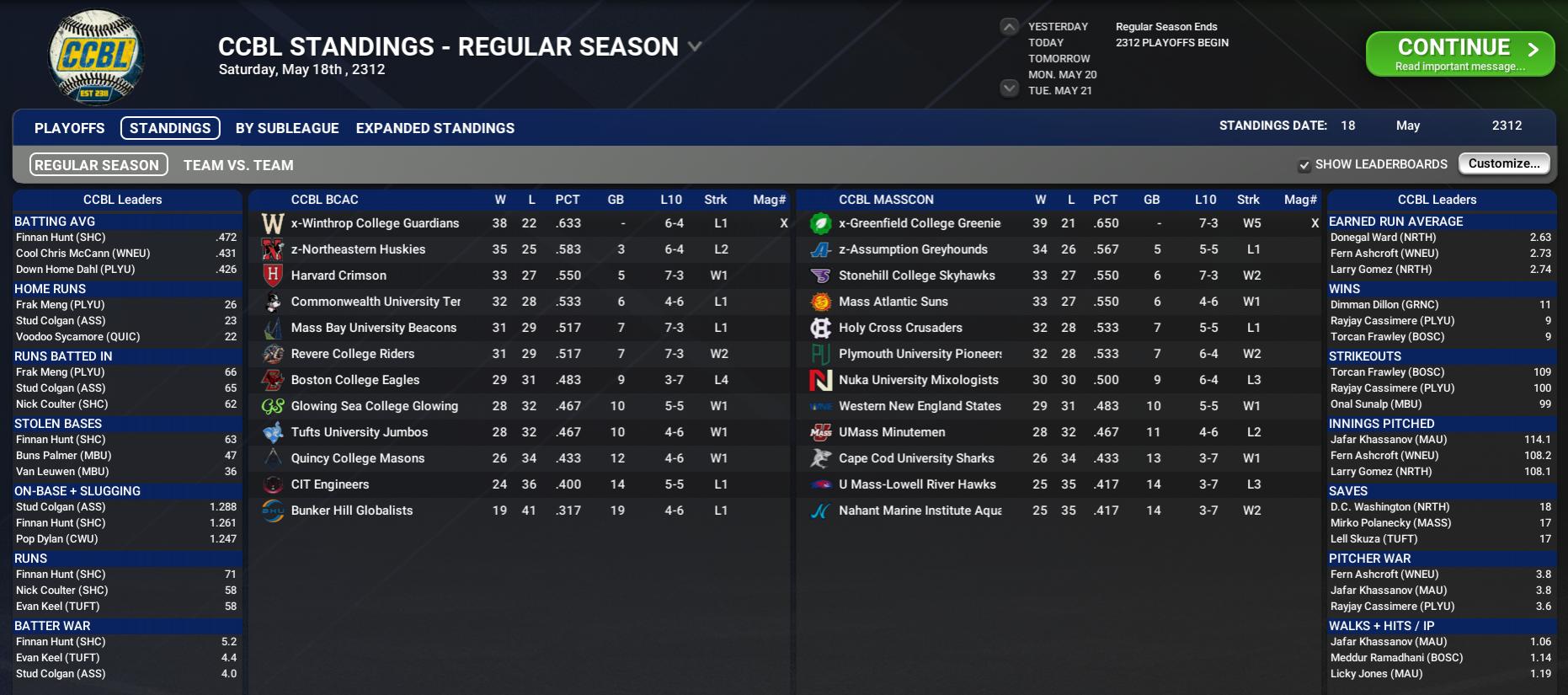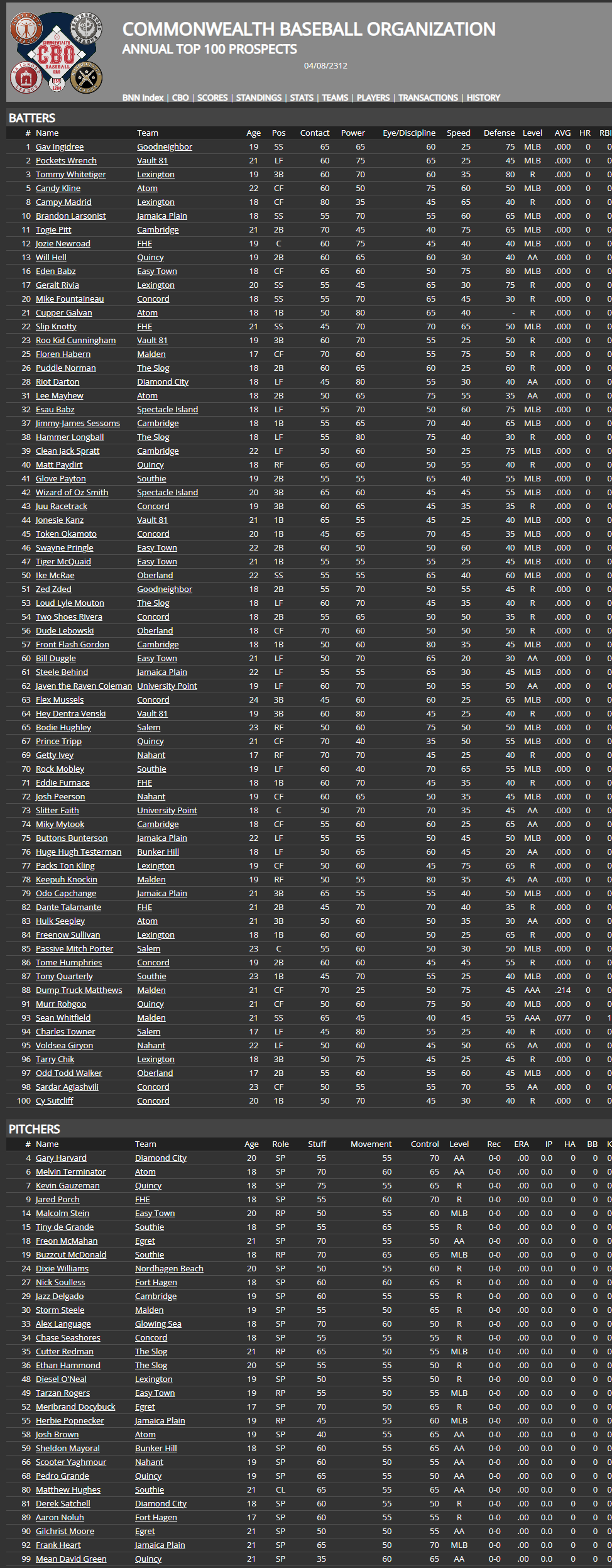 BNN Report News from the CBO, Minors, CCBL, and CYL by Nat Wright-Kawolski 1 April 2312 CCBL Analysis We are now entering our second month of the collegiate season with several teams emerging as the beasts of the 2312 season. Conference leaders through 20 games of the 60-game college season are the Northeastern University Huskies (16-3) in the BCAC and the Mass Atlantic University Suns (13-7) and Greenfield College Greenies (13-7) atop the MassCon. The Huskies' great results so far have been the result of great pitching, allowing just 69 runs to lead all of the CCBL. Starters Larry Gomez (5-0, 1.67), Donegal Ward (5-0, 1.17), and Franky Palace (3-0, 1.32) have all been dominant so far. CL D.C. Washington (10 SV, 0.00) has yet to give up a run in 10 appearances. Mass Atlantic has also used its starting pitching to help it win games. The Suns' top three starters have also been great: Jafar Khassanov (3-1, 2.25), Licky Jones (4-0, 1.91), and Jail Mikkola (3-1, 3.66). Greenfield has been the offensive guru, leading the CCBL in runs scored (147). Top hitters include 3B Moktar Wakihuri (.431/6/22), Justin Hoskins (.431/5/21), and Alistair Brown (.403/6/19). CCBL Players of the Month Hitter - When Voodoo Sycamore stepped up to the plate in March he did it with confidence, and today he was honored with the Commonwealth Collegiate Baseball League Batter of the Month award. The young Quincy College first baseman posted a .441 batting average with 12 home runs, 21 RBIs and scored 24 runs. Sycamore also worked pitchers for 12 walks to post a .537 on-base percentage. Pitcher - Larry Gomez of Northeastern had an outstanding March with a 5-0 mark and was chosen the Pitcher of the Month in the Commonwealth Collegiate Baseball League. He topped off the month with a 1.67 ERA in 5 starts, tossed 43 innings, fanned 35 and held opposing teams to a .199 average. CYL Analysis The CYL is 13 games into the season but did not play enough games yet to have players of the month. Still, we would like to point out some standout players so far this season. In the North Region, Diamond City's Merlin Hodges (.442/10/20) is atop or near the top in the major offensive categories. In the South Region, Sweet Admiral (.396/10/24) of Andrew Station is atop 11 offensive categories to be the top offensive player there. For pitcher, the NR's top pitcher has been Saugus' Swatter Gillette (4-0, 0.56) in four starts. In the SR, Coventry's Frenzy Guava (3-0, 0.65) has been our top pick. In the standings, division leaders are the Marlborough Minigunners (9-4), Concord Iceboys (9-4), Saugus Launchers (11-2), Circle Jerks (9-3-1), Woodlawn Gnomes (11-2), Dennis Menaces (10-3), Plymouth Hunters (9-4), and Andrew Station (10-3).