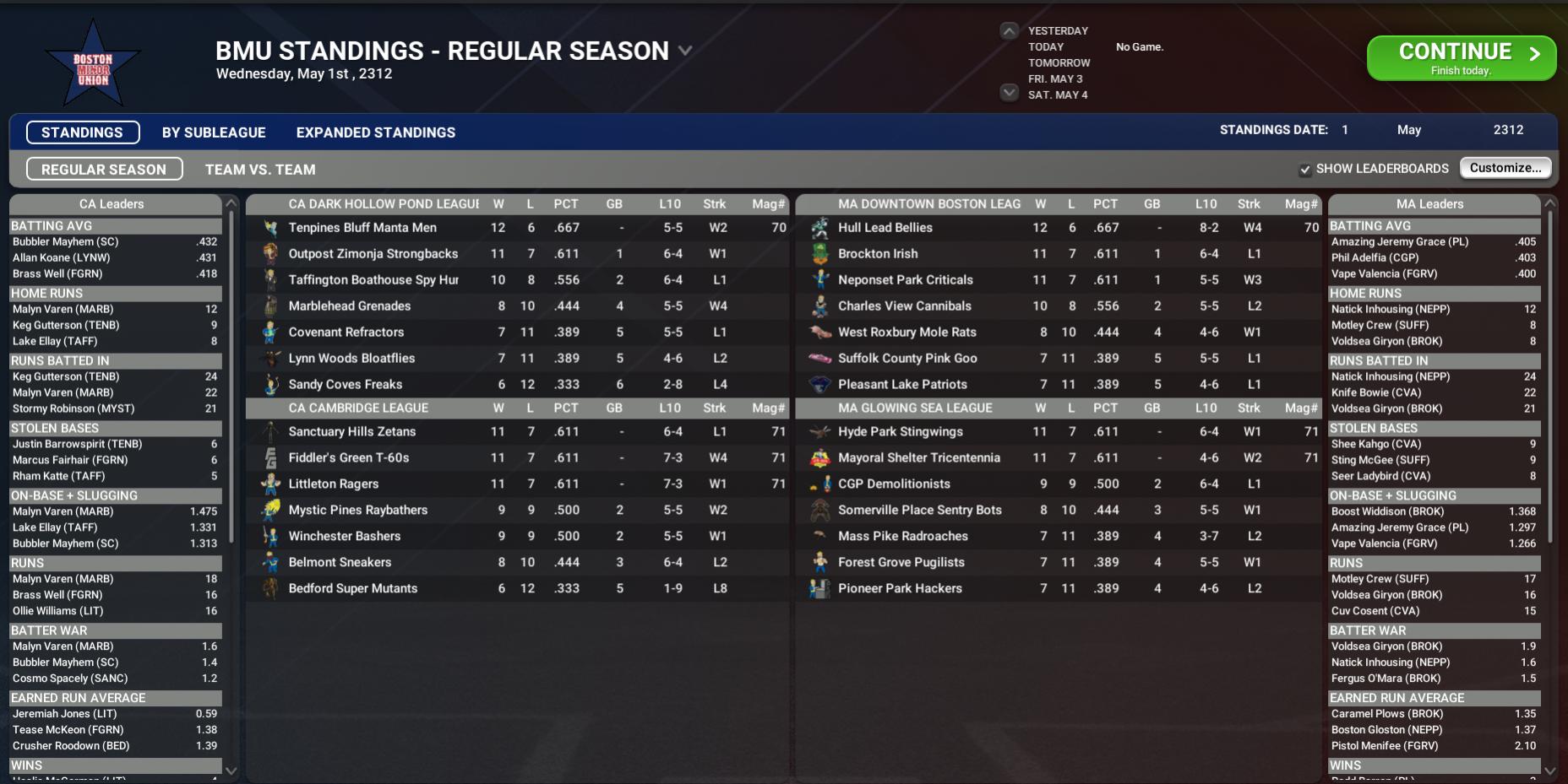 I'm sure it's happened before, but it's somewhat surprising how divided the associations are. The NCA division winners have a nice cushion while the entire SCA is pretty bunched up. Even the Radscorpions are within ten games of first! And I think all teams are still within single digits of a playoff spot! Plenty of runway lefty but it will be interesting to see if things end this way too