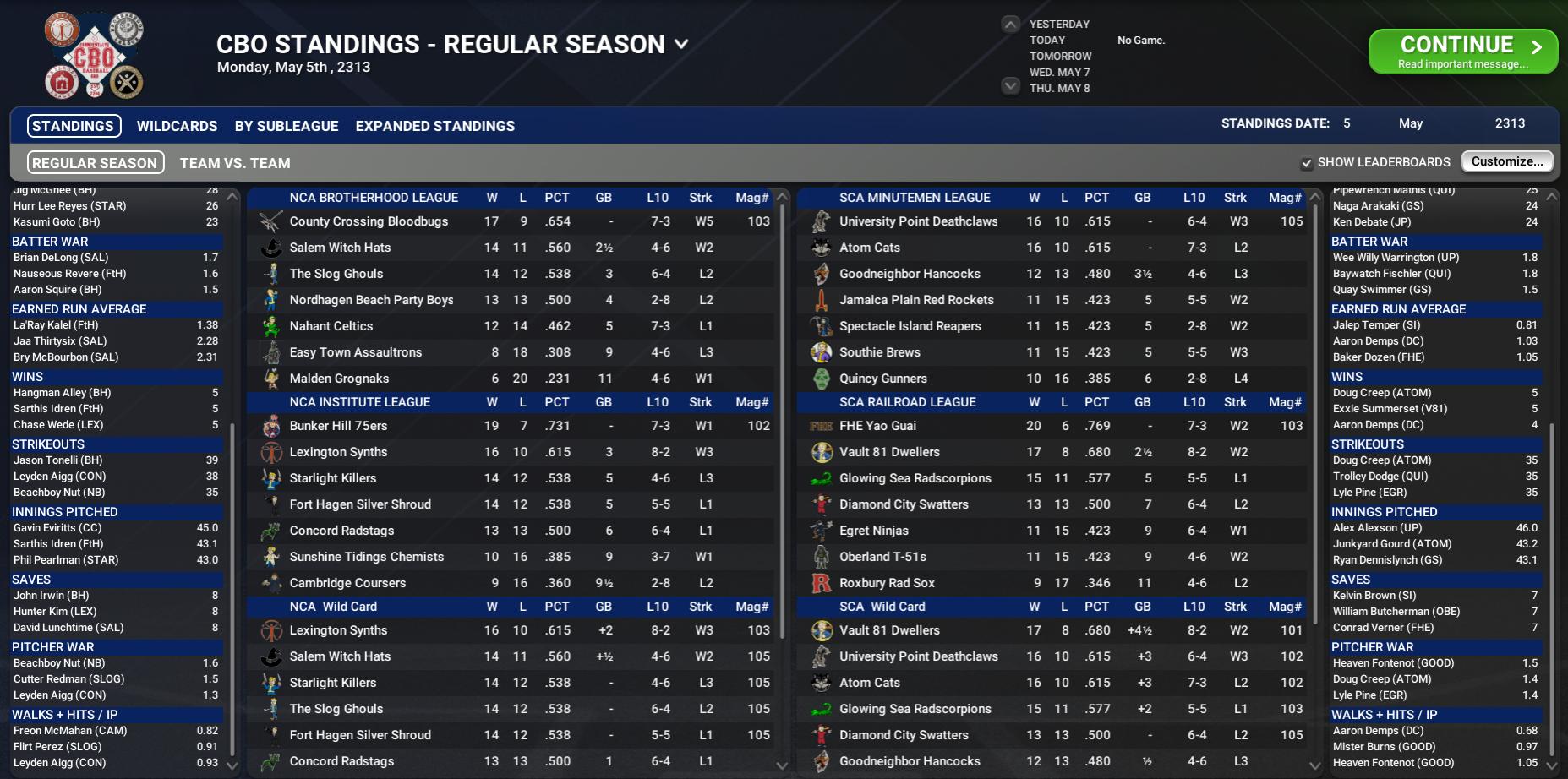 BNN Report News from the CBO, Minors, CCBL, and CYL by Nat Wright-Kawolski 4 March 2313 Nuka Cup Tournament The 2313 Nuka Cup Tournament has begun with 24 of the CBO's 28 teams playing a Play-in Series for the right to move into the double-elimination portion of the tournament. The breakdown of results are below with series records, not scores. Fort Hagen Regional #2 Oberland 3, #7 Lexington 0 #3 The Slog 3, #6 Spectacle Island 0 #5 Nahant 2, #4 Egret 1 Jamaica Plain Regional #2 County Crossing 2, #7 Glowing Sea 1 #3 University Point 2, #6 Cambridge 1 #4 Starlight 2, #5 Atom 1 Vault 81 Regional #2 Bunker Hill 2, #7 Quincy 1 #3 Goodneighbor 3, #6 Easy Town 0 #4 Concord 2, #5 Diamond City 1 Salem Regional #2 Roxbury 3, #7 Malden 0 #6 Southie 2, #3 Nordhagen Beach 1 #4 FHE 2, #5 Sunshine Tidings 1 Summary With the #1 seeds having a bye, here is the breakdown of seedings in the Sweet 16: #1: 4 #2: 4 #3: 3 #4: 3 #5: 1 #6: 1 #7: 0 Southie had the biggest upset of the Play-in Round, downing the powerhouse Nordhagen Beach, two games to one. The Party Boys won the first game, 5-1, with Beachboy Nut doing his thing. Nut allowed no runs on three hits with four strikeouts in 7.0 innings. The Brews had game, though, the next two, beginning their run to the tournament. In Game 2, Southie needed 13 innings, but came away with a 15-10 victory after a five-run inning in the 13th. Among the no-name players to hit homers for the Brews included Sonny Pacio and Glove Payton. Fairlane Ford was 3 for 6 with a triple, two walks, a run, and four RBI. In Game 3, Southie dominated from the start, clinching the series with a 6-1 victory. SP Air McNair allowed no runs on one hit with two walks and four strikeouts in 6.0 innings. The one run allowed in the game, by RP Fat Cat Wellesley, was an unearned run. Ford continued his Series MVP play by going 2 for 4 with a home run, a walk, two runs, and an RBI. Grill Atomson doubled twice.