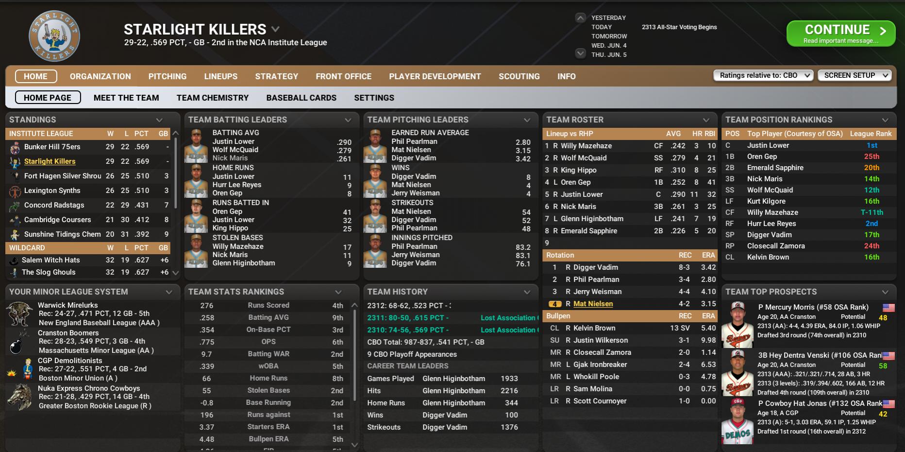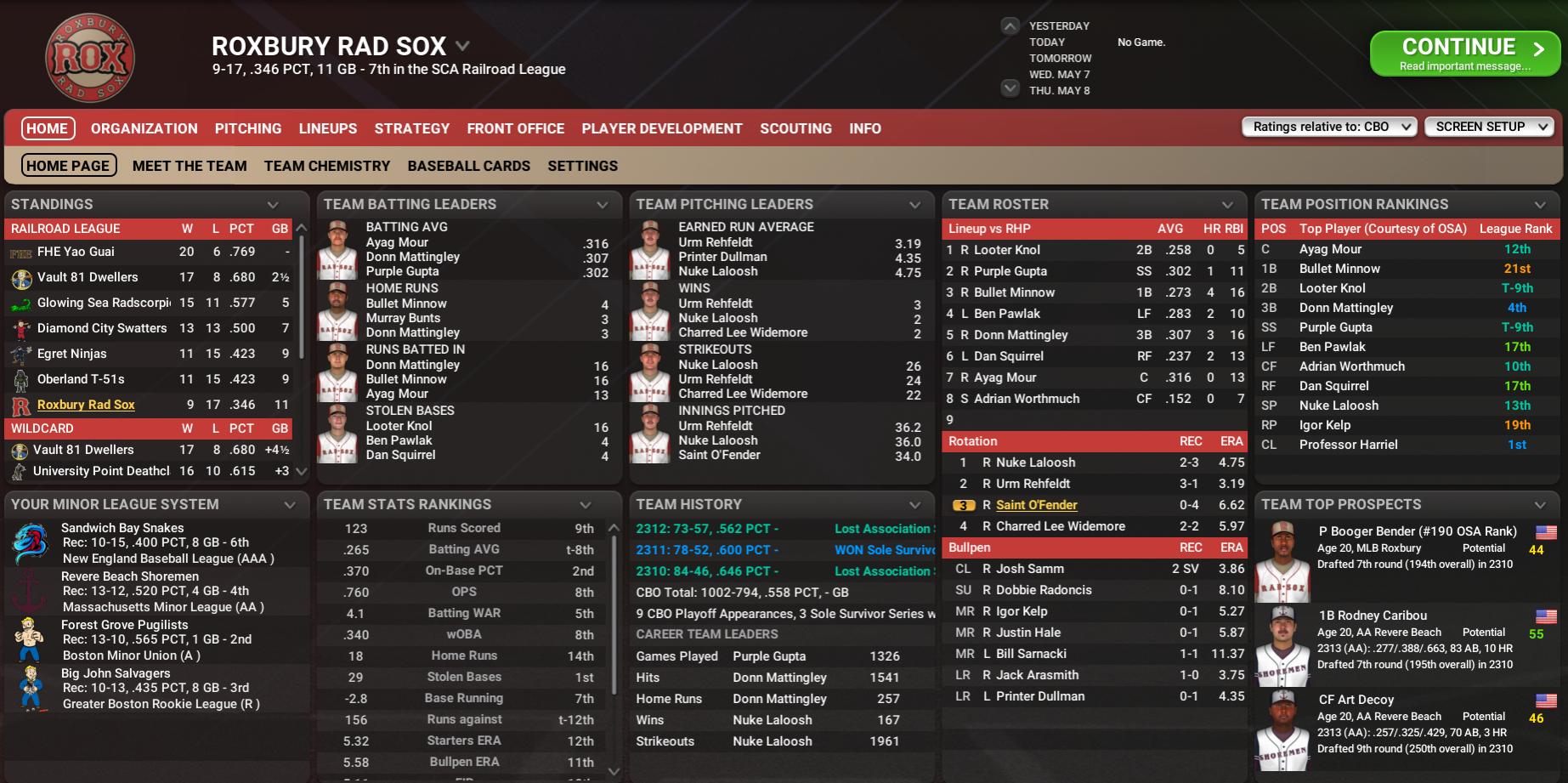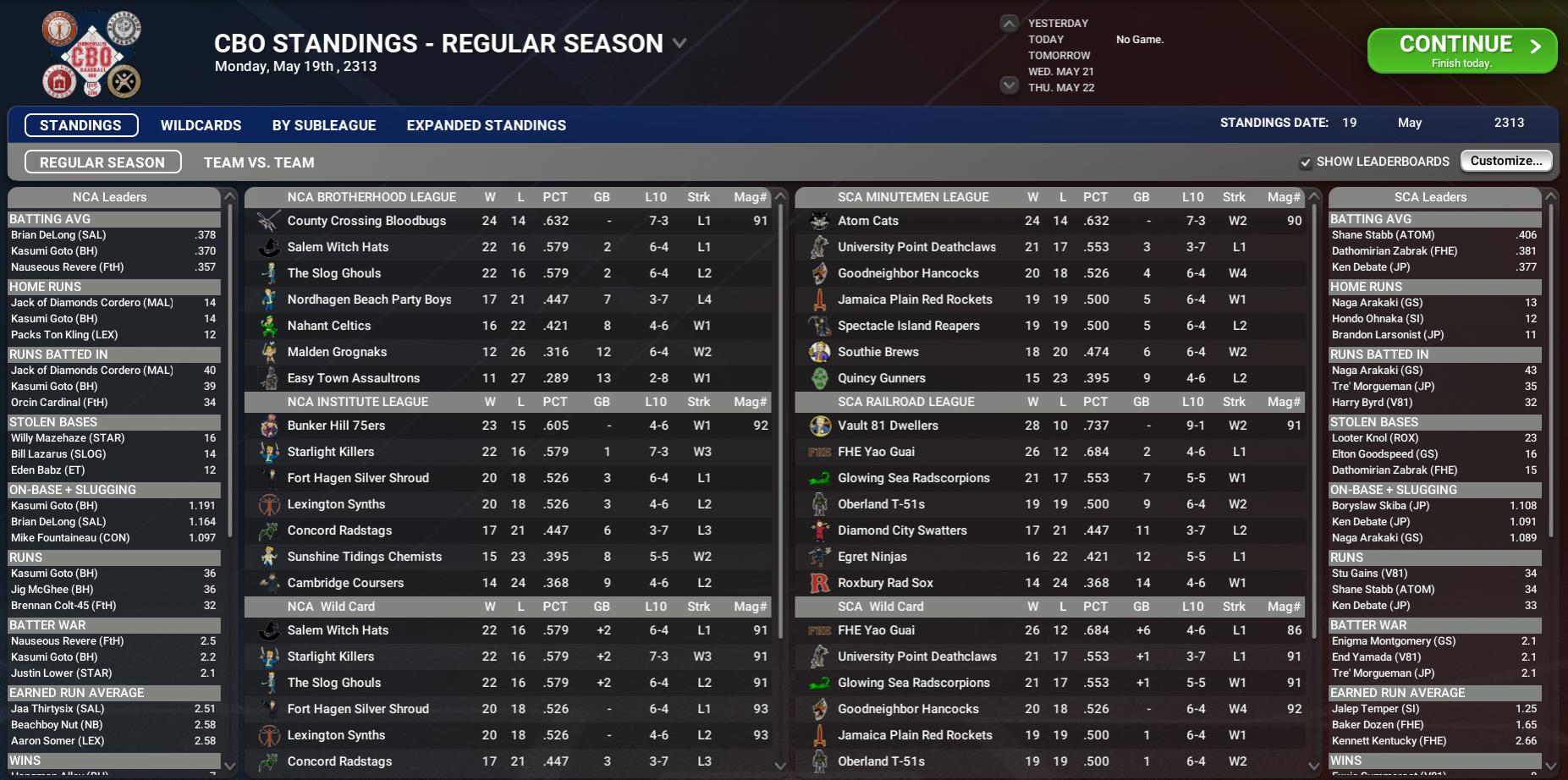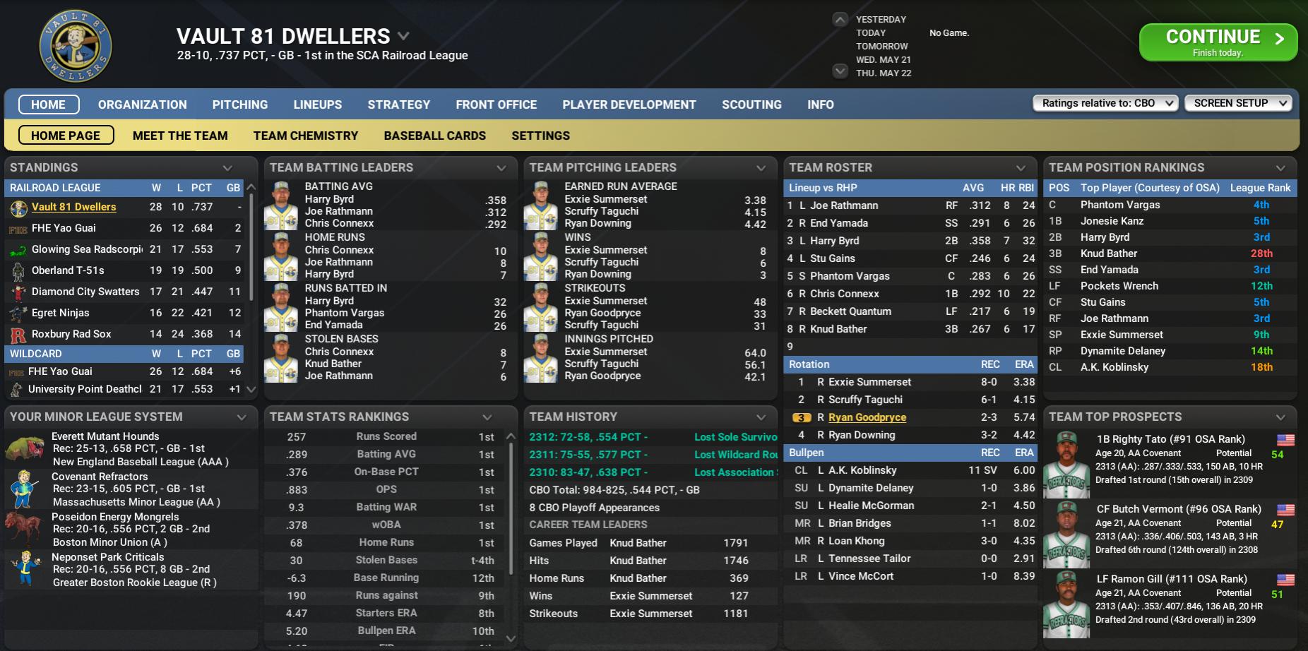 BNN Report News from the CBO, Minors, CCBL, and CYL by Nat Wright-Kawolski 21 April 2313 CBO Analysis The 2313 season has now completed its first two weeks of the regular season, and we are interested in what the full season will hold. Not only did PAM make some interesting predictions, but the start has shown us that this season may end up being completely unpredictable. We are going to approach the breakdown of the leagues with a full breakdown, including a team page look to put the full pulse on each team. We are going to try to mix up the featured teams with their place in the standings, but we also want to feature all 28 teams in the first seven updates. Here are the current team power rankings for Commonwealth Baseball Organization: Teams (Total Points, Tendency): 1) FHE Yao Guai (179.1, o) 2) Bunker Hill 75ers (143.4, o) 3) County Crossing Bloodbugs (129.6, o) 4) University Point Deathclaws (129.6, ++) 5) Glowing Sea Radscorpions (127.6, +) 6) Nordhagen Beach Party Boys (125.6, -) 7) Salem Witch Hats (125.1, ++) 8) Starlight Killers (116.7, ++) 9) Spectacle Island Reapers (114.7, --) 10) Atom Cats (110.7, o) 11) Goodneighbor Hancocks (105.9, +) 12) Quincy Gunners (99.8, --) 13) Vault 81 Dwellers (98.8, +) 14) Fort Hagen Silver Shroud (92.8, --) 15) Lexington Synths (86.2, ++) 16) The Slog Ghouls (83.2, -) 17) Diamond City Swatters (71.3, ++) 18) Jamaica Plain Red Rockets (71.3, ++) 19) Southie Brews (66.3, -) 20) Sunshine Tidings Chemists (66.3, -) 21) Cambridge Coursers (65.3, --) 22) Concord Radstags (64.3, --) 23) Oberland T-51s (63.3, --) 24) Roxbury Rad Sox (50.4, -) 25) Egret Ninjas (49.4, --) 26) Nahant Celtics (35.6, --) 27) Easy Town Assaultrons (31.6, -) 28) Malden Grognaks (18.7, o) Brotherhood League There is a two-way tie between the Nordhagen Beach Party Boys and County Crossing Bloodbugs. The Slog, Salem, and Nahant, predicted to be the top three teams in the standings, are currently 4th, 3rd, and tied for 5th, in that order. The Celtics are tied with Easy Town, while Malden has sole possession of 7th place. The Assaultrons, Celtics, and Grognaks are also all at the bottom of the CBO standings. The Boys are atop the Brotherhood League yet again. Yes, we know the season is young, but Nordhagen Beach is already doing great statistically, currently 4th in runs scored (82) and 6th in runs against (65). Rookie LF Slammin' Sammy Holloway (.340/6/15) has been the early team leader. Three other players hitting over .300 are CF Sting McGee (.327/0/6), LF Gorgeous DiGiacomo (.381/7), and 2B Pointie Shroud (.350/0/3). On the mound, the top three starters have all begun the season doing well: Beachboy Nut (2-1, 3.00), Deedee Martinson (1-0, 3.32), and Ugio Church (2-1, 4.72). CL Yank Daley (4 SV, 7.71) has struggled to get outs. Institute League It's not the defending champions holding the NCA's top record, but Bunker Hill at 10-3. After getting upset in the Wildcard Round last season, the 75ers are coming out hoping to create their own success. Starlight and Fort Hagen are the other two teams above .500 with Lexington alone in 4th and the three-way tie for 5th among Cambridge, Concord, and Sunshine Tidings. The 75ers are the premier offense to start the season, leading in runs scored (101) while allowing a lot of runs (71, 8th) in high-scoring affairs. The early star for Bunker Hill has been LF Kasumi Goto (.429/6/21) with additional power help from 1B Zod Gaycey (.282/5/15), SS Aaron Squire (.273/5/11), and 3B Cave Dweller Bourgeois (.304/4/20). Ace SP Jason Tonelli (1-0, 8.00) has struggled early on, though he has benefited from the high run support. SP Max Thunderdome (1-0, 2.95) and SP Hangman Alley (2-0, 3.78) have done quite a bit better. Minutemen League University Point has sprinted out to an early one-game lead over both Atom and Spectacle Island. Goodneighbor and Quincy are also above .500. Jamaica Plain and Southie are tied for last place. Both looked to be promising teams in the preseason, but have struggled to get wins to start 2313. The Reapers are a team still looking to find their true success on the island since moving from Warwick. If they are going to maintain success, they will need to build their statistical consistency better. Spectacle Island is 13th in runs scored (56) and tied for 6th in runs allowed (58), showing they are being outscored despite the winning record. The standout so far has been SS Nippy Ben Nippolt (.415/2/10), who, as a second-year player has outshined so far last year's top rookie, RF Esau Babz (.327/3/7). LF Hondo Ohnaka (.391/4/9) has also started out well. On the mound, ace SP Jalep Temper (2-0, 0.53) looks as though he wants a Vim! Pitcher Award. SP Brent Hooker (1-1, 3.86) and SP Josh Calvit (2-1, 3.31) have started well. CL Kelvin Brown (6 SV, 0.00) has been perfect thus far. Railroad League FHE has been nearly perfect, starting 12-1 with its sole loss coming last week at Roxbury. Glowing Sea and Vault 81 are the only two other teams above .500. Oberland, Diamond City, Egret, and Roxbury have all struggled early in the season. The Ninjas and Sox are tied for the SCA's worst record at 4-9. The Radscorpions are excited about their early start to the 2313 season at 9-4, tied for the 2nd-best record in the SCA. Currently, the Scorpions are 3rd in runs scored (84) and tied for 2nd in runs allowed (46). Two players are hitting above .400: RF Naga Arakaki (.431/7/23) and 3B Quay Swimmer (.429/4/12). Swimemr and Arakaki have now each won the SCA Player of the Week in the first two weeks, as we will feature below. At an average of 1.77 RBI per game, Arakaki is on pace for 230 RBI, which would shatter Barker Cocoa's record of 155. On the mound, all four starters have ERAs below 4.00: Tony Vampire Frazier (1-0, 2.04), Ryan Dennislynch (3-0, 2.25), Oliver Oil (1-0, 3.14), and Swimmer (0-1, 3.26). In the bullpen, both RP Thrifty Tony Malacara (1-0, 0.00) and Mar Gotfenning (0-0, 0.00) have been efficient in over 10.0 combined innings. CBO S