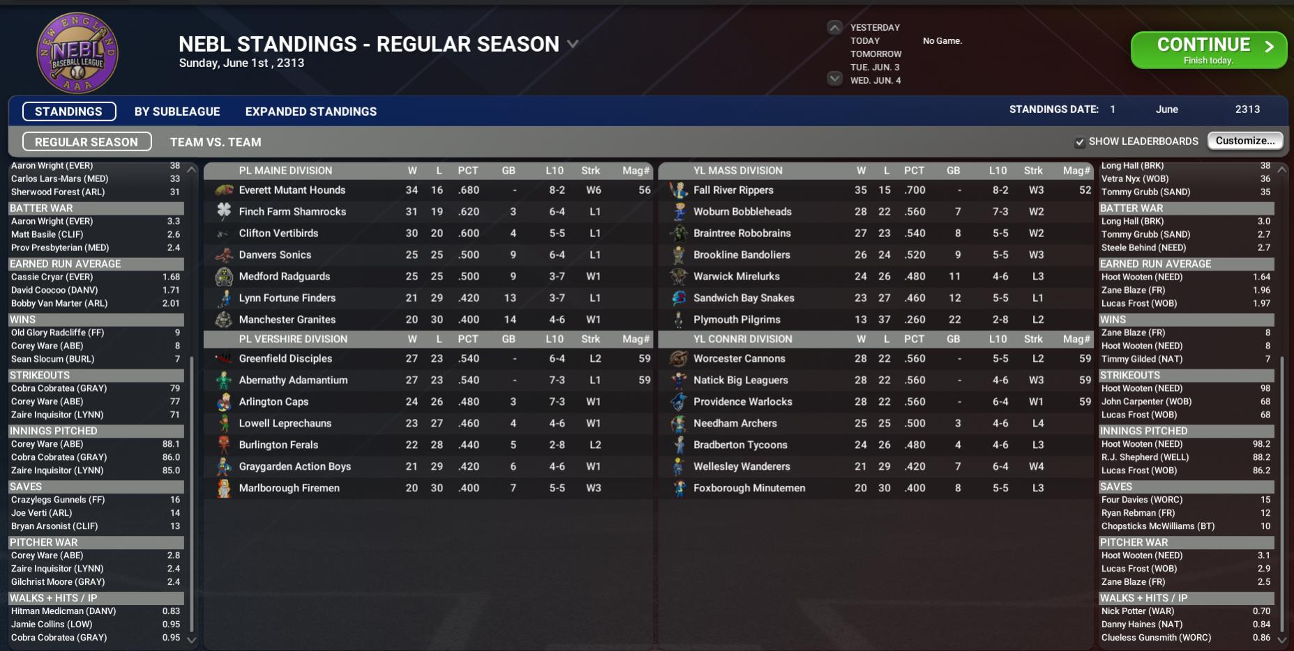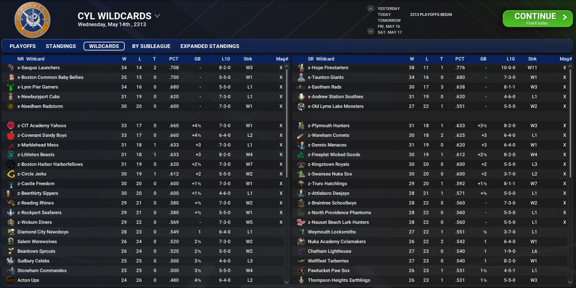 BNN Report News from the CBO, Minors, CCBL, and CYL by Nat Wright-Kawolski 14 May 2313 CYL Regular Season Ends Close the book on the Commonwealth Youth League regular season. For most of the ballclubs, it's all over except for the crying. Now attention turns to the playoffs. It will be the best against the best to determine the Commonwealth Youth Series champion for 2313. And it all kicks off soon. The all-important second season is about to begin. Below we have the final standings of the top division winners and wildcards, as well as the playoff tree with the seeds listed below. NR #1 Saugus Launchers #2 Boston Common Baby Bellies #3 Lynn Pier Gamers #4 Newburyport Cubs #5 Needham Radstorm #6 CIT Academy Yahoos #7 Covenant Dandy Boys #8 Marblehead Mess #9 Littleton Beasts #10 Boston Harbor Harborfellows #11 Circle Jerks #12 Castle Freedom #13 Beerthirty Sippers #14 Reading Rhinos #15 Rockport Seafarerers #16 Woburn Diners SR #1 Hope Firestarters #2 Taunton Giants #3 Eastham Rads #4 Andrew Station Southies #5 Old Lyme Lake Monsters #6 Plymouth Hunters #7 Wareham Comets #8 Dennis Menaces #9 Freeplat Wicked Goods #10 Kingstown Royals #11 Swansea Nuka Sox #12 Truro Hatchlings #13 Attleboro Deejays #14 Braintree Schoolboys #15 North Providence Phantoms #16 Nauset Beach Lurk Hunters CYL Statistical Leaders AVG - .442 - RF Darby O'Doherty, Nuka Academy HR - 32 - C Ploop Gomerring, Marlborough RBI - 66 - 1B Pel Petri, Truro WAR - 4.2 - RF Darby O'Doherty, Nuka Academy ERA - 1.03 - SP Izzy Ratishvili, Newburyport SV - 15 - CL Baab Liner, Rockford and CL Garsi Syrania, Salem WAR - 5.4 - SP Dream O'Sullivan, Boston Harbor IP - 106.0 - SP Gerard Michon, Hope K - 148 - SP Branch Kompe, Taunton CYL Records There were no hitting records broken or tied, but there were several pitching records broken or tied. Let's look at those records below: ERA - 1.03 - SP Izzy Ratishvili, Newburyport Cubs - Former record: SP Paul Stains, 1.16, 2305 Win % - 100% - SP Gerard Michon, Hope, 7-0; SP/RP Shaun Behling, Lynn, 6-0; SP John Wonderwall, West Quincy, 9-0; and SP/RP Lenny Addles, Boston Common, 5-0 - Record held previously by 8 other players BB/9 - 0.72 - SP Lane Phrasemaker, Braintree - Former record: SP Swatter Gillette, 1.17, 2312