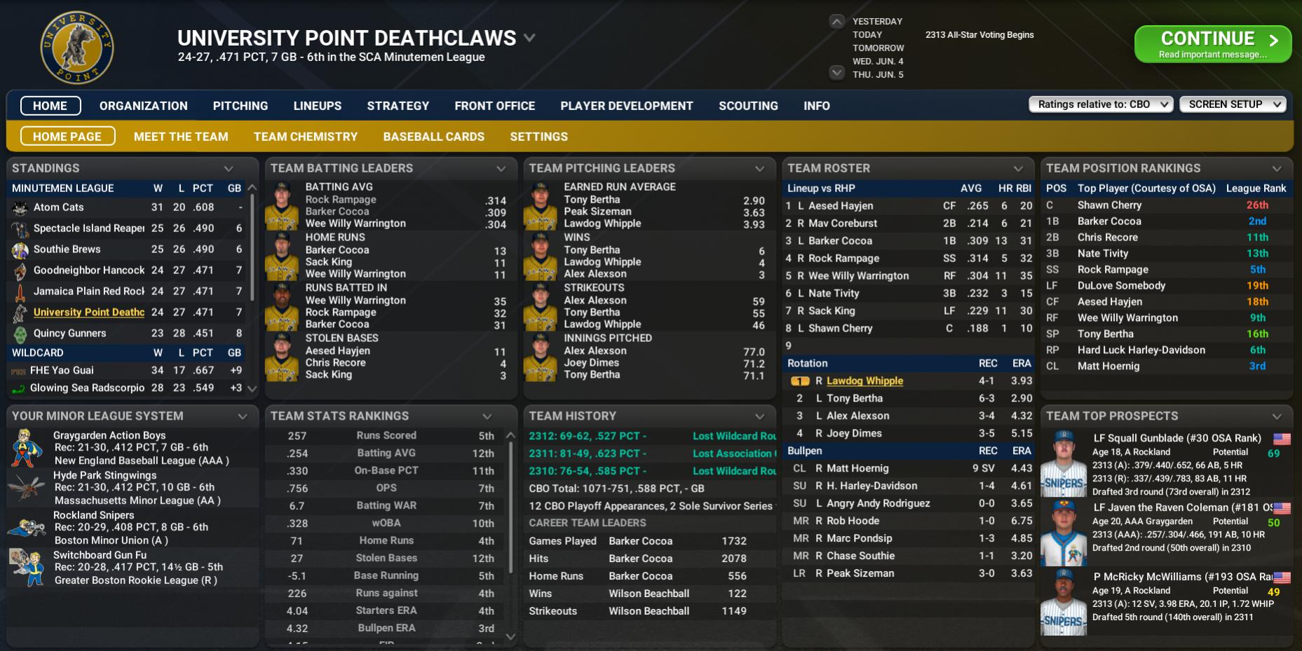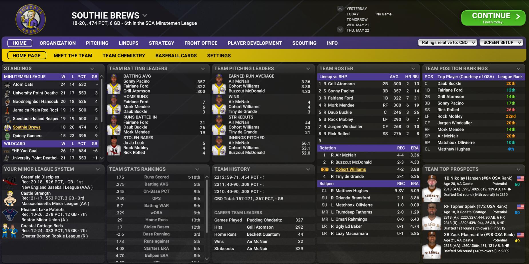 BNN Report News from the CBO, Minors, CCBL, and CYL by Nat Wright-Kawolski 5 May 2313 CBO Analysis We are now a month into the 2313 season, and already we have teams emerging as powers while others are fading away. With most teams playing 26 games, 16 seems to be the magic win number right now for teams doing well with just seven teams in the CBO winning 16 or more games with 20 indicating the most. Likewise, only six teams have lost 16 or more games with 20 being the maximum. Here are the current team power rankings for Commonwealth Baseball Organization: Teams (Total Points, Tendency): 1) FHE Yao Guai (144.4, o) 2) Bunker Hill 75ers (136.6, o) 3) Vault 81 Dwellers (130.4, +) 4) County Crossing Bloodbugs (126.7, ++) 5) Lexington Synths (119.7, ++) 6) University Point Deathclaws (115.7, o) 7) Atom Cats (112.7, -) 8) Glowing Sea Radscorpions (102.9, --) 9) Salem Witch Hats (100.8, +) 10) The Slog Ghouls (96.8, +) 11) Fort Hagen Silver Shroud (95.8, +) 12) Starlight Killers (91.8, --) 13) Concord Radstags (91.0, +) 14) Diamond City Swatters (90.0, -) 15) Nahant Celtics (86.2, ++) 16) Nordhagen Beach Party Boys (82.0, -) 17) Goodneighbor Hancocks (81.4, o) 18) Egret Ninjas (79.1, ++) 19) Southie Brews (79.1, ++) 20) Jamaica Plain Red Rockets (78.1, ++) 21) Oberland T-51s (76.1, -) 22) Spectacle Island Reapers (72.1, -) 23) Sunshine Tidings Chemists (66.3, o) 24) Quincy Gunners (59.3, --) 25) Roxbury Rad Sox (58.3, +) 26) Cambridge Coursers (56.8, --) 27) Easy Town Assaultrons (50.4, o) 28) Malden Grognaks (40.6, o) Brotherhood League County Crossing is on a five-game winning streak and has gone 7-3 in their last 10 to give themselves a little distance in the BL, while Nordhagen Beach is 2-8 in its last 10 to drop to 4th place. Salem and The Slog join the Bugs as the only teams above .500. Nahant is approaching .500, but Easy Town and Malden look to be out of the race already with the CBO's 27th and 28th-best records. The Grognaks had no hopes of making the playoffs coming into the season, but they did expect to finish around .400. With a current .231 winning percentage, Malden would hold the #1 overall spot in the draft. While that may help them land one of Stonehill College's 2B/SS Finnan Hunt or Northeastern University's 3B Donovan Mackey with the 1st overall pick, it does nothing for 2313. The Grognaks are 13th in runs scored (104) and runs allowed (166). Rookie 3B Jack of Diamonds Cordero (.297/11/29), the 2nd overall pick in the 2312 draft, a surprise that Glowing Sea did not draft with the #1 pick, has been the sole gem on the offense. 1B Andy Stamey (.352/2/10) and 2B Breha Queen (.320/0/5) have both had some hits. On the mound, CL Sanfer Annsiskow (5 SV, 1.04) has been the best pitcher on staff. SP Tyler Whitestag (2-3, 4.07) has been the best starter and only with a sub 6.00 ERA. Justin Horton (1-4, 8.62) has been moved to the bullpen. Institute League Bunker Hill has done what it needs to do to maintain their league lead and hold the NCA's top record by two games over the Bloodbugs. Lexington has been hot, winning three straight and 8 of 10 to hold the 2nd spot at just three games back. Starlight and Fort Hagen are just above .500. Concord, Sunshine Tidings, and Cambridge hold the final three spots. The Synths are playing above their heads early in the season, but that has excited a fanbase that has not seen much success in franchise history having never made the playoffs in the full CBO history. Right now, they are 9th in runs scored (121) and 10th in runs against (134), yet they have the NCA's third-best record. We call that a statistical anomaly, but also an indicator that it is only a matter of time before they falter and start sliding down the standings. As of now, C Danny Enfryz (.351/5/20) has been their most successful hitter with some help from RF Speedy Bugg (.295/6/16) and 1B Eugene Jeep (.283/2/9). On the mound, three starters are doing well: Chase Wede (5-2, 2.79), Aaron Somer (2-1, 2.75), and Kent Rothschild (3-1, 3.56). CL Hunter Kim (8 SV, 2.02) has pitched well out of the bullpen. Minutemen League The ML is a two-team race early with University Point and Atom tied atop the league, while no other team is currently above .500. Goodneighbor, Jamaica Plain, Spectacle Island, Southie, and Quincy are all packed together with just two games separating 3rd from 7th place. Atom is ready to return to the postseason and may have the squad to get there. The Cats are 3rd in runs scored (151) and tied for 5th in runs allowed (117). Longtime franchise standard, 3B Shane Stabb (.429/4/13) has had an amazing start to the season in his 18th season. Other offensive stars have been 1B Actually Aucoin (.307/6/24), RF Candy Kline (.311/5/22), and CF Hickory Dockery (.276/7/17). On the mound, the first two starters, Doug Creep (5-2, 3.40) and Mesquite Williams (3-3, 2.97), have been setting the pace for the team. There has not been a whole lot to speak of in the bullpen, but Melvin Terminator has pitched 10.1 innings with just a 0.87 ERA. Railroad League FHE was flying high but struggled a little recently to hold the CBO's top record by just one game over Bunker Hill. Vault 81 has been a tiny bit better in their last 10, going 8-2, to sit just 2.5 games back. Glowing Sea is still an early success in 3rd place, ending the number of teams above .500. That means Diamond City at 13-13 would be in the playoffs if they started today. Fifth through seventh is Egret, Oberland, and Roxbury, all somewhat surprises in their current state. For the Rad Sox, they may have hit a wall, or they may have just had some early-season bad luck. Right now, the Sox are 9th in runs scored (123) and tied for 12th in runs allowed (156). Ranking 14th in home runs with just 18, Roxbury has not been able to use power to generate runs. 1B Bullet Minnow (.273/4/16) leads in homers. C Ayag Mour (.316/0/13) has the top average on the team. On the mound, the only starter doing well is Urm Rehfeldt (3-1, 3.19). SP Nuke La