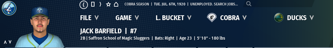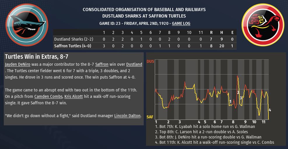 Complete Game Shutouts are the name of the game on opening day as we get three of them: Elijah Shumate (Northlands), Adam Brookshire (Saffron), and Jaxon Darnall (Dustland) all with the honours. Darnall's against the Unicorn Point Athletic Club is probably the best line of the night. ![]() March 31, 1920 The Saffron Turtles and Amelia City Metros play out the first extra innings game of COBRA. The Turtles finally win it in the 15th with a walk-off sac fly by CF Jayden DeNiro. The Metros certainly had their own chance to win it. They loaded the bases in 14th but couldn't get the runs on the board. ![]() April 1, 1920 Turtles-Metros again go to extra innings, and again ends in a walk-off win for the Turtles after the game goes to the 10th. Metros only had themselves to blame, in the 9th an error from LF Lucas West saw the Turtles grab the run they needed to force the extras. ![]() But the big stories was a sudden explosion in hitting. Northlands 3B Oscar Newsome went off for 3 home runs in a 12-11 loss to the Sugar Factory Elephants. Meanwhile, down in the Spice District, Neil Spurrier was doing the same thing against the Falcons, this time in a winning effort. There was also some big hitting in the Ducks 13-3 win over the Broncos. RF Peter Kowalski went 5-6 for the day and C Joel de Vries went 2-3 with two home runs and 3 walks for a 5-RBI haul. April 2, 1920 The Turtles played their third extra-innings game in a row today. This time against the Dustland Sharks. CF Jayden DeNiro was the hero today, going 6-7 for the day with a triple and three doubles. His final hit of the day was a single in the 11th that got C Valentin Folgan to second base. From there, Folgan was able to beat the throw from Right Field when Kris Alcott hit the walk-off single of the game. ![]() April 5, 1920 The first player of the week award goes to Port Magnolia SS Max Roberts who went 15-25 with 2 home runs and 5 RBIs.