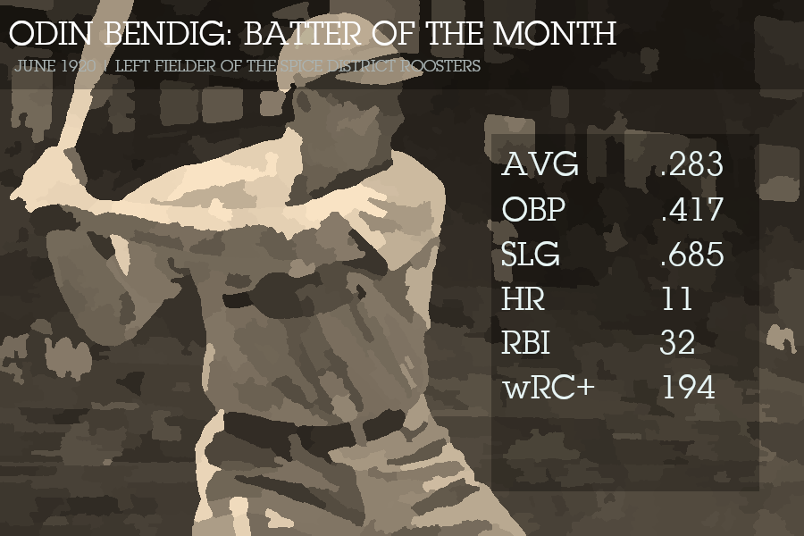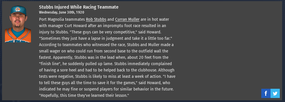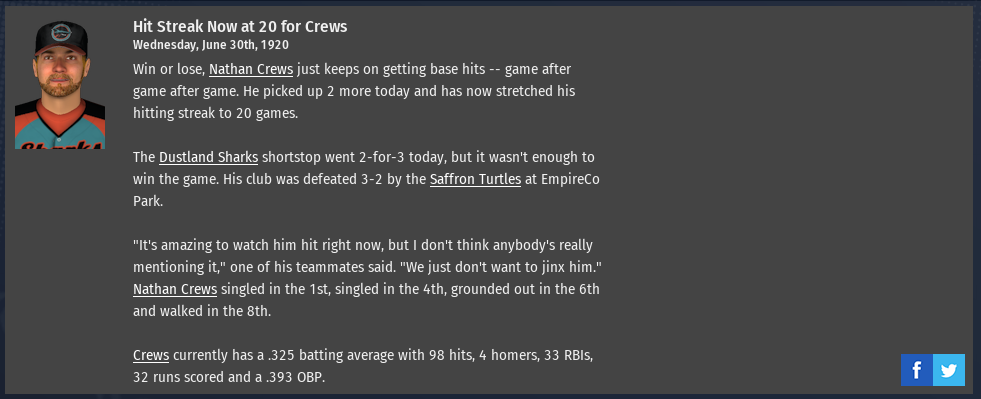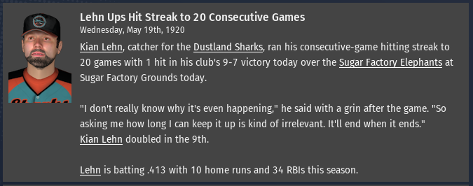 Home Runs We've got three players: LF Odin Bendig (Spice District), 1B Vladik Zavalin (Whiskeytown), and 1B Richard Maxwell (Northlands) on track to hit over 50 home runs this season. Current projections have them getting 57, 52, and 50 respectively. RBIs 1B Vladik Zavalin (Whiskeytown) is on track for 149 RBIs. Hits Two players on track for 200 hits. CF Sean Newton (Sugar Factory) with 211, and 2B Curtis Ripley (Spice District) with 208. Stolen Bases Just one player, CF Thad Pardue (Whiskeytown) is on track for 50 or more. We have him down for 56. 30/30 Club 1B Gabby Williams (Crimson Forest) is a candidate for the 30/30 club. He's on track for 44 stolen bases, it's the home runs that'll undo him. He's currently projected for 28. Pitcher Wins Two on track for 25+ wins. Max Steel (Spice District) with 29 and Jaxon Darnall (Dustland) with 27. Strikeouts 5 Players on track with 350+ strikeouts. Max Steel (Spice District) with 394, Shawn Marsh (Salt Quarter) with 374, Jared Way (Spice District) with 365, and Elijah Shumate (Northlands) with 362 June 30, 1920 In silly news, Port Magnolia's 22 year old 1B Ron Stubbs injured himself in a foot race with a teammate. ![]() And in more interesting news, Dustland SS Nathan Crews has just gone 20 consecutive games with a hit. He's got his eye on teammate Kian Lehn's hit streak record of 23. ![]() As we head into July, this is where the standings sit. Spice District and Saffron keep hold of their leads in the division. In the wildcard stakes, Sugar Factory have put some daylight between themselves and everyone else -- leaving Dustland and Salt Quarter to fight over the last spot. ![]() Two big events in July. The draft will happen early in the month and the trade deadline will finish the month off.