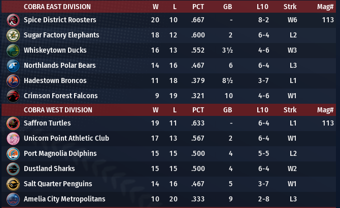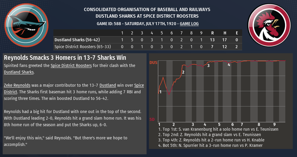 The Dustland Sharks go down 5-2 to the Sugar Factory Elephants but the key news for hit streak fans is that Sharks SS Nathan Crews went 0-4 and thus ending his hit streak at 23 games to tie the record held by his teammate C Kian Lehn. July 8, 1920 The wheels are starting to come off the Saffron Turtles. They've just been swept by the bottom-dwelling Crimson Forest Falcons and are now on a 6 game losing streak that's allowed the Dustland Sharks to tie them in the division with Salt Quarter and Unicorn Point not far behind. July 11, 1920 The Turtles continue their woes as the Sharks displace them for the #1 spot but sometimes you just meet an unstoppable opponent as Unicorn Point's Tijs Oudenkerk sends 17 Turtles packing in a record-breaking performance. ![]() And the Dolphins tried to swim in shark-infested waters and got bit. Wesley Stebbins had a no-hitter go into the 9th until it got broken up by Dolphins SS Max Roberts who sent a line drive single to center field. All of a sudden, Stebbins is leading the league in ERA with 1.63 ahead of teammate Jaxon Darnall's 1.95. ![]() July 16, 1920 The Hadestown Broncos are the first to sign their draft pick with a $12,100 bonus for Thomas Campbell. ![]() July 17, 1920 Zeke Reynolds, 1B of the Dustland Sharks is loving his new lease of life since being traded from the hapless Crimson Forest Falcons. In two successive games he's won player of the game against the Spice District Roosters. Going 3-5 in the first with one home run and then 3-4 in the second with all of those hits being booming home runs in a 7 RBI haul. Over 14 games for the the Sharks, he's nearly had as many at-bats as he did over 44 games for the Falcons and improved his .228/.389/.544 slash line to .259/.375/.741. That bit of offensive muscle has helped the Dustland Sharks get the #1 spot in the West. ![]() July 23, 1920 Down 4, 2 outs, bases loaded, bottom of the 9th. Spice District Roosters 1B Neil Spurrier naturally followed the script and blasted a home run to tie the game up and force extras. But. It wasn't just any home run, it was a grand slam inside the park home run. Spurrier used the walls of Cinnamon Traders Park to bamboozle the Polar Bear outfielders. ![]() Roosters SS Dex Kruys followed it up in the 10th with a walk-off home run (outside the park this time) to win the game for the Roosters. July 30, 1920 The Polar Bears are 4.5 games out of the wildcard spot and will need as many miracles as they can get. Against the Penguins they were down 5-1 going into the bottom of the 9th when they finally figured out to hit. A series of singles got two runs on the board but when RF Jon Jackson came up to bat with two on and two out, he did what he did best (39 home runs for the season so far) and smashed the ball 405 feet for a walk-off home run. ![]() The Standings at the end of July. The Roosters have a firm hold on the East Division while over in the West, an 18-8 record in July from the Dustland Sharks has seen them surge past the Saffron Turtles. The Sugar Factory Elephants seem to have a good hold on the first wildcard spot which leaves Saffron, Northlands, Salt Quarter, and Unicorn Point to fight it out for the last. Only 6 weeks left in the season!