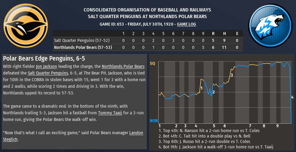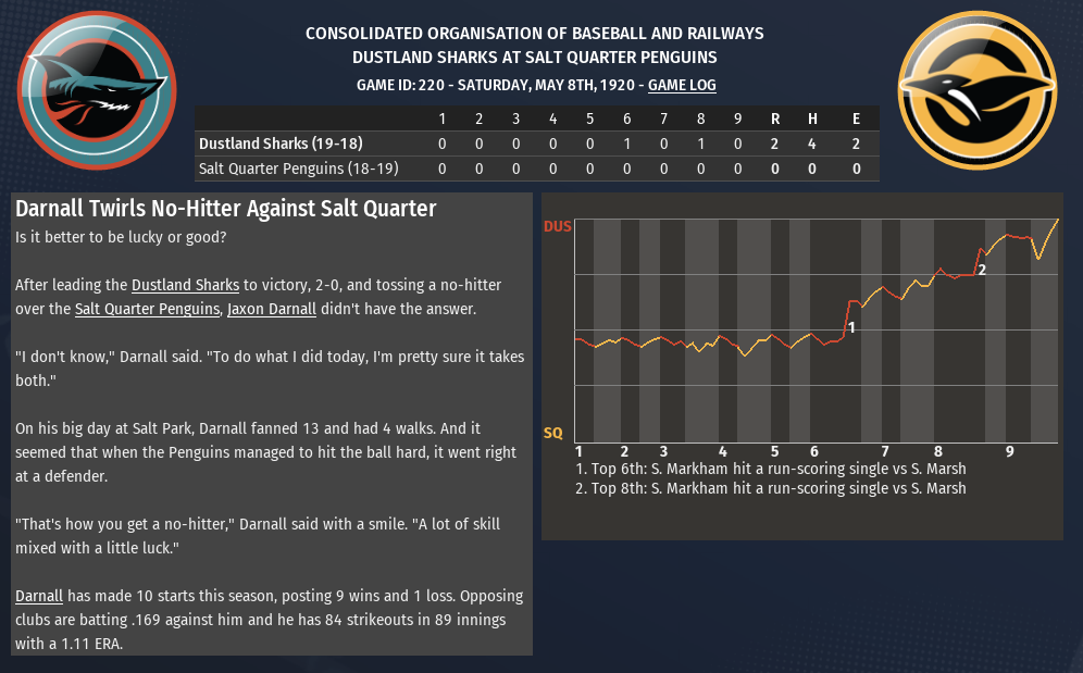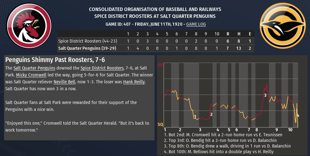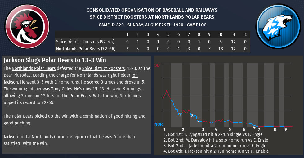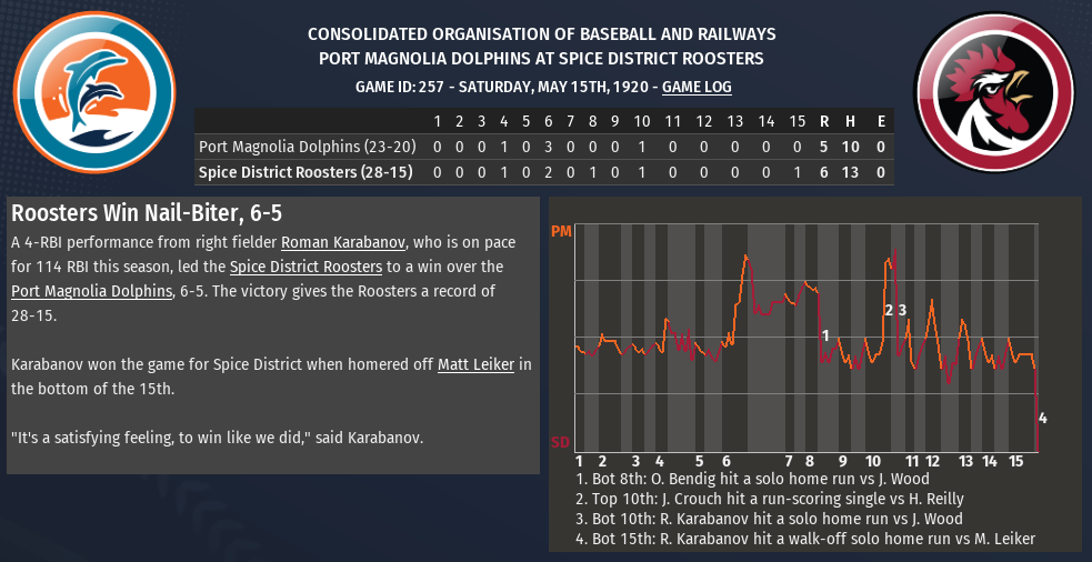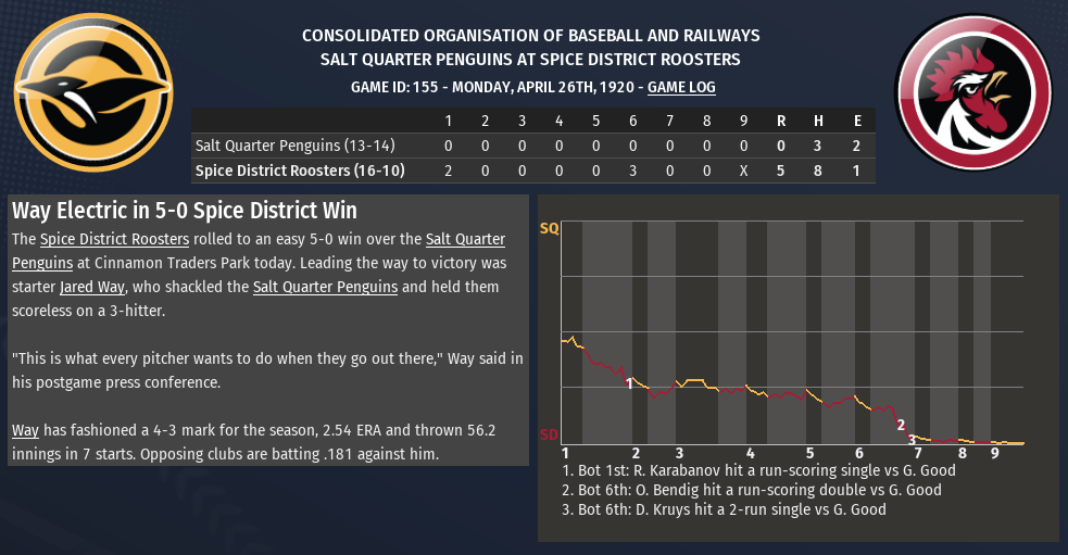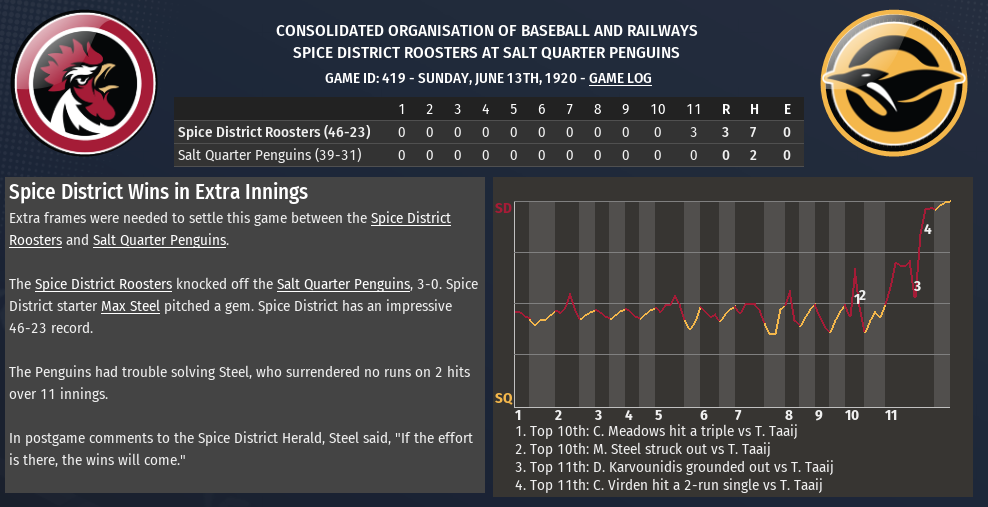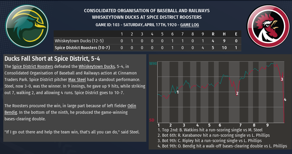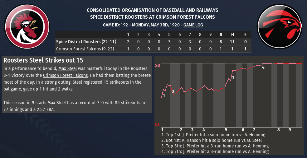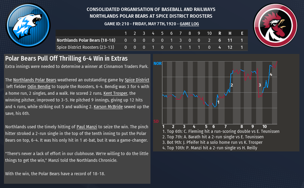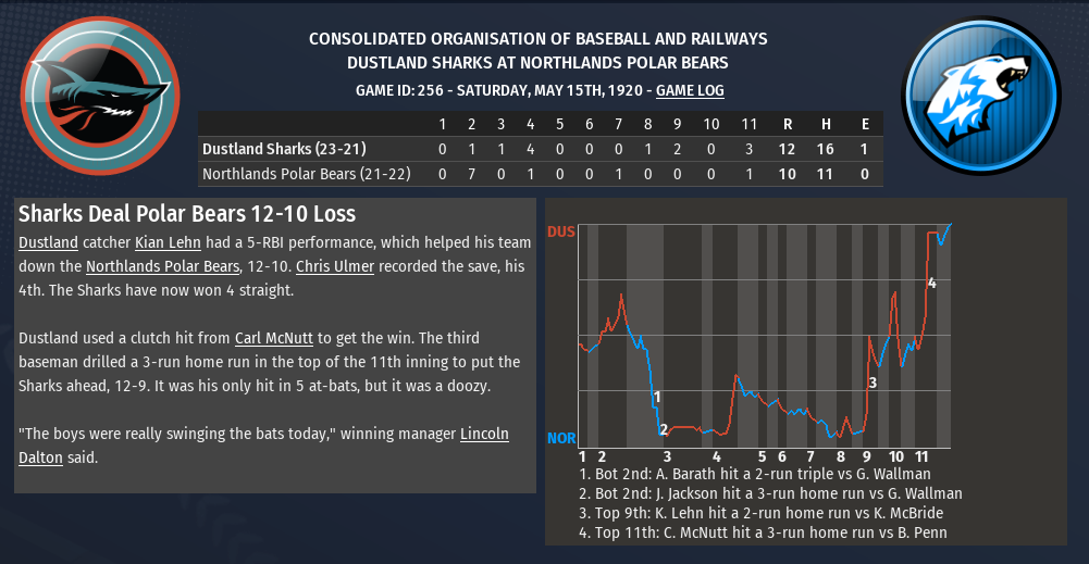 It was a game of drama and home runs when the Whiskeytown Ducks came to the Bear Pit to take on the Northlands Polar Bears. The game started off pretty tame but it suddenly exploded in the bottom of the 5th when Northlands RF blasted a 3-run home run. The Ducks will strike back in the 6th with back-to-back home runs from LF J.R. Shouse and 1B Vladik Zavalin. Zavalin will hit a home run in each plate appearance to come for a three home run game. Unfortunately Zavalin's efforts will be vain. As the game moves to the bottom of the 9th, the Ducks hold a 9-8 lead over the Polar Bears but the inning kicks off with the man who started the home runs getting his second of the night to tie the game up. The Bears load the bases and it all it takes is a Paul Manzi single for the walk-off. ![]() And, Joel De Vries' hit streak record is no more as Amelia City's SS Levi Days gets his 15th in a row in a loss to the Dustland Sharks. The hit streak doesn't bring the Metros any luck, they're 5-10 so far. 2 May, 1920 And the moment I mention something, I jinx it. The Amelia City Metros picked up a 6-5 win in extras against the Dustland Sharks but Levi Days failed to get a hit. 4 May, 1920 Two big efforts from pitcher Max Steel and CF Johnny Pfeifer propelled the Spice District Roosters to a a big 8-1 win over the Crimson Forest Falcons. Both teams got themselves a lead-off home run but that was the last hit and run that Max Steel would give up that evening as he ripped the Falcons batting order apart with a 15K performance. On the other side of the ledger, after getting that first home run Johnny Pfeifer just kept on going with 3-run home runs in the 5th and 7th to cap off a 7 RBI game. ![]() 7 May, 1920 Paul Manzi is becoming something of a cult hero in Northlands. The 28 year old Right Fielder has yet to start a game but it was just a week ago when he hit a walk-off single against the Ducks. Here it's the top of the 10th against the Roosters and the bases are loaded, again. He jumps on the first pitch he sees and slips a single in between the 1st and 2nd baseman to get the winning run home. The throw from the Roosters Right Fielder not getting there in time. So, here's a Paul Manzi fact. He's got a 1.36 WPA at the moment. The only other Northlands player with a higher WPA is Jon Jackson with 1.55. The difference? Jon Jackson has had 164 plate appearance, Paul Manzi 19. ![]() To top off the bad news for the Roosters. They've lost their star 3B Tommy Glass to injury. He's expected to miss 4-5 weeks. 8 May, 1920 Fresh off winning pitcher of the month. Jaxon Darnell has made a serious statement for the May prize as well as he pitches the first no-hitter of COBRA against the Salt Quarter Penguins. It's not without a little bit of controversy though as at least one columnist from the Amelia Daily Times makes the case that those errors could have easily been classified as hits. ![]() ![]() Here's where the standings lie at the end of 8 May!