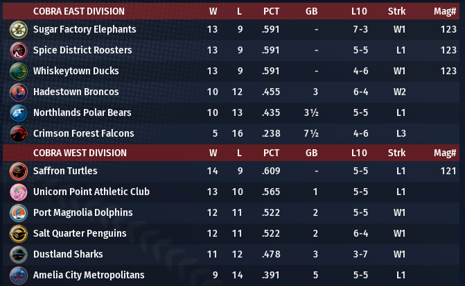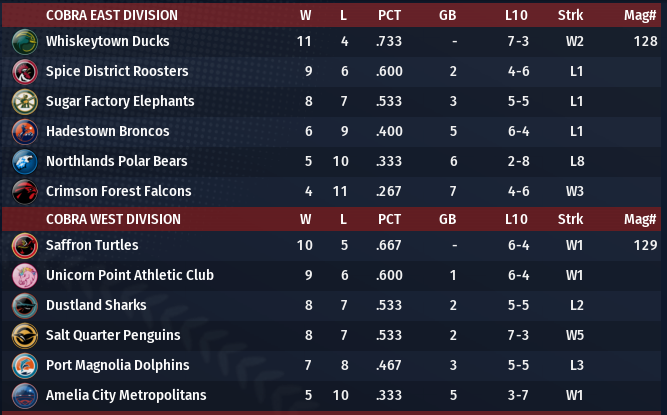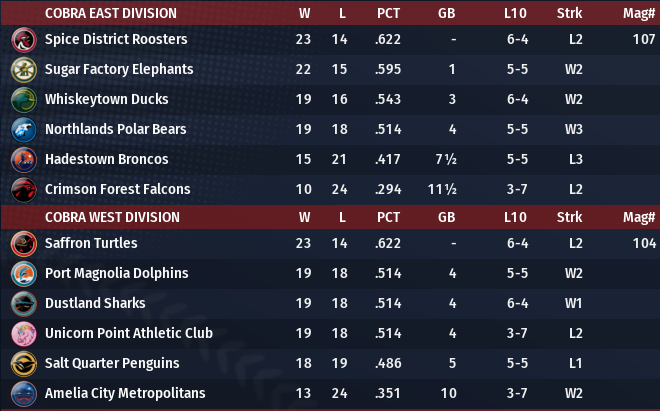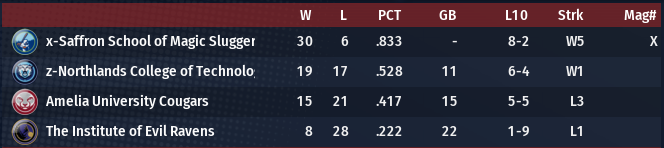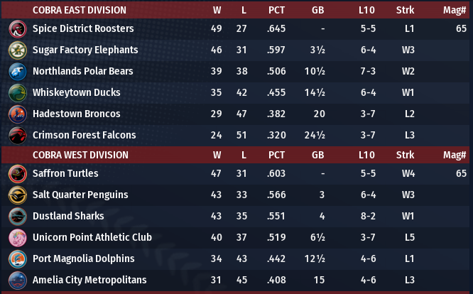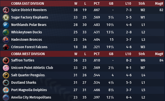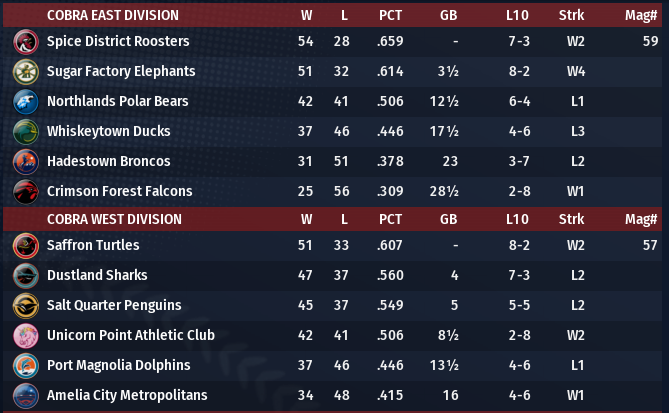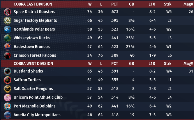 Attention has turned to high school baseball this week as the regular season wraps up and a three game final begins. The participants this year were Crimson Forest High School and Southern Salt Quarter Academy who had a hold on the top two positions for the majority of the season. ![]() Crimson Forest won big in the opening game but the Southern Salt Quarter Academy struck back with an extra-innings victory in game two. SSQA's SS Alwin Weisen almost had a perfect Homer Simpson moment with a run-scoring hit by pitch to put them up by one. Sadly, I think it needs to be a walk-off hit by pitch to count. ![]() With a game three forced, it wasn't looking great for the Crimson Forest Lions but a big 7th inning got them over the line to become the first Amelia High School champions. Most of the most promising players aren't seniors yet so expect names like Ozzy Maricic, Chase Lambert, Dallas Nolt, Austin Pendleton, and Grayson White to take a while to take some time to percolate before they make their way into COBRA. May 24, 1920 Any catcher fans out there? You're about to be devastated. Whiskeytown's Joel de Vries is out for 5 weeks with a fractured hand sustained when he was hit by a pitch. The Ducks currently sit at 23-27, and that kind of absence from their star player has pretty much put an end to any playoff hopes. Dustland Catcher Kian Lehn's hit streak is over at 23 games. He went 0-2 with two walks against the Spice District Roosters in a loss. Final news for today: the Penguins and Falcons battled it out for 21 innings today! We can blame and thank Salt Quarter's LF Ernie Morris, blame him for hitting the home run that tied it up in the 7th and then thank him for hitting the home run that finished it all off in the 21st. Salt Quarter put its starters out there in the end, including 5 innings of Dimitri Balanchin who was awarded player of the game for his pitching in the death. The 36 year old Balanchin started the season off as a reliever before getting placed in the rotation. Now that he has pitched enough innings to qualify for the ERA title, he is absolutely killing it with a 0.32 ERA and 1308 ERA+ so far. ![]() May 25, 1920 Oh my god the Penguins and Falcons went to the 15th inning today before the Penguins finally walked it off. Salt Quarter's Shawn Marsh pitched 11.1 innings after contributing two in the game yesterday. The only run that he conceded was unearned. That win puts the Penguins into prime position in the West Division (though with an upcoming series against the Saffron Turtles we'll see if they can hold on) May 26, 1920 OK some kind of mania has descended upon the teams of COBRA because four of the six games went to extra innings today. Another featured a walk-off sac fly. The only people who largely went drama-free was the Penguins and Falcons. Luke Benson gets the nod as the best performer in a day full of pitcher duels with his 2-hit 10 inning effort against Hadestown. ![]() May 29, 1920 After dominating the regular season with a 30-6 record the Saffron School of Magic Sluggers have lost the University Championship to the Northlands College of Technology Wildcats. ![]() ![]() Many were calling them the Invincibles after a season of domination but anything can happen in a three game series. Disaster struck the Sluggers early in game three when they lost their star pitcher Ellis Bishop to injury after only three pitches (he was attributed the loss because one of those pitches was a single that eventually turned into a run). The Wildcats pounced and demolished the Sluggers side 15-4 to claim the win and trophy. Will we ever see such a good university side again? Saffron will be losing senior RF Logan Jackson (12 home runs to lead the league) and 2B Jack Barfield (15 steals to lead the league). Juniors SP Ellis Bishop (2.43 ERA to lead starters), SP Alex Vaughn (11-0 for the season) and 1B Jake Buckett (9 home runs and 37 RBIs good enough for third only behind his teammates) may also be tempted by the draft. Two players who will stick around will be closer Carson Turner who put up a 1.24 ERA/1.07 WHIP over his 29 innings for a 500 ERA+. His 10 saves (out of 10 opportunities) was also more than triple anyone else. His efforts at the death were a critical part of the side. Big hitting 3B Kaiden Burchett will also stick around. He's the current front-runner for the MVP prize. The Wildcats will be losing their catcher Daniel Irvine who hit for .398 and provides some critical leadership and outstanding defense at catcher. They will be keeping hold on 1B Ken Weiss who led the league in batting average with .406 Players have until the 5th of June to declare for the draft. The Standings at the end of May. The Roosters have started to cement a nice lead in the East while in the West, the Penguins were briefly top of the table but a 4 game losing streak to finish the month off has them fall to last place and gifts the Turtles top spot back.