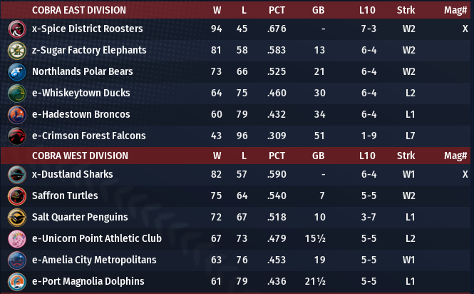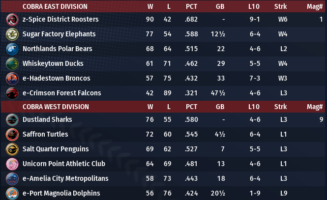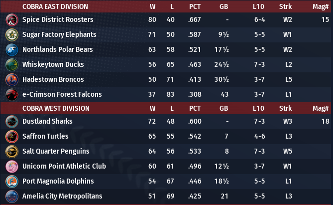 Today, the Whiskeytown Ducks accepted their fate as they were mathematically eliminated. Preseason predictions put them at dead even: 72-72, an impossible mark to achieve for them now as they sit at 62-73. It started off with a bang, 16-13 to kick the year off in March & April. Catcher Joel de Vries was so good, that he got batter of the month but the wheels fell off after that. They went 9-20 in May with de Vries injured late in the month. They lost their early momentum and after losing their best player they finished off the rest of the year 37-40. The bats remained sharp without de Vries, Vladik Zavalin was an absolute force to be reckoned with at First Base. He's currently third in home runs (46) and tied for first in RBIs (126). Plus strong contributions from J.R. Shouse and Gavin Utter. They also unearthed a gem at lead-off with Thad Pardue who leads the league in stolen bases (39, only caught 4 times). Pitching was a problem. Logan Phillips won a trip to the All-Star game but his 4.30 ERA translated to a 8-16 record. That'll need to be the focus for next season if they can hold onto their hitters. August 29, 1920 The Polar Bears haven't given up the fight as the media focuses in on the Turtles and Penguins fight for the last wildcard spot. They took down the league leading Spice District Roosters in an emphatic 13-3 win. Jon Jackson's two home runs in this game also took him to 50 for the season. He's still got a fair bit of heat for the home run title though, Odin Bendig (Spice District) is on 48 and Vladik Zavalin (Whiskeytown) is on 46. ![]() The Turtles and Penguins both suffered a loss today and all of a sudden we've got the Turtles on 73-64, Polar Bears on 72-66, and Penguins on 71-66. Only one spot left as the Sugar Factory Elephants and Dustland Sharks have clinched their spots along with the Roosters. Butts are getting clenched in these clubhouses. August 31, 1920 The Unicorns got smacked around by the Turtles 13-2 today which has spelled the end of their mathematical chance. Preseason predictions had them at 71-73... and they've pretty much achieved that though in all probability they'll end up slightly under. Losing star 3B Dennis Sullenger in early June about doomed them. At that point they'd put up a good record. They were in line for a wildcard spot and everything but Sullenger's injury threw the club into a depression that saw them go 9-16 in June and rendered playoff hopes as a pipe dream. If they had any hope of all, it came from two of their starting pitchers: Tijs Oudenkerk and Liam Schmitt. Oudenkerk could transform into an unhittable beast at times as evidenced by the time he got 17 strikeouts in a game... and then did it again a month later. Out of 35 games that Oudenkerk started, he got 10 or more K's in 15 of them. Unfortunately this brilliance was countered by off nights. There will be days he gives up multiple runs and there's little the rest of the team can do. Ultimately Oudenkerk has a 15-14 record, 3.56 ERA, 1.34 WHIP and 314 K's. Schmitt was a much more level force, he currently sits at an 18-11 record, 3.43 ERA, 1.12 WHIP, and 226 K's. Number one priority for Unicorn management will be to resign 1B Kyle Lownes -- who was their most productive hitter aside from Sullenger and get a decent bullpen behind Oudnekerk. Standings at the end of August. The Turtles are now in a prime position to get that final spot. They've got five games left, with four of them against Salt Quarter. These will be must-win games as the Polar Bears have two games against Hadestown and three against Whiskeytown to finish the season off. ![]()