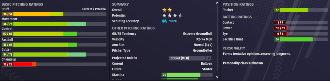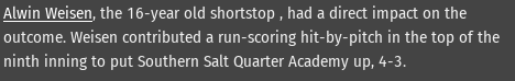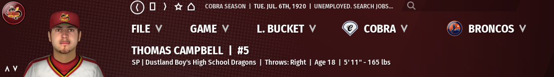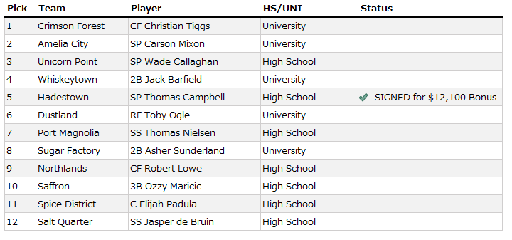 Trade season is upon us folks. We've hit the point where the competition leaders try to shore up their weaknesses and the competition basement dwellers are just trying to salvage something from the season by trading off the olds and bringing in some younger talent for the future. The Crimson Forest Falcons (25-56) were the first to move by sending off 1B Zeke Reynolds to the Dustland Sharks (47-36) in exchange for two minor leaguers. Reynolds is 37 years old, absolutely terrible defensively, and slower than molasses on the basepaths. He can hit though. The Falcons restricted him to a pinch hitting role (they had a preference for the defence and stealing of 23 year old Gaby Williams) where he amassed 143 OPS+ over 72 plate appearances. The Sharks are going to take a gamble on his terrible defense and put him in the starting lineup, hitting cleanup against Righties. Their other first base options: Spencer Quinn and freshly demoted Siem Bork offer more defensively but offered nothing offensively generating 42 and 68 OPS+ respectively. Reynolds, who had made a public demand to be traded back in May is a free agent after this season. The other team throwing in the towel was the Amelia City Metros (34-48) who got two minor league pitchers from the Spice District Roosters (54-28) in exchange for 32 year old Sylas Lang. The league leading Roosters will slot Lang at #3 on their rotation behind two All-Stars Max Steel and Jared Way. July 5, 1920 Draft day. Most of the draft pool is made up of players from the local high school and university leagues but there's a few Amelians in there who played some college ball overseas who've returned home. With the #1 pick, the Crimson Forest Falcons pick CF Christian Tiggs ![]() ![]() ![]() Tiggs attended University in a foreign land and made a strong contribution. He projects out to be an excellent defender and baserunner with strong discipline at the plate. That high work ethic and low greed is just icing on the cake for the Falcons. With the #2 pick, the Amelia City Metropolitans pick Pitcher Carson Mixon from the Institute of Evil ![]() ![]() ![]() The Institute of Evil had a terrible season this year, it certainly didn't help that Mixon got himself injured in in his third game. He probably couldn't have held that 316 ERA+ but he certainly could have helped the Ravens do better than 8-28. With the #3 pick, the Unicorn Point Athletic Club pick Pitcher Wade Callaghan from Whiskeytown Schoolhouse ![]() ![]() ![]() A starter in high school but almost certainly a reliever if he makes to COBRA ball. Even now, he's got more movement on his pitches than the pros. He shows a lot of promise but we'll see if the Unicorns can convince him to give university a skip (he's already been accepted by the Saffron School of Magic). With the #4 pick, the Whiskeytown Ducks pick 2B Jack Barfield from the Saffron School of Magic ![]() ![]() ![]() One of the stars of the supposedly invincible Saffron School of Magic team. Barfield is promising to be an absolute terror on the basepaths but it remains to be seen if he can get that hitting and defense up to COBRA standards. One of his crazier stats from uni was BB/SO ratio. He drew 18 walks but only struck out three times. If he can bring that approach to the big time he could be successful. Barfield won the Great Glove and the Platinum Stick award for second basemen this year. With the #5 pick, the Hadestown Broncos pick Pitcher Thomas Campbell from Dustland Boy's High School ![]() ![]() ![]() Hadestown management going for a big gamble by using their first round pick on a high school kid with injury problems. Campbell missed most of the season with injuries but we did get to see a glimpse of his promise in his final game for his school where he threw 8 innings of shutout ball on the way to a 2-0 win for his team. Rest of Round One...
