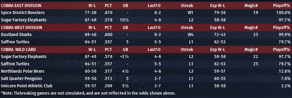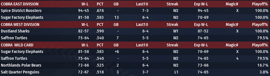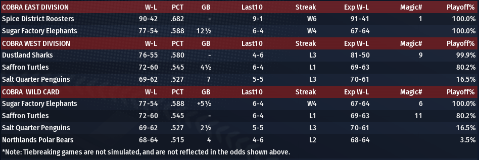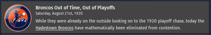 As the Salt Quarter Penguins walked it off against the Unicorn Point Athletic Club, the Saffron Turtles found themselves useless against Jaxon Darnall's slider as he pitched a complete game shutout against them. The pair of results meant that the Penguins and Turtles were tied for the last wildcard spot at 69-59 apiece. Also lurking was the Northlands Polar Bears at 67-62. ![]() Remaining games for the teams are: Saffron Turtles (69-59) 3x games @ Crimson Falcon (42-86) 3x games vs Spice District (86-42) 3x games @ Port Magnolia (56-73) 3x games @ Unicorn Point (62-67) 4x games @ Salt Quarter (69-59) Salt Quarter Penguins (69-59) 3x games @ Hadestown (54-75) 3x games @ Sugar Factory (74-54) 3x games @ Dustland (76-52) 3x games vs Amelia City (58-70) 4x games vs Saffron (69-59) Northlands Polar Bears (67-62) 3x games @ Unicorn Point (62-67) 3x games @ Port Magnolia (56-73) 3x games vs Spice District (86-42) 3x games @ Hadestown (54-75) 3x games @ Whiskeytown (57-71) The Salt Quarter-Saffron matchup at the end of the season is looking very promising! August 20, 1920 An incredible comeback victory for the Hadestown Broncos against the Penguins was mildly undercut with the news that they had been mathematically eliminated from playoff contention. Down 6-2 going into the bottom of the 9th, the Broncos stunned the Penguins when SS Luke Boyer -- with a 55 OPS+ for the season -- blasted a three run home run into the crowd. The next guy gave it a swing and miss for the second out but the final out remained elusive and a series of singles eventually resulted in winning runs for the Broncos. ![]() But alas, walk-off heroics aside, the Broncos become the second team to be eliminated. Pre-season predictions were never high on them, only predicting a 64-80 season, a mark that's still within reach if they end the season well. Losing ace Dalton Deschenes for 4 months killed the season for them before it barely begun. #2 Jackson Woods put in a stellar season for them, and was rewarded with a trip to the All-Star game for it but no one else on the staff stepped up. The top contributor with the bat was 3B Lenny Johnson who hit .323/.378/.496 with 16 home runs over the season. Good enough for a 114 OPS+. He's popular with the fans and management have signed him up until the end of the 1926 season, so we can expect a lot more positive contributions from him for the Broncos in the coming years. ![]() August 23, 1920 Two more teams achieve mathematical elimination: The Amelia City Metropolitans and the Port Magnolia Dolphins. The Dolphins were predicted to get a 64-80 record -- still technically possible but unlikely to happen at this point. Their bats simply failed to fire this season as they sit near the bottom in all the offensive categories. SS Max Roberts tried his hardest with a contribution in about everything: Offensively (141 OPS+), defensively (+0.4 ZR at Shortstop), and on the basepaths (13 stolen bases with a 1.0 BSR) -- good enough to lead the league in WAR for a significant part of the season. But baseball is about more than one guy, and the losses piled up around him. Pitching was a bit better but still only middle-of-the-road. They got an all-star performance out of Kellan Sullivan who put up a 16-13 record, 2.88 ERA, 1.15 WHIP, with 241 strikeouts. They also did well without closer Kirk Swinson, who spent most of the season injured. 24 year old Matt Leiker stepped up to the plate and got a trip to the all-star game as a reward. Hopes were a bit higher for the Amelia City Metros, pre-season predictions put them at 71-73 but they'd need to win everything from here on out to achieve that. They got a good contribution out of 2B Doug Dale -- when he wasn't injured -- he went .356/.444/.599 with 13 home runs and 30 doubles. As a bonus he walked (45) more often than he struck out (31). Unfortunately he won't even get to 100 games for the season and when he was missing, it was a big hole to fill. Jeremiah Hinton put in some good on the pitching side with a 13-13 record, 3.52 ERA, 1.16 WHIP, and 313 strikeouts. Though there is a strange story about the guy currently #3 in the Metro's rotation: Emmanuel Seward. Seward was a 21 year old minor leaguer in the Dustland system but Crimson Forest acquired him as part of the Zeke Reynolds trade. He played one game -- against the Metros -- before being traded to the Metros. Supposedly they were impressed. The young player has then gone on pitch some brilliant complete game shutouts and then get completely shelled in the next. Time will reveal if he can harness that ability. Here's where we sit right now. The Roosters are the first to secure a playoff spot. Dustland and Sugar Factory can't be too far behind. The Turtles swept the Falcons while the Penguins got swept the Broncos in their latest series so a decent gap has opened up for the final wildcard spot. ![]()