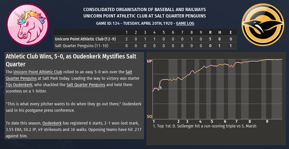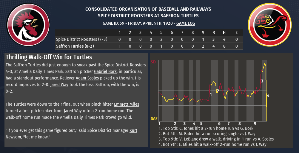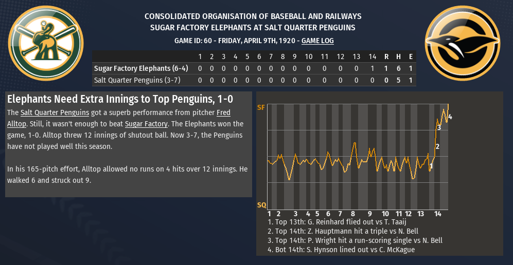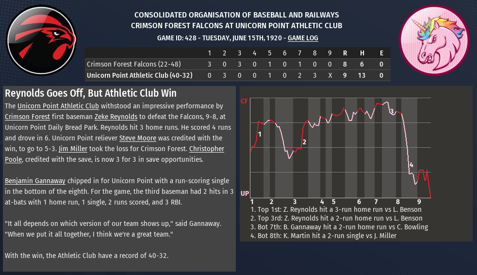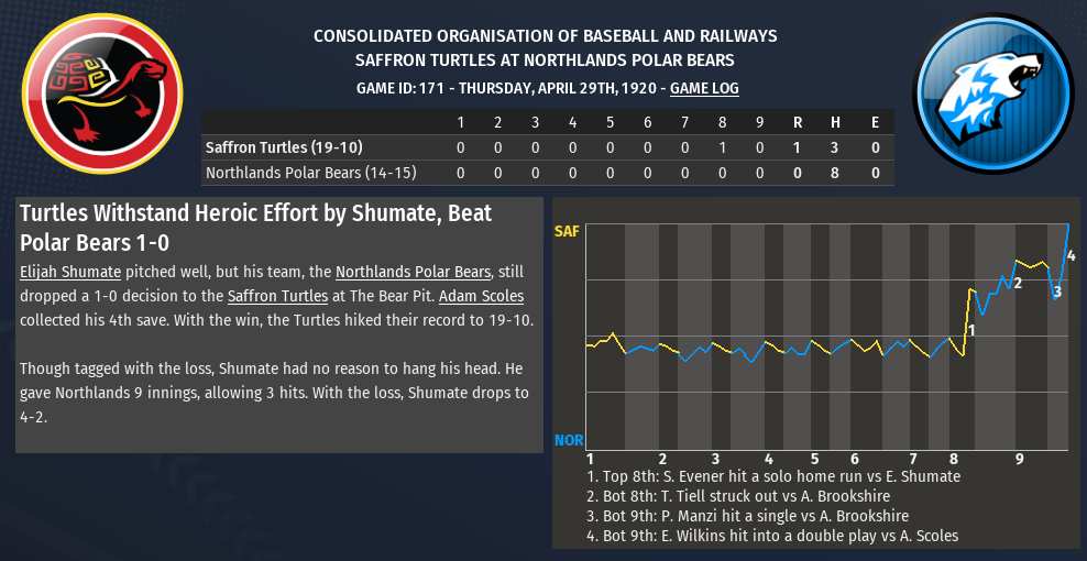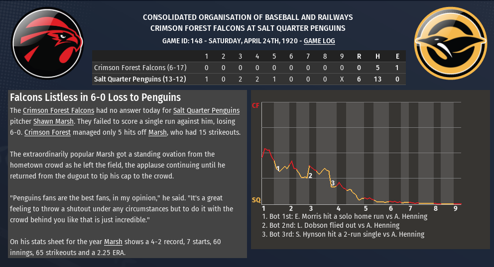 Penguin Pitcher Fred Alltop was left devastated after throwing 12 shutout innings against the Elephants. The Penguin hitters completely failed to fire. Alltop threw 165 pitches and gave up just 4 hits and 6 walks before being pulled with the score still 0-0. The Penguins gave up the winning run a couple of innings later. Alltop had thrown 8.1 shutout innings in the previous game as well. Throw in an extra inning from the game before than that and he's suddenly gone 21.1 innings without conceding a run. ![]() The Crimson Forest Falcons after starting the season 0-9, have a win! They beat the equally hapless Metros (2-8 after this game) to break their losing streak to start the season. Finally today. Just look at this WPA graph fall. Beautiful. The Roosters thought they had in the bag when they got the go-ahead run at the top of the 9th but they didn't account for big hitting pinch hitter Emmett Miles who slammed the first pitch he saw for 405ft and the win. That's the fourth walk-off win the Turtles have had so far this season, in only ten games. April 10, 1920 Absolute destruction. The Unicorns were helpless against Whiskeytown pitcher Lenny Russell who threw 9 innings of one-hit, one-walk shutout ball. The no-hitter only broken up in the 8th. ![]() April 11, 1920 The Hadestown Broncos have started the season off 4-7, and any hopes of turning that around just got a bit more remote. Their star pitcher Dalton Deschenes is out for the next four months. He left his last game early after pitching 5 shutout innings. The Broncos got the win there and Deschenes won player of the game. April 13, 1920 Last time we saw Jared Way, he was getting walked off by Emmett Miles. The Unicorn Point Athletic Club paid the price in his next start as he racked up 15 strikeouts enroute to a 2-1 win for the Roosters. ![]() Standings at the end of April 14, 1920.