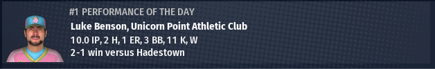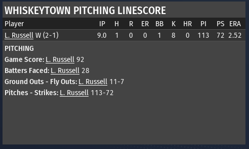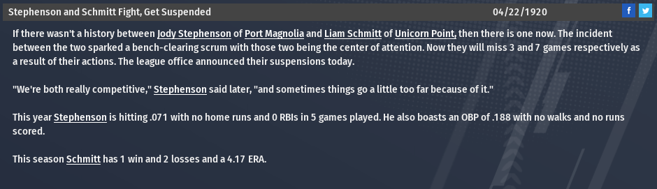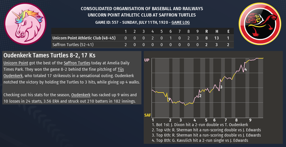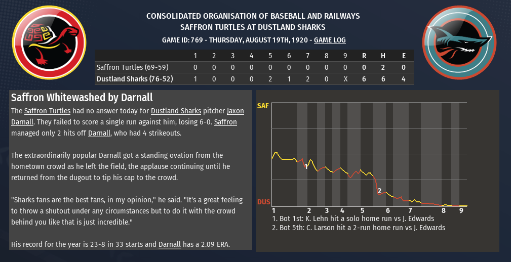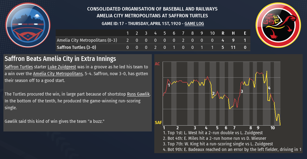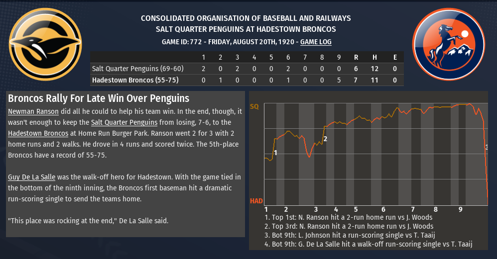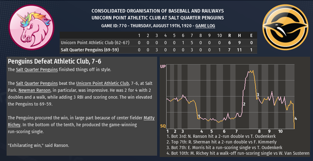 Penguin Pitcher Fred Alltop was left devastated after throwing 12 shutout innings against the Elephants. The Penguin hitters completely failed to fire. Alltop threw 165 pitches and gave up just 4 hits and 6 walks before being pulled with the score still 0-0. The Penguins gave up the winning run a couple of innings later. Alltop had thrown 8.1 shutout innings in the previous game as well. Throw in an extra inning from the game before than that and he's suddenly gone 21.1 innings without conceding a run. ![]() The Crimson Forest Falcons after starting the season 0-9, have a win! They beat the equally hapless Metros (2-8 after this game) to break their losing streak to start the season. Finally today. Just look at this WPA graph fall. Beautiful. The Roosters thought they had in the bag when they got the go-ahead run at the top of the 9th but they didn't account for big hitting pinch hitter Emmett Miles who slammed the first pitch he saw for 405ft and the win. That's the fourth walk-off win the Turtles have had so far this season, in only ten games. April 10, 1920 Absolute destruction. The Unicorns were helpless against Whiskeytown pitcher Lenny Russell who threw 9 innings of one-hit, one-walk shutout ball. The no-hitter only broken up in the 8th. ![]() April 11, 1920 The Hadestown Broncos have started the season off 4-7, and any hopes of turning that around just got a bit more remote. Their star pitcher Dalton Deschenes is out for the next four months. He left his last game early after pitching 5 shutout innings. The Broncos got the win there and Deschenes won player of the game. April 13, 1920 Last time we saw Jared Way, he was getting walked off by Emmett Miles. The Unicorn Point Athletic Club paid the price in his next start as he racked up 15 strikeouts enroute to a 2-1 win for the Roosters. ![]() Standings at the end of April 14, 1920.