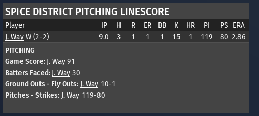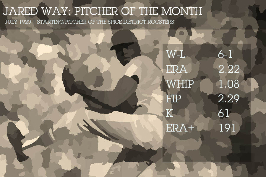 ![]() Fun fact. Jon Jackson hit more home runs in July than May and June combined. That sudden explosion in home run power has seen him shoot up the home run and OPS charts to 3rd place in both. One of his best home runs came just a couple of days ago when he hit a 3-run walk-off home run against the Penguins. ![]() When it comes to pitching the Roosters is normally the Max Steel show but he had to take a back seat for Jared Way this month. Funnily, this month isn't much out the ordinary for Way. He's put up numbers like this every month but it's nice to see some recognition go his way.(PUN INTENDED. ALWAYS INTEND YOUR PUNS KIDS)