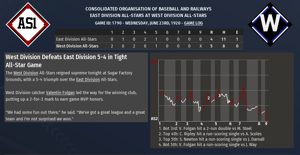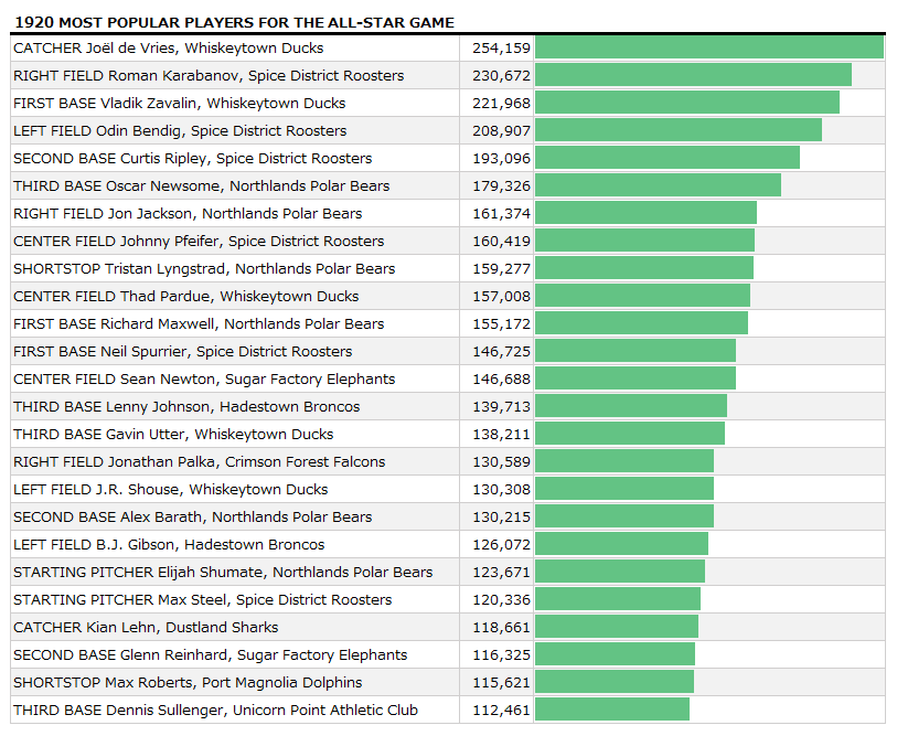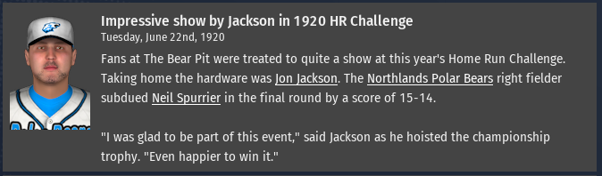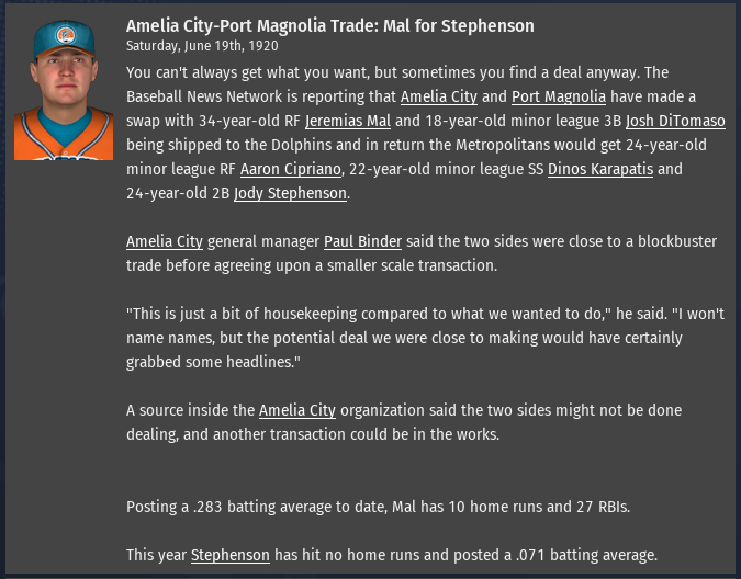 Trade season is upon us as Amelia City and Port Magnolia are the first to break the ice. The big ticket is 34 year old RF Jeremias Mal, who can provide a very solid contribution off the bench with the bat. He's posted a 156 OPS+ over 118 plate appearances this season for the Metros so could prove a useful addition for the Dolphins as they look to turn the season around. The Metros get nothing back aside from some future promise. ![]() June 21, 1920 The All-Star roster was announced and Whiskeytown catcher Joel de Vries was announced as the player with the most votes -- with 254,159 to his name. ![]() Unfortunately the day came with bad news for his fans. He hadn't made an appearance on a field since he was hit by a pitch that shattered his hand in late May. It was confirmed that his recovery will be delayed for another two months. If we're lucky then we'll get to see De Vries in a cameo performance at the end of the season. The Ducks are 15.5 games out of the division and 9 games out of a wildcard spot. Their playoff hopes are floundering. But anyway, your 1920 All-Stars everyone. ![]() ![]() June 22, 1920 Northlands RF Jon Jackson wins the HR Derby! ![]() June 23, 1920 The West is the best! They take the slim victory at Sugar Factory Grounds. ![]() Here's where the standings sit at all the break.