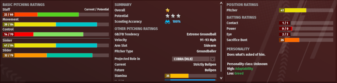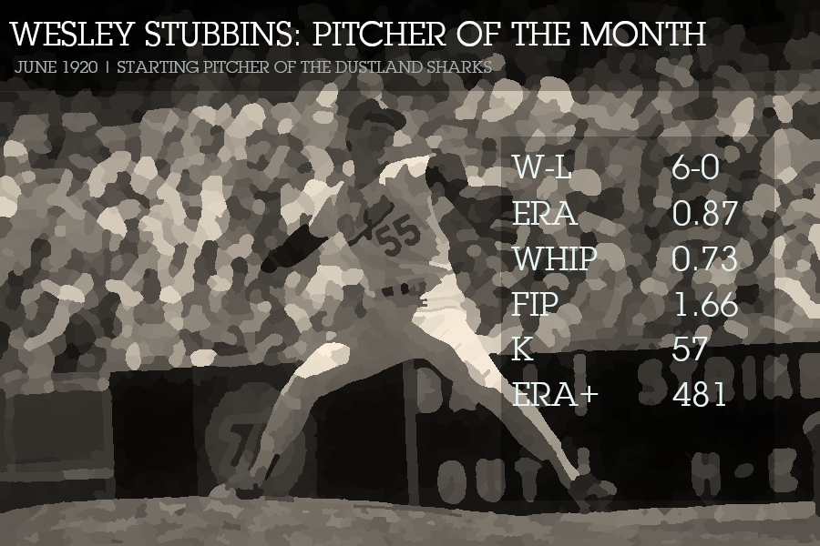 ![]() Finally, a non-catcher gets the award! Bendig has been top of the home run charts all season so no surprise to see him get the award after he stepped his game up in June. It was the simple things that have made the difference, converting a few strikeouts into singles has seen him take his season OPS from .900 up above 1.000. ![]() For the third month in a row, a Dustland Sharks pitcher takes this award. He's been content to play second-fiddle to Jaxon Darnall this season but he really stepped on the balls in June. He halved his home run rate, took his walk rate down a third, and got a 20% increase in his strikeouts. The result is that over 52 innings of work, he only gave up 5 earned runs. At 5'5" and 150lbs, Stubbins is the smallest player in the league but he certainly made some big noise this month.