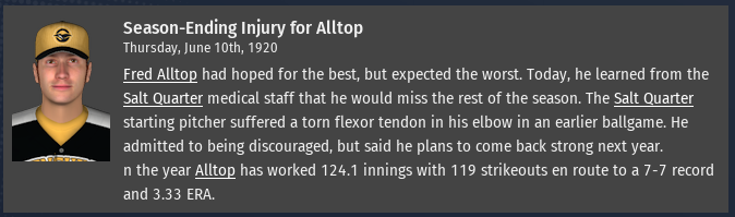 Unicorn Point's playoff hopes were dashed a tad when baseball's highest paid player 3B Dennis Sullenger confirmed he'll miss the rest of the season. ![]() The Unicorns are currently 2.5 games outside the West Division title and occupy a wildcard spot. His replacement, Benjamin Gannaway isn't too bad. About equal defensively, and has been tearing it up in the minors. We'll see if that can translate to the big dance though. June 10, 1920 Another casualty in the West Division today as Salt Quarter's #2 starter Fred Alltop confirmed to miss the rest of the season. ![]() The Penguins, like the Unicorns above are 3.5 games outside the division title and fighting for the wildcard spot. June 11, 1920 In what would have been Alltop's day to start. The Penguins rallied and took down the East Division leader in a thriller. They needed a massive contribution from Right Fielder Mickey Cromwell to do it though, and he delivered, going 5-6 with a home run and a double to help the Penguins take the Roosters to extras. The bottom of the 10th, saw lead-off LF Ernie Morris get a single, and then make the dash to third when Cromwell got his fifth hit of the night with a single out to the right field. It was looking like we might just be heading to the 11th when 1B McKenzie Bellows grounded into a double play leaving no one but Morris on base but that was a moment that closer Hank Reilly lost control. First pitch was a ball. Second pitch was a ball. Third pitch was just nowhere near the catcher. Morris trotted in for the walk-off wild pitch. ![]() June 13, 1920 The Roosters will then go on to smash the Penguins in the second game of the series but the final game will be completely starved of runs until the end when the Roosters finally got their batting going by the 11th. This time, a Salt Quarter wild pitch got the first run on the board with two other runs coming in soon after. Rooster pitcher Max Steel was an absolute man of steel that game, pitching all 11 innings and only giving up 2 hits and 2 walks while striking out 11. ![]() June 15, 1920 Zeke Reynolds at one point demanded he be traded from the Crimson Forest Falcons. Unhappy that he was playing a backup role and unhappy with the slackers that populated the Falcon clubhouse, he feared that he'll be spending his last baseball years with a useless organisation. He was never traded but he's still not happy so we might see some action closer to the trading deadline. But anyway, he got his sixth start off the season today and he celebrating by blasting three home runs into the crowd. For a total of four for the season. Anyway, the Unicorns still won. That's so Falcon. ![]() Here's where we stand at the end of June 15. One week out from the All-Star game.