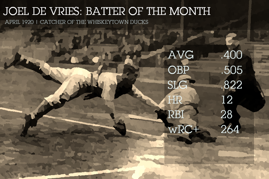 Whiskeytown Catcher Joel De Vries is have a cracker start to the season. Over 16 games this season, he's registered a hit in each. Including two home runs in this extra innings win over the Spice District Roosters. They were certainly timely home runs, coming in the 8th and 11th innings to get the Ducks over the line. ![]() April 17, 1920 This top of the table Ducks-Rooster series produces another banger. The Roosters went into the bottom of the 9th down 4-1 but they kept on chipping away at the pitcher. Until finally, with 2 outs on the board and the bases loaded. LF Odin Bendig hit a emphatic line drive to clear the bases and get the win for the Roosters. Unfortunately this game spelled an end to Joel de Vrie's hit streak which stands at 14 games. ![]() April 20, 1920 We very nearly had our first no-hitter of COBRA but Tijs Oudenkerk's efforts against the Salt Quarter Penguins was broken up in the 9th. ![]() April 22, 1920 Word has it, that Liam Schmitt provoked the fight by just repeating back Jody's Stephenson's statistics. "He boasts an OBP of .188" Ouch. ![]() ![]() Standings at the end of April 22, 1920. There's a three way tie in the East Division and the Saffron Turtles continue to hold on to their narrow lead in the West. The Turtles are 5-0 at the moment in extra-innings games. Whiskeytown CF Thad Pardue has proven himself a effective base stealer. Over the first 22 games, he's stolen 12 bases -- twice as many as anyone else!