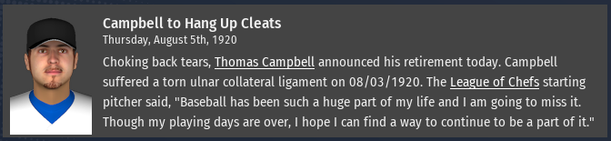 Thomas Campbell, #5 pick in the draft by the Hadestown Broncos just one month ago has announced his retirement from the game after a horrific injury in just his fourth minor league game. The pitcher was a risky pick for the Broncos. The High Schooler had spent most of his high school career injured and received a lot of criticism for the pick. ![]() August 7, 1920 We're officially one month from the end of the regular season and the number crunchers have figured that the Spice District Roosters, Dustland Sharks, and Sugar Factory Elephants are locks for the playoffs. That leaves only one spot left to fill with the Saffron Turtles in the driving seat there. ![]() August 8, 1920 Common sense knew this a long time ago but mathematics confirmed it today after a 4-2 loss to the Whiskeytown Ducks: the Crimson Forest Falcons will not be in the playoffs this season. ![]() The Falcons started the season off 0-9 and never really got any better. Their dirty laundry was aired publicly when 1B Zeke Reynolds demanded a trade and accused the team of fostering slackers. He was eventually traded to the Dustland Sharks where he has flourished (in his first series back against his former side, Reynolds hit a home run in each game as the Sharks swept the Falcons) Right Fielder Jonathan Palka was often a lone beacon for the side. The only player with a OPS+ over 100. He hit .313/.393/.516 with 18 home runs -- often for a losing effort. Other players of note included two players gunning for the 20/20 club: LF Augie Hanson and 1B Gaby Williams who also provided some good defense. On the pitching side, there's literally nothing good to talk about. Preseason predictions put them at 60-84, they'd need to get 25-3 for the rest of the season just to meet that. RIP Falcons. August 10, 1920 Shawn Marsh and the Salt Quarter Penguins make an absolute statement against the Saffron Turtles with Marsh decimating the batting lineup with a no-hitter. As the playoff race heats up, the Penguins move ever so closer to the wildcard spot held by the Turtles. Marsh was so good, only one early walk prevented this from being a perfect game. ![]() ![]() August 11, 1920 The woes of the Turtles continue when they took on the Unicorns. The bats simply had no answer to Tijs Oudenkerk who threw a complete game shutout with just one hit and 17 K's. It was exactly one month ago today that Oudenkerk pitched a 17K game against the Turtles. He certainly has their number. ![]() Here's where the standings sit. The battle is on for the last wildcard spot. ![]()
